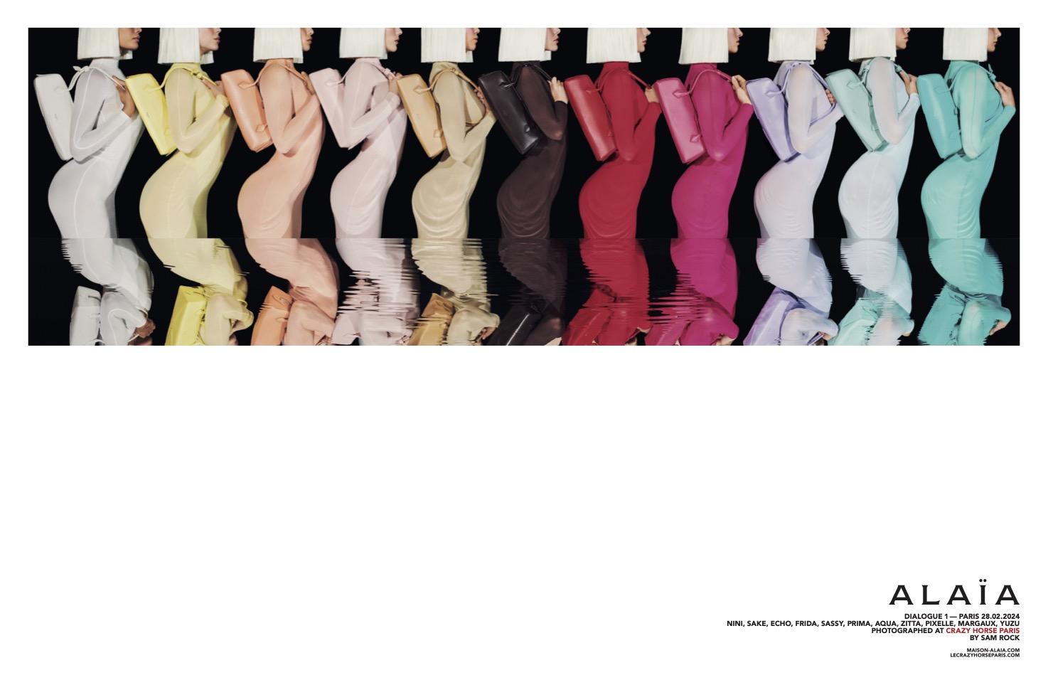 Photographed by Sam Rock, the Alaïa woman takes center stage as 11 Crazy Horse dancers grace the cabaret runway draped in signature body-sculpting knit dresses in a kaleidoscope of colors. With the iconic Teckel bag completing each look, it’s a breath-taking celebration of the infinite possibilities of Alaïa’s craftsmanship.