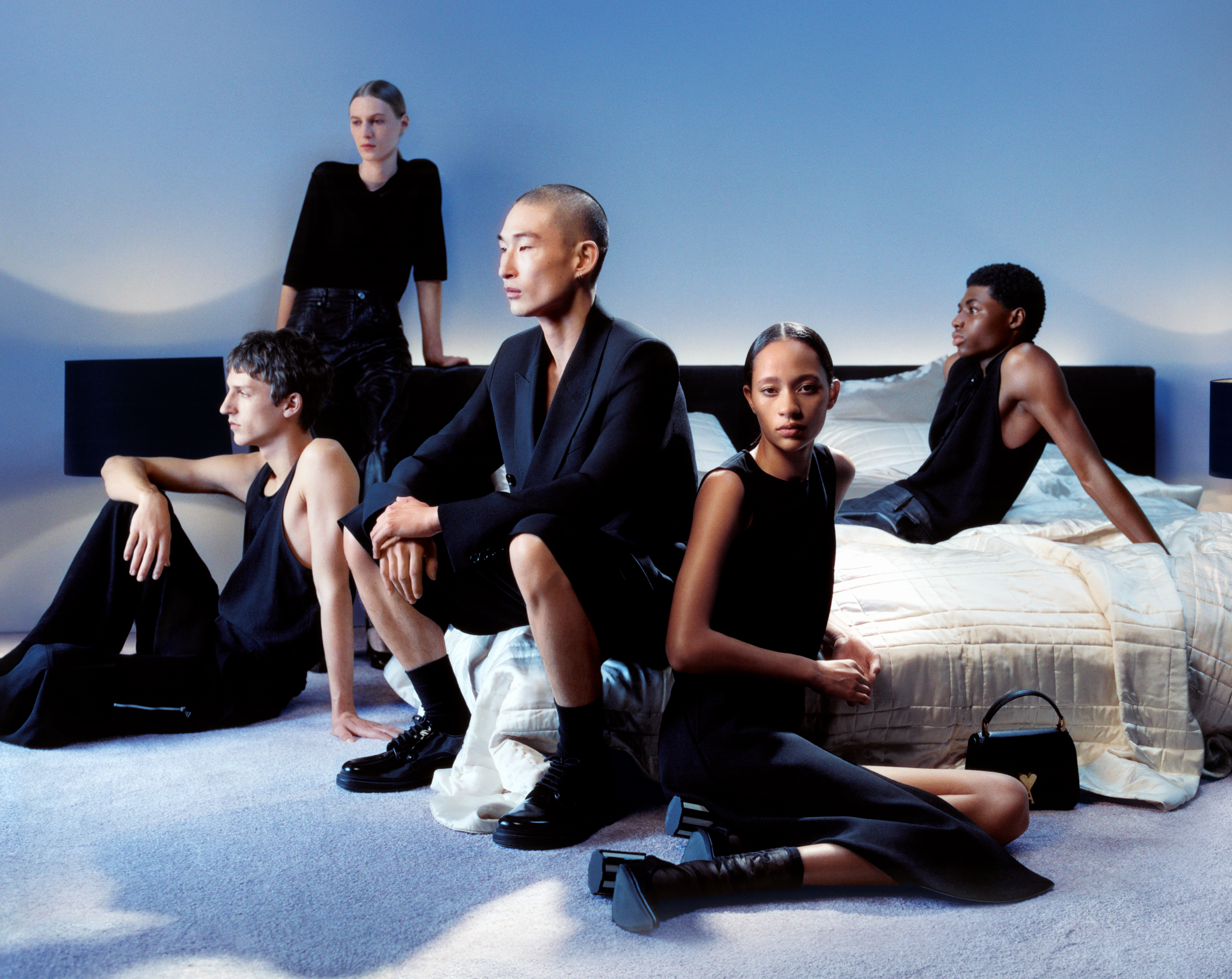 Featuring a constellation of modeling’s brightest stars, including Julia Nobis, Selena Forrest, Apolline Rocco Fohrer, Saul Symon, Sang Woo Kim, and Zaram Obasi, the campaign is a celebration of individuality and collective spirit. Their solemn expressions are counterbalanced by the undeniable connection they share, a silent storytelling that’s as impactful as the clothing they don.