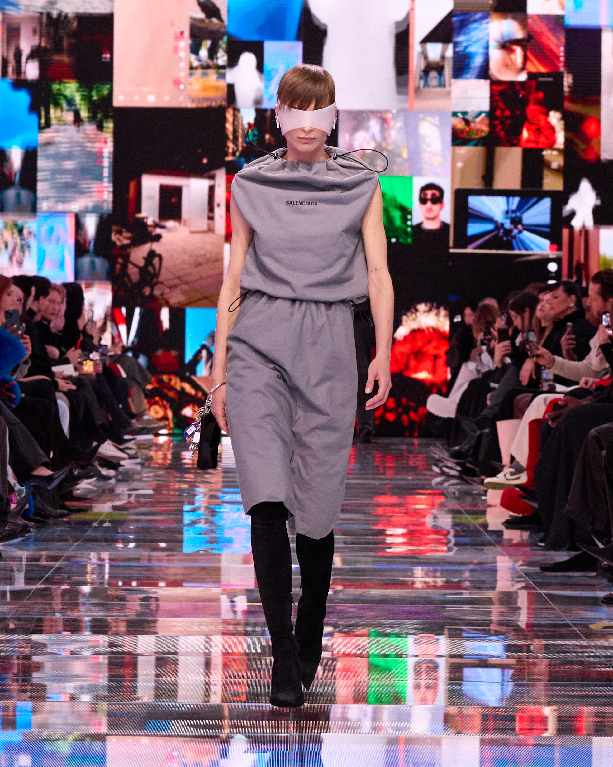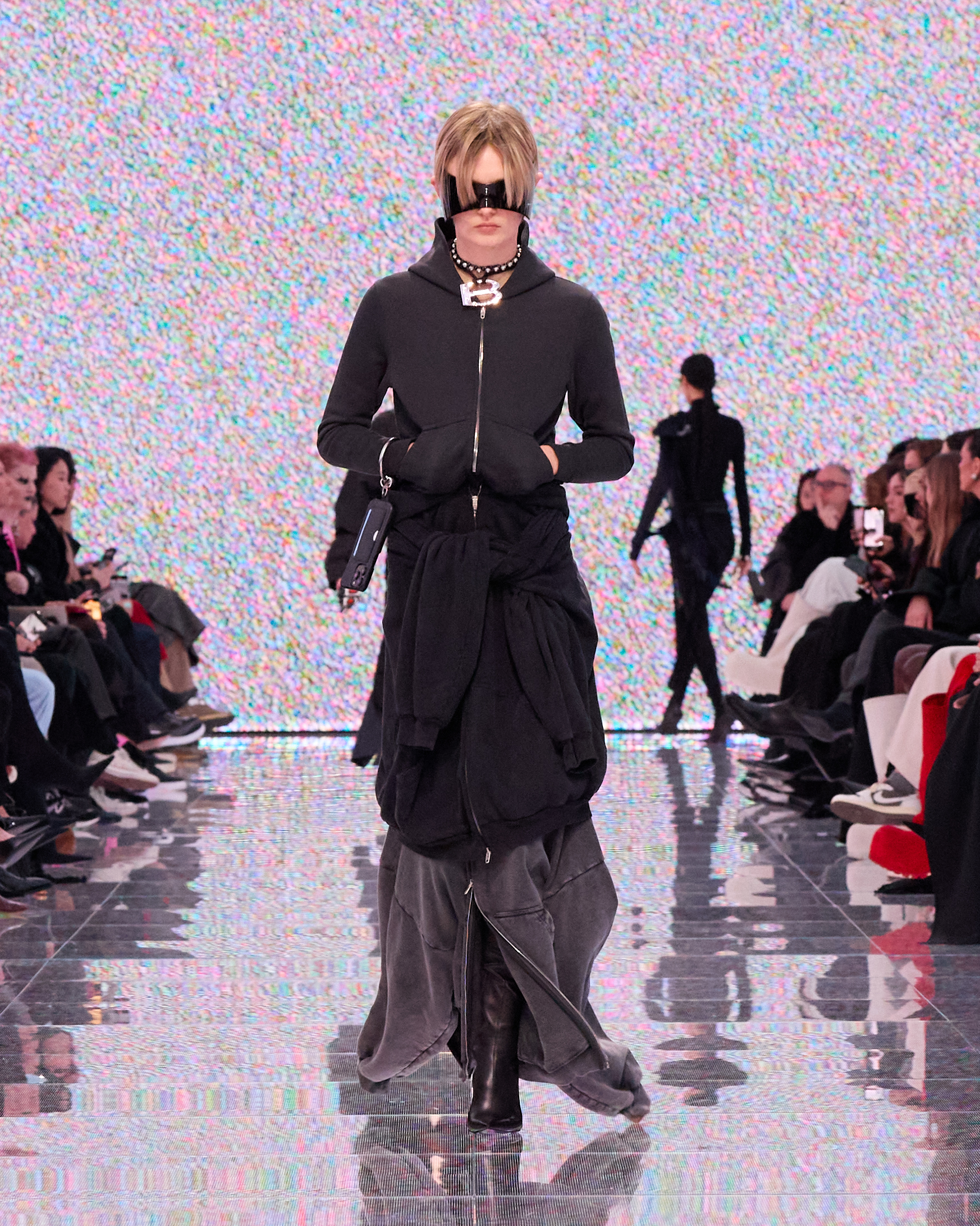 In a nod to the brand’s innovative and environmentally conscious approach, Balenciaga dust bags, backpacks, and nylon gym bags were upcycled into tops, skirts, and dresses, showcasing the Maison’s commitment to sustainability. The collection also featured a series of “1 Minute Designs,” where various clothing items, in a playful yet masterful fashion, were thrown together to create new, unified garments, such as a dress made from three hoodies, the lowermost inverted to create a mermaid tail silhouette.