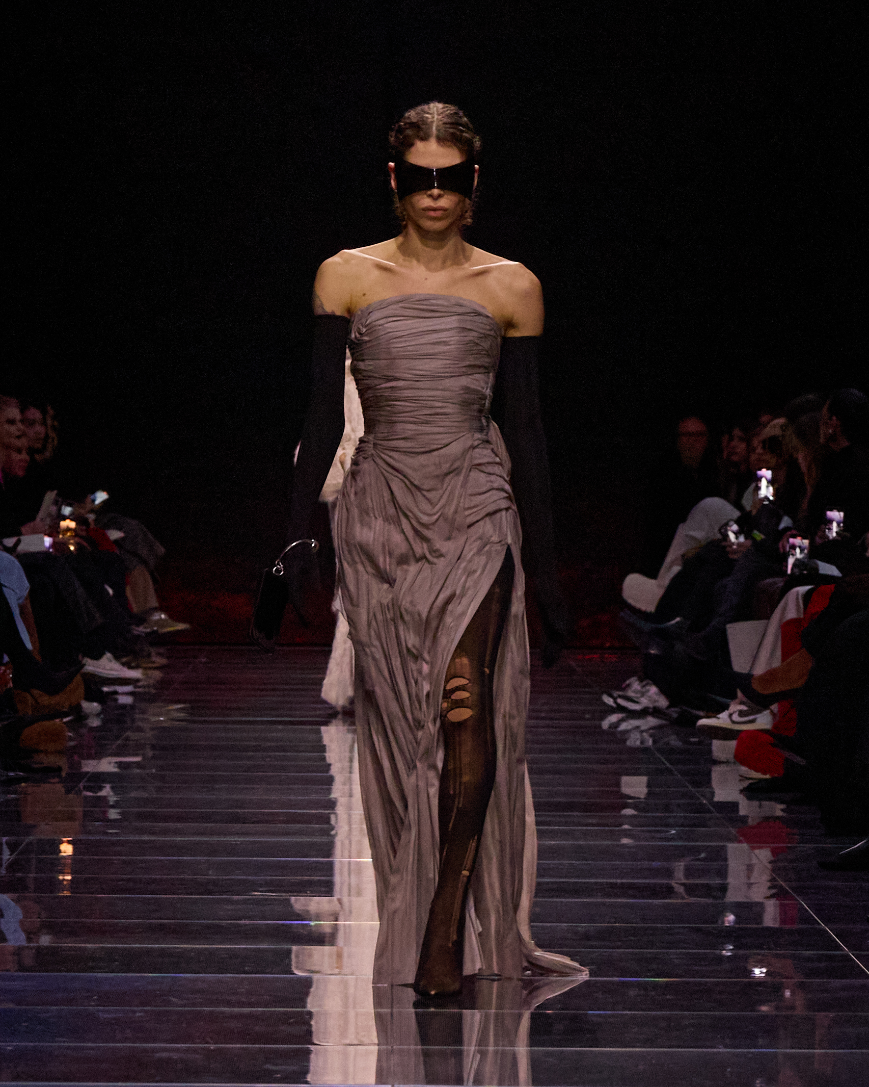 The narrative wove through the “frozen drape” dresses, where each fold captured a sense of suspended animation, and “suspended garment” dresses pieced together from a variety of repurposed wardrobe staples. New suits, zip-up hooded jackets with matching pants, and leather-lined outerwear paraded down, while Vareuse tops — inspired by an original Cristóbal piece — turned inverted trousers into high fashion. Parkas were elongated, serving as statement coats, and multi-waistband pants introduced a fresh perspective on structure and form.