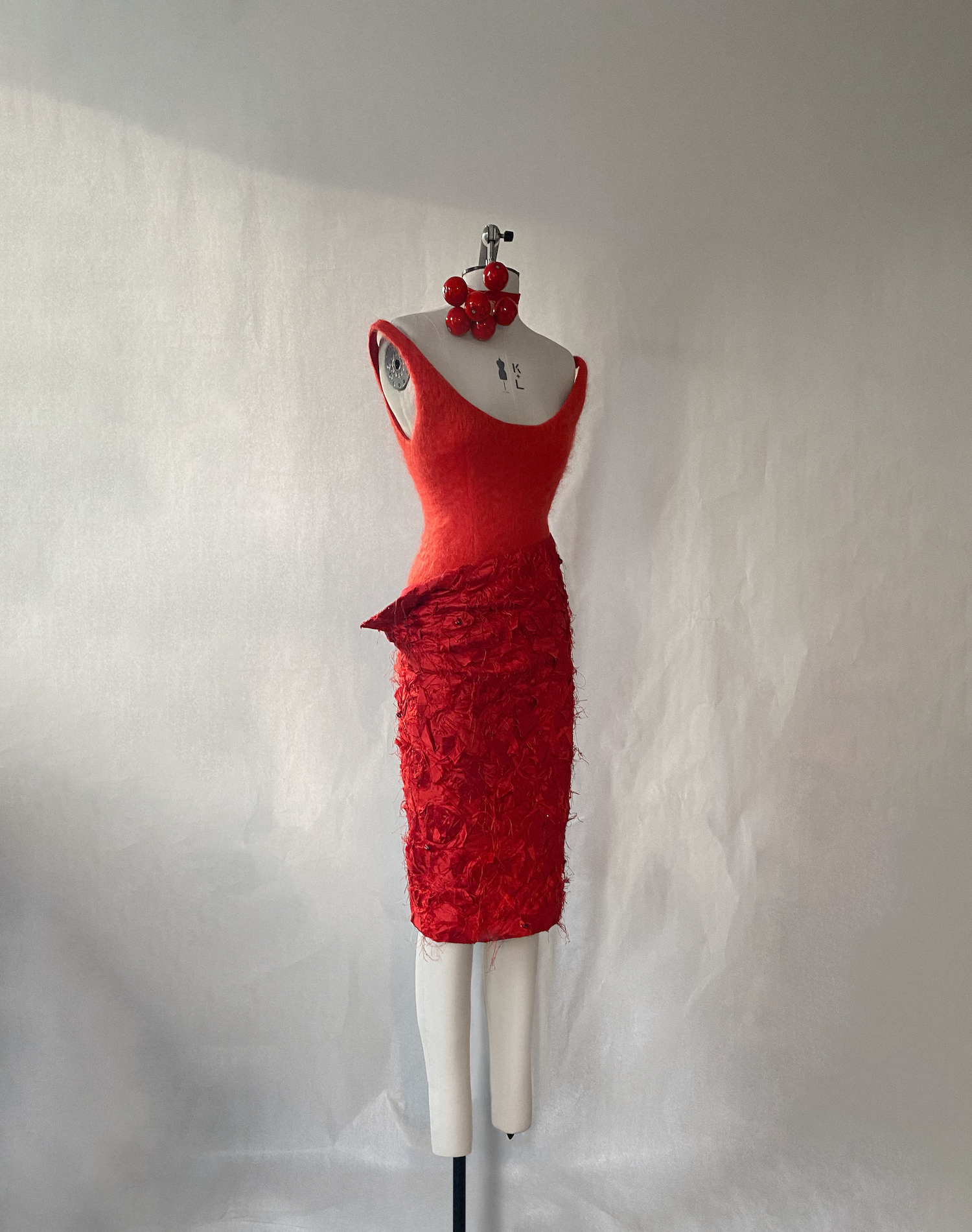 O’Grady is constantly looking to the past for inspiration. As a child, he created early designs based on old Hollywood silhouettes, which may be the root of this backward-looking instinct. Over time, his references have reached even further back to the Victorian and Tudor eras. He frequently picks up old “bits and bobs” from antique shops—deadstock fabrics and beads that have come apart from things like “a fifties garment that has fallen apart.” For him, it’s about “continuing [the item’s] life cycle.”