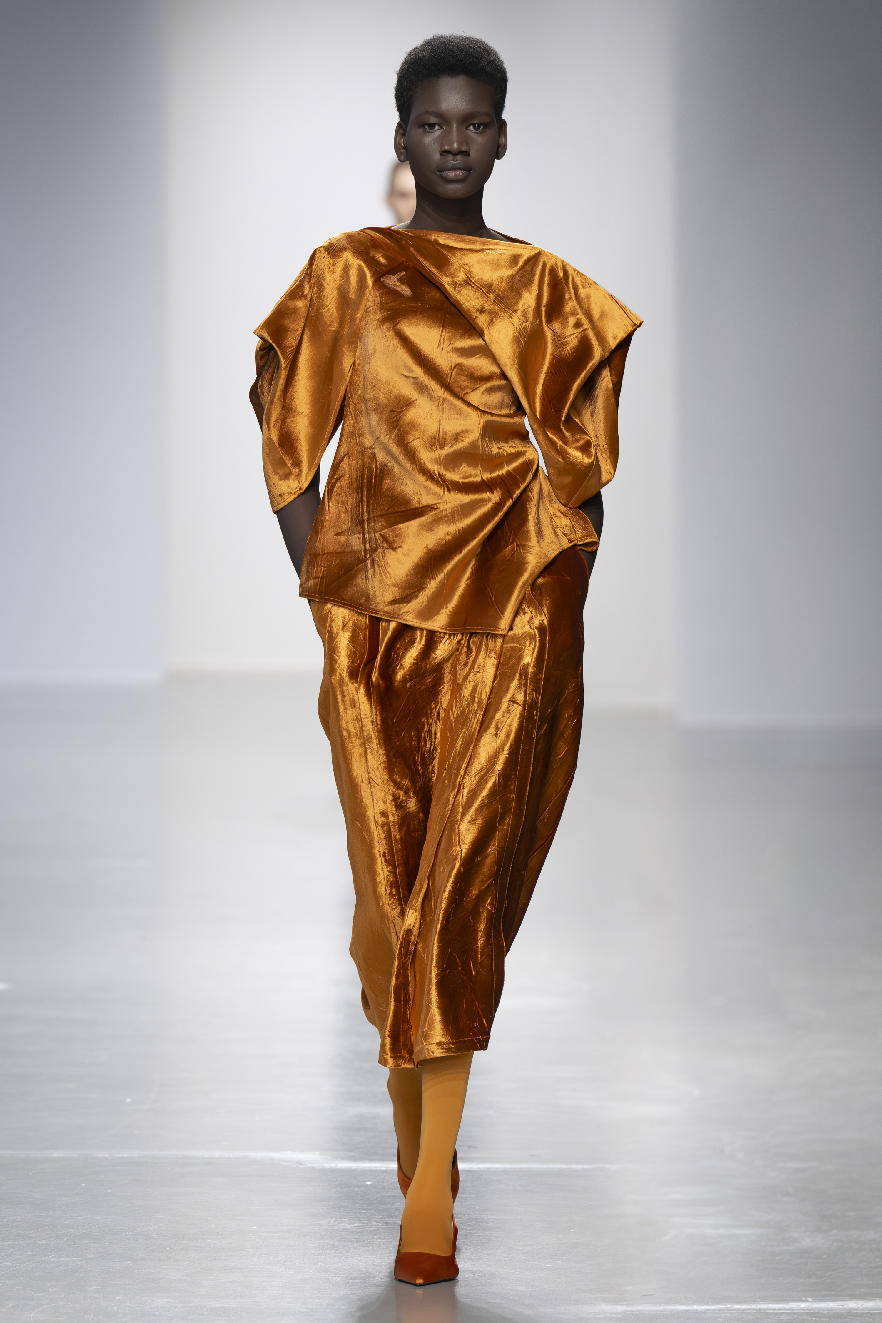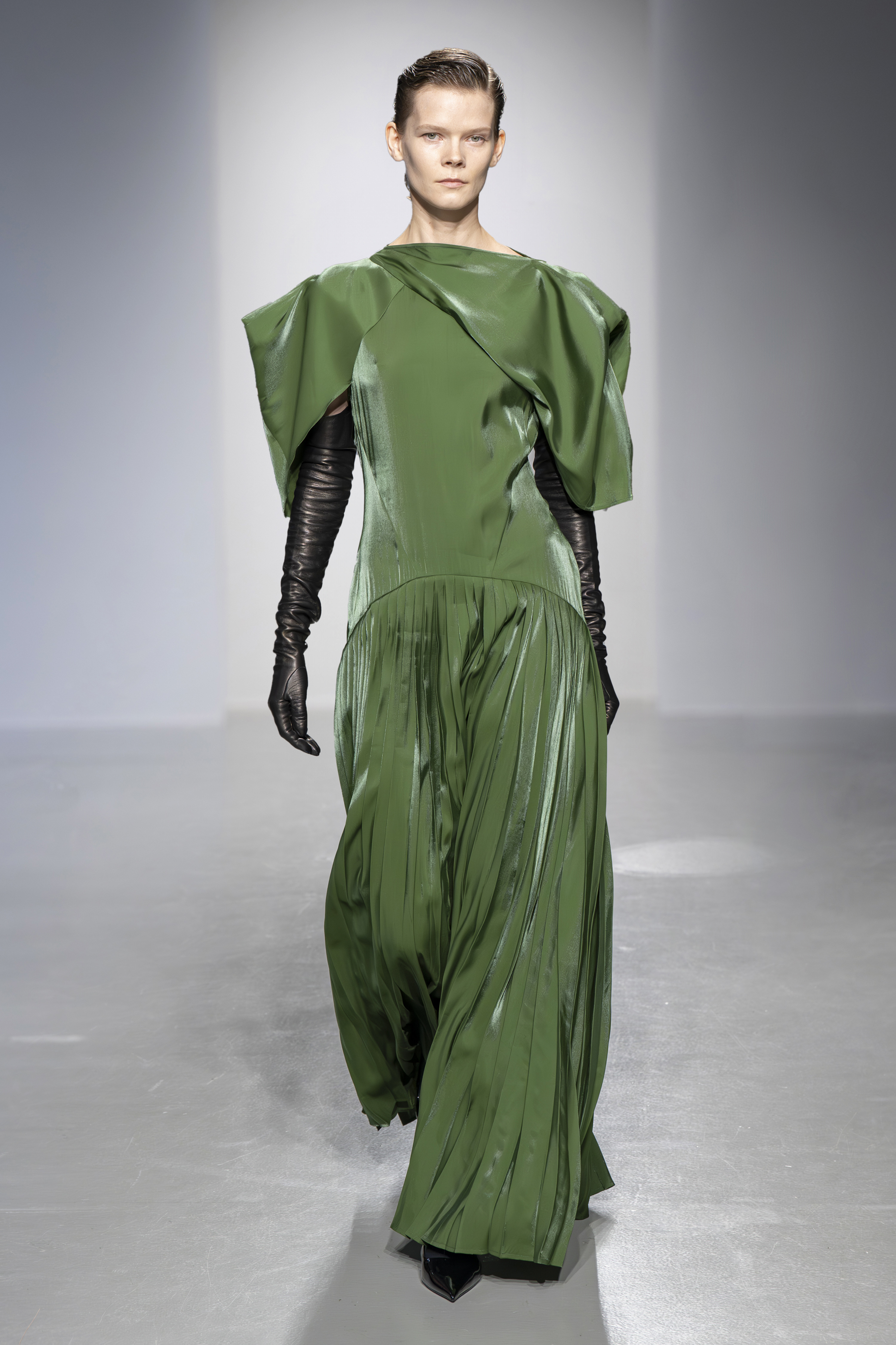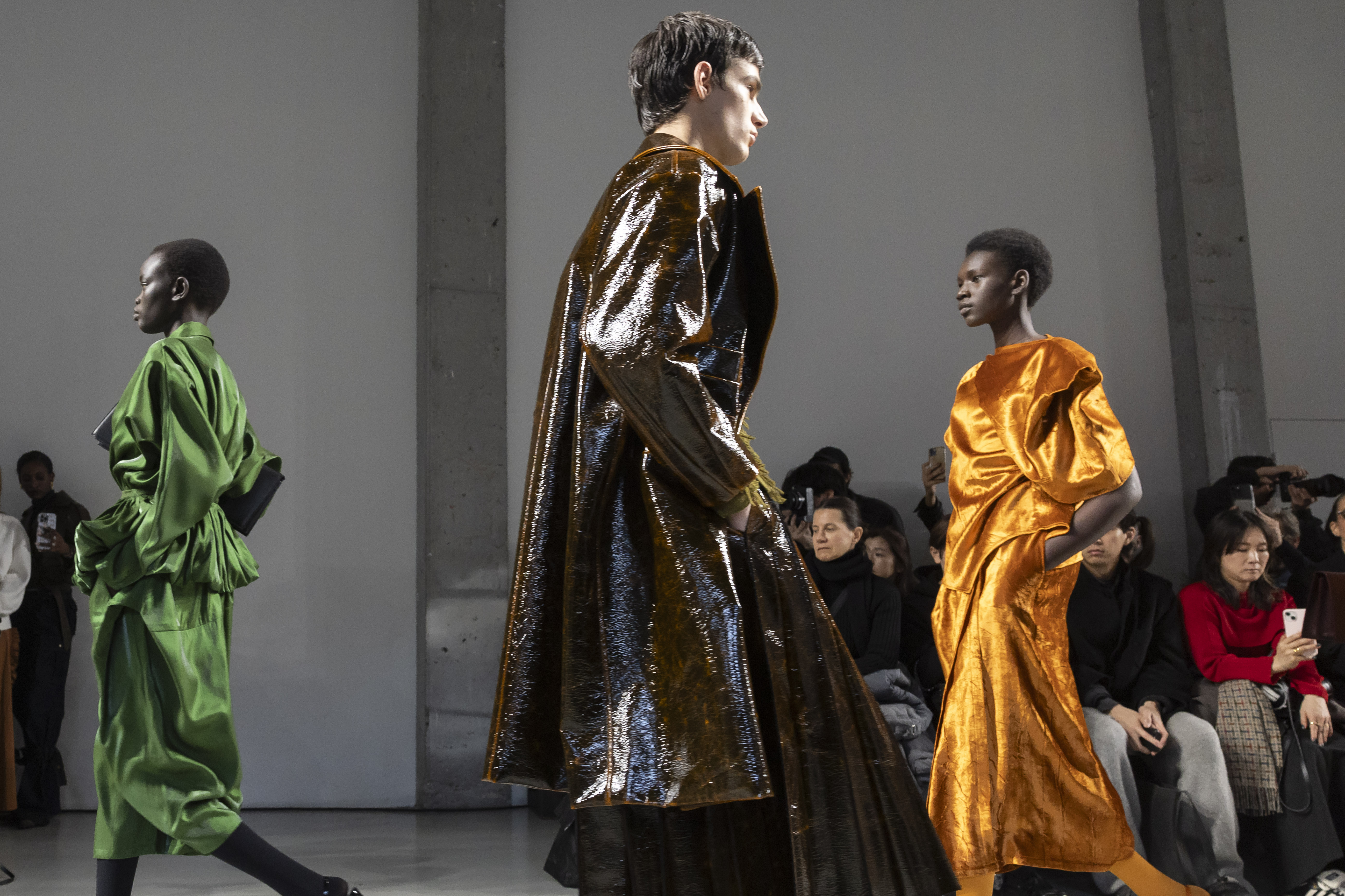 Captivating yet inaccessible to those outside of an inner circle, perhaps like the art that she is viewing, she is complex with an air of refined mystery. While from different eras, she is kindred spirits with another of this season’s protagonists, a Parisian girl of the 1950s who sweeps through the streets of the Rive Droite with the effortless grace of the aristocracy. She moves in subtleties, as iridescent and ephemeral-seeming as the shimmering orange velvet and emerald silk that advanced down the runway in voluminous geometric form. Seeking to leave no trace, she nonetheless makes an indelible impression on everyone she interacts with.