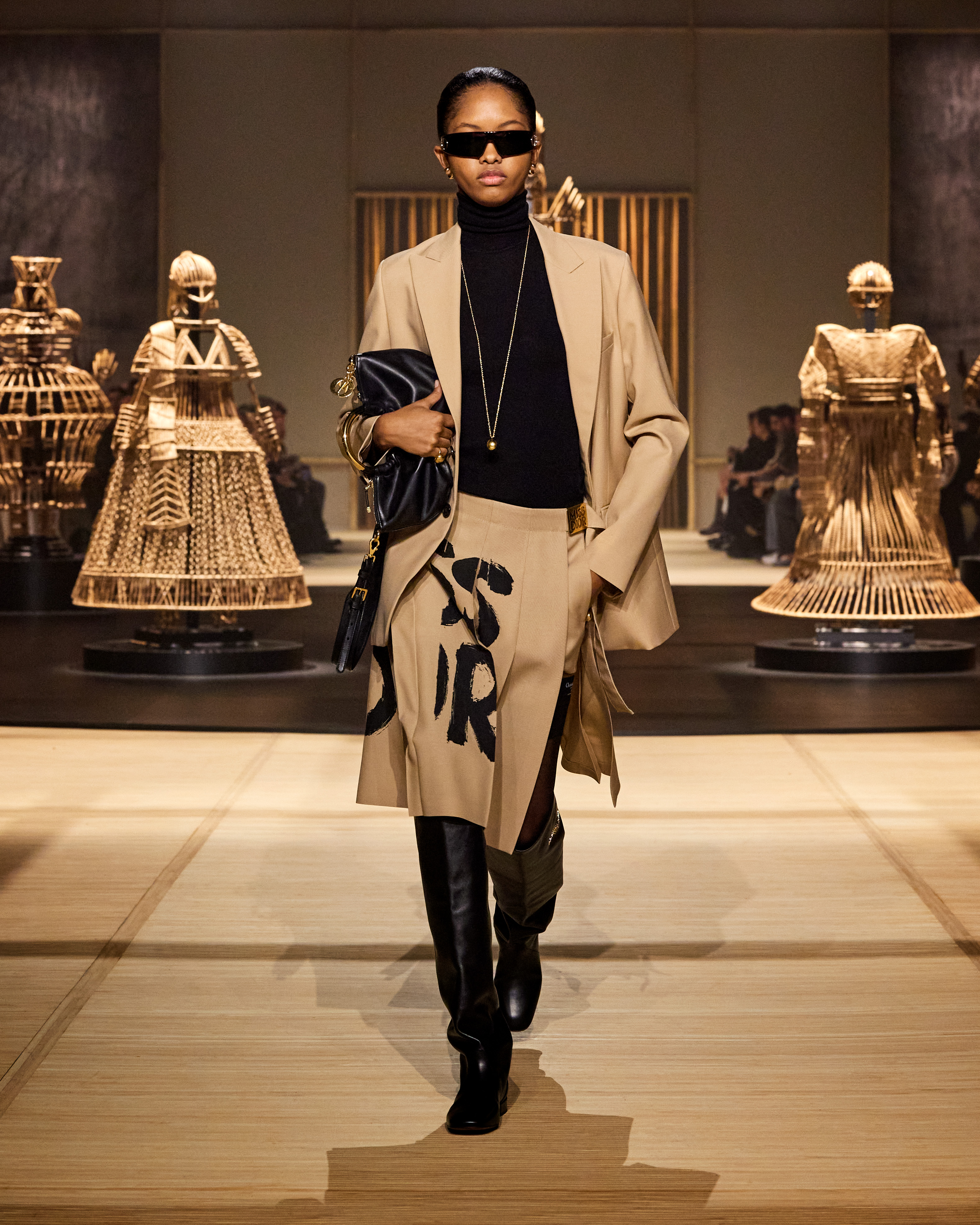 Maria Grazia Chiuri elevates beige to a pivotal element within the collection—a canvas extolling the profound elegance of minimalist design and a tribute to Dior’s enduring sophistication. This nuanced palette, serene yet statement-making, serves as a canvas, celebrating the profound elegance of minimalist design—a testament to Dior’s enduring sophistication.