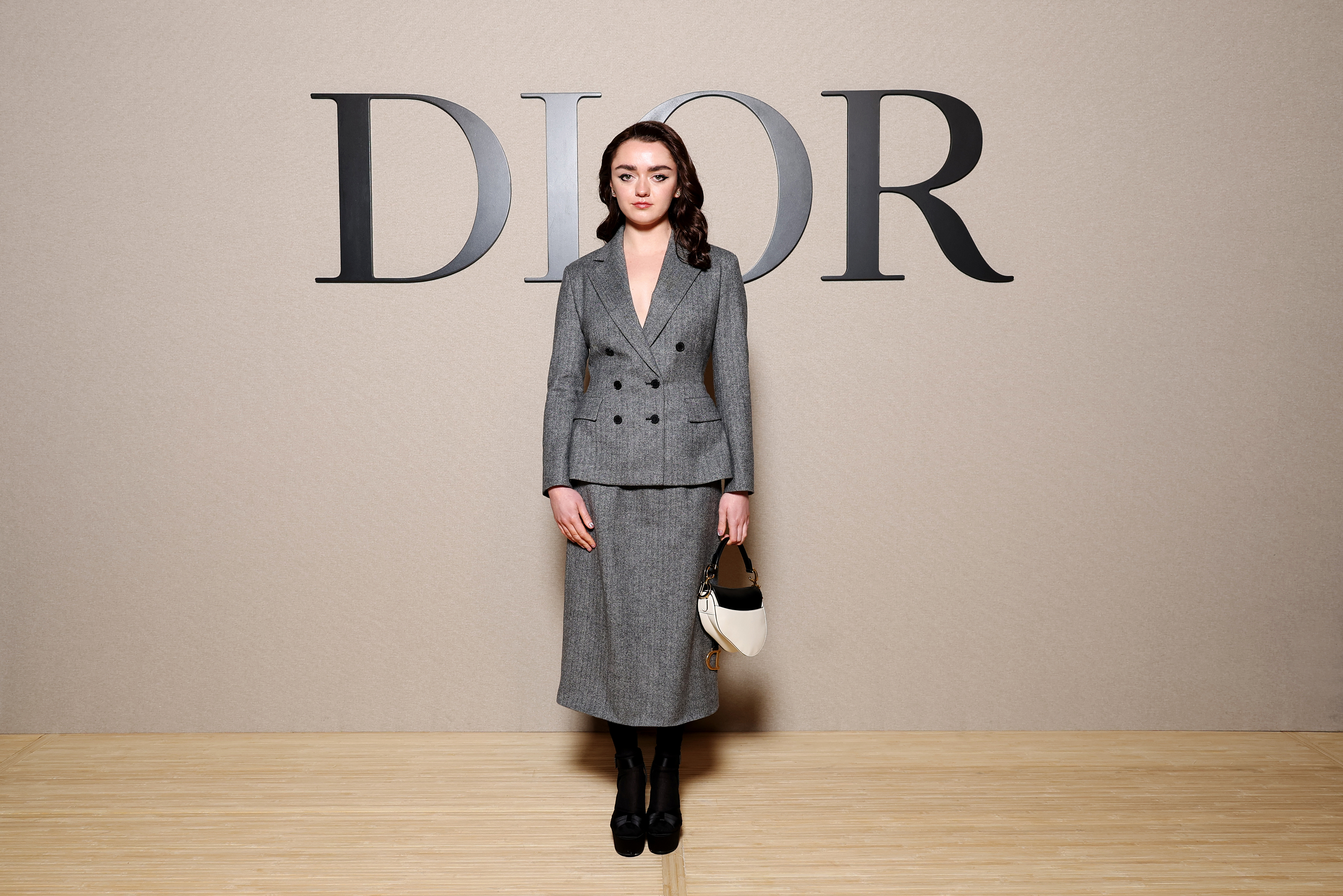Maisie Williams channels understated elegance at the Christian Dior show, her grey double-breasted suit blending classic tailoring with a contemporary edge, complemented by a contrasting black turtleneck and refined accessories. (Photo by Pascal Le Segretain/Getty Images for Christian Dior)