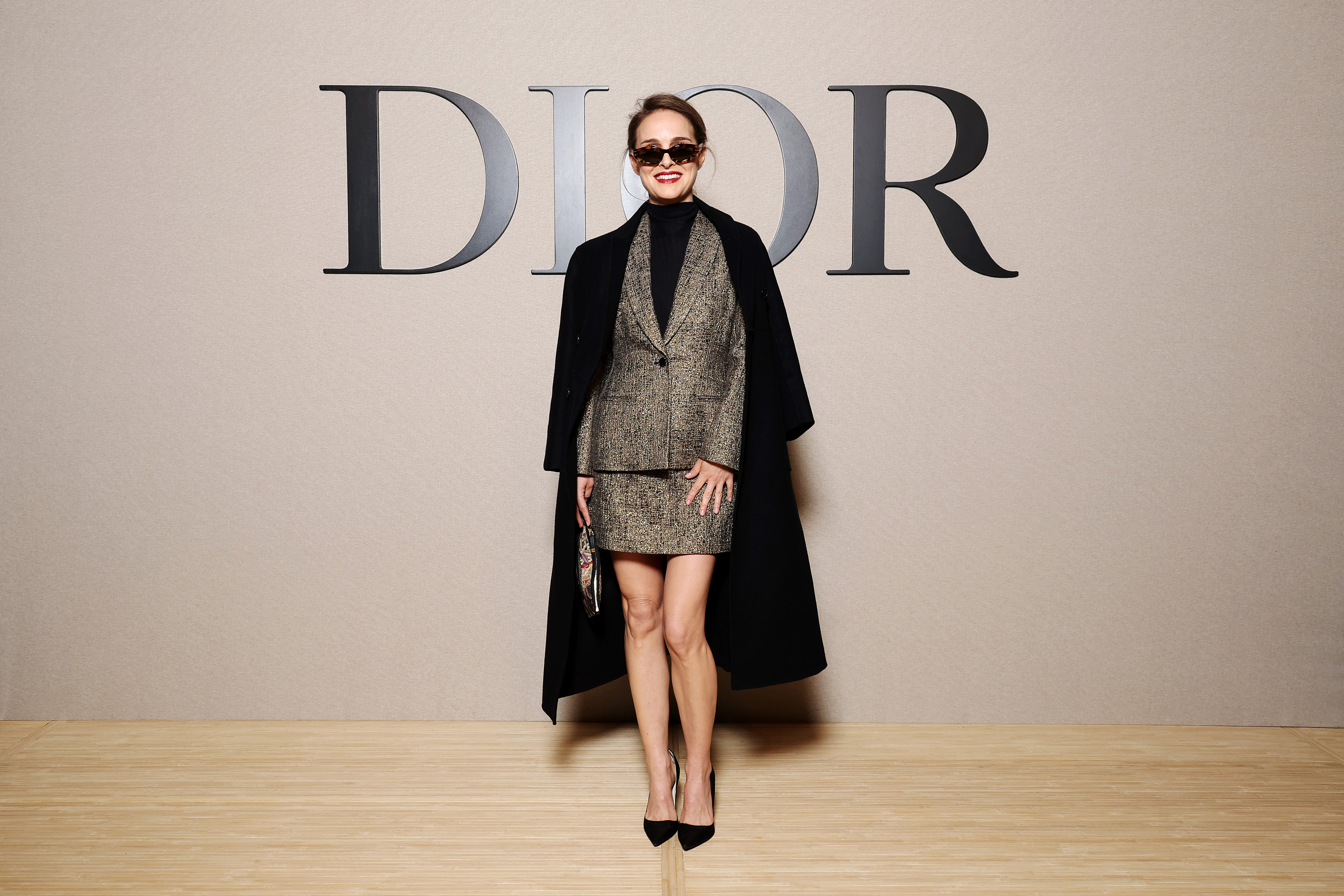 Natalie Portman is the epitome of understated grace at the Christian Dior show, her silhouette elegantly framed in a tweed ensemble with a classic black overcoat and heels, encapsulating the collection’s minimalist ethos. (Photo by Pascal Le Segretain/Getty Images for Christian Dior)
