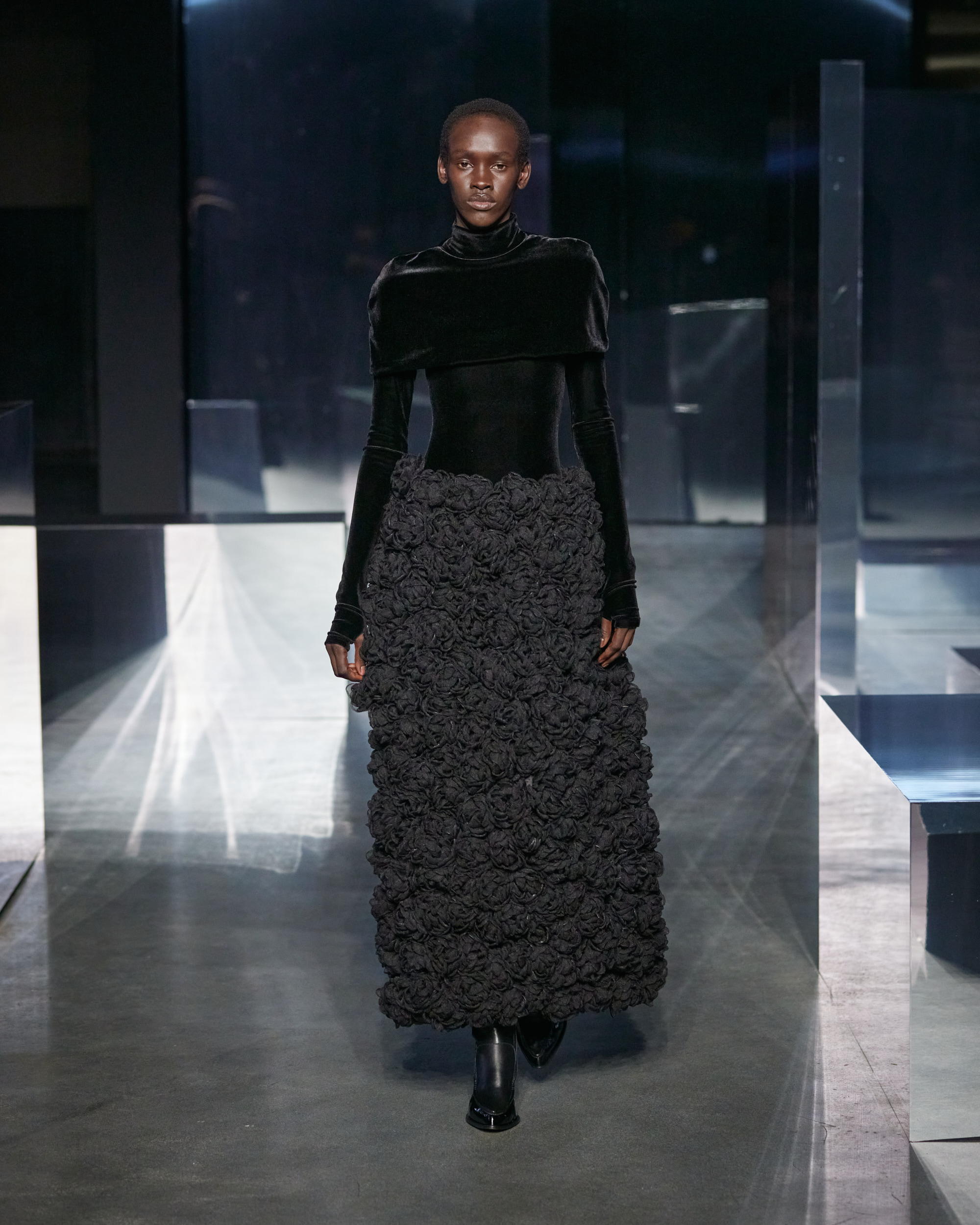 The choice to anchor the collection in a stark black and cream palette emphasizes the textural play and silhouette experimentation, allowing the detailed craftsmanship to stand at the forefront. This monochromatic scheme serves as a canvas, bringing the intricate detailing and fabric manipulation into sharp focus.