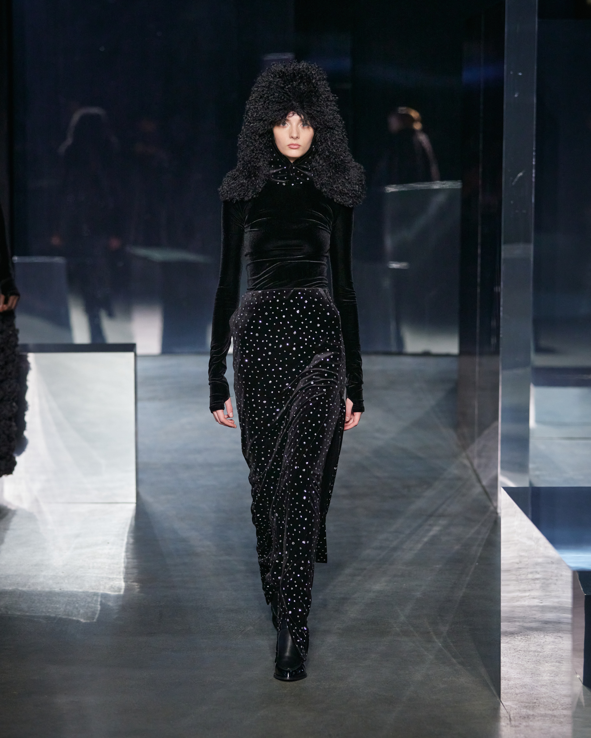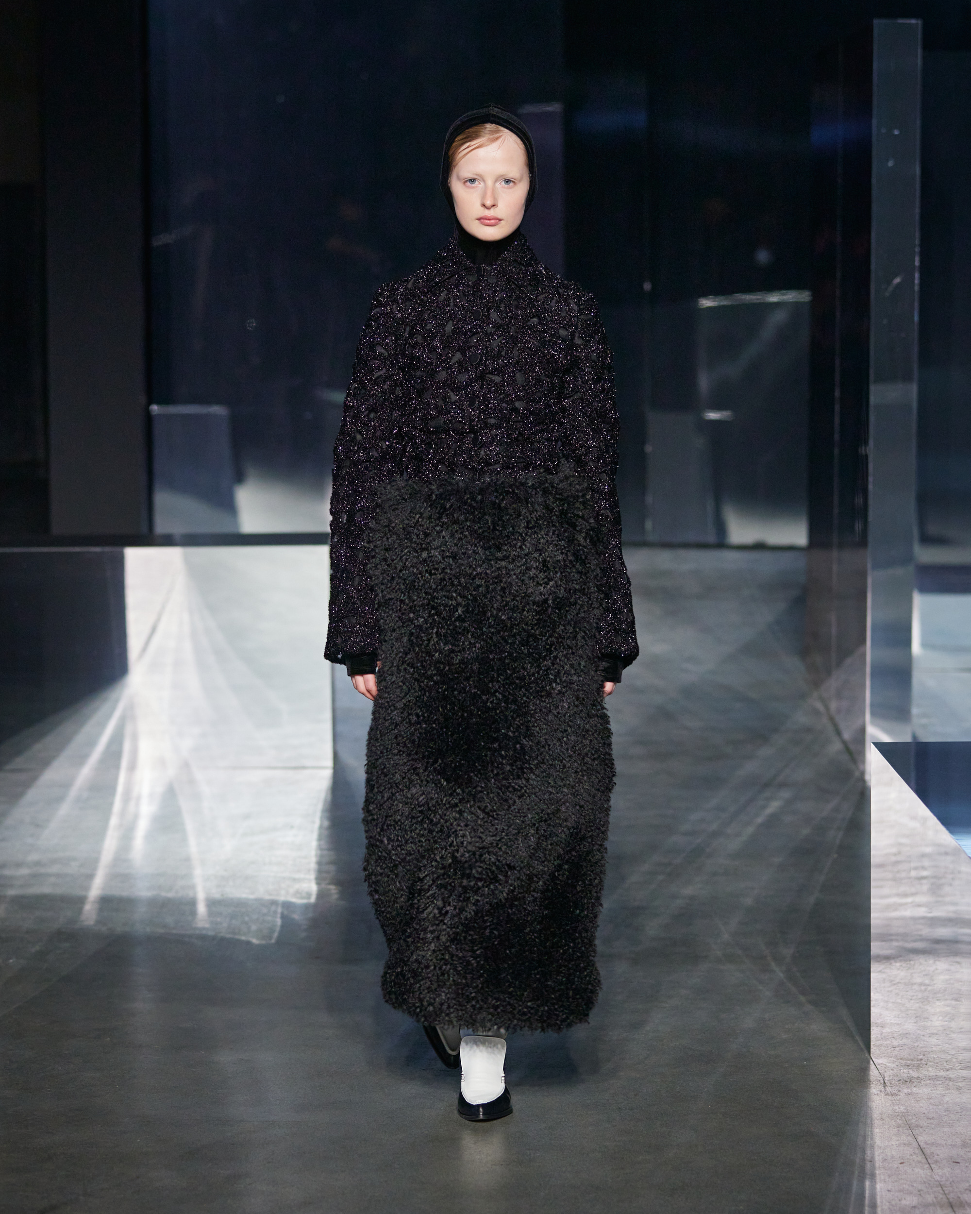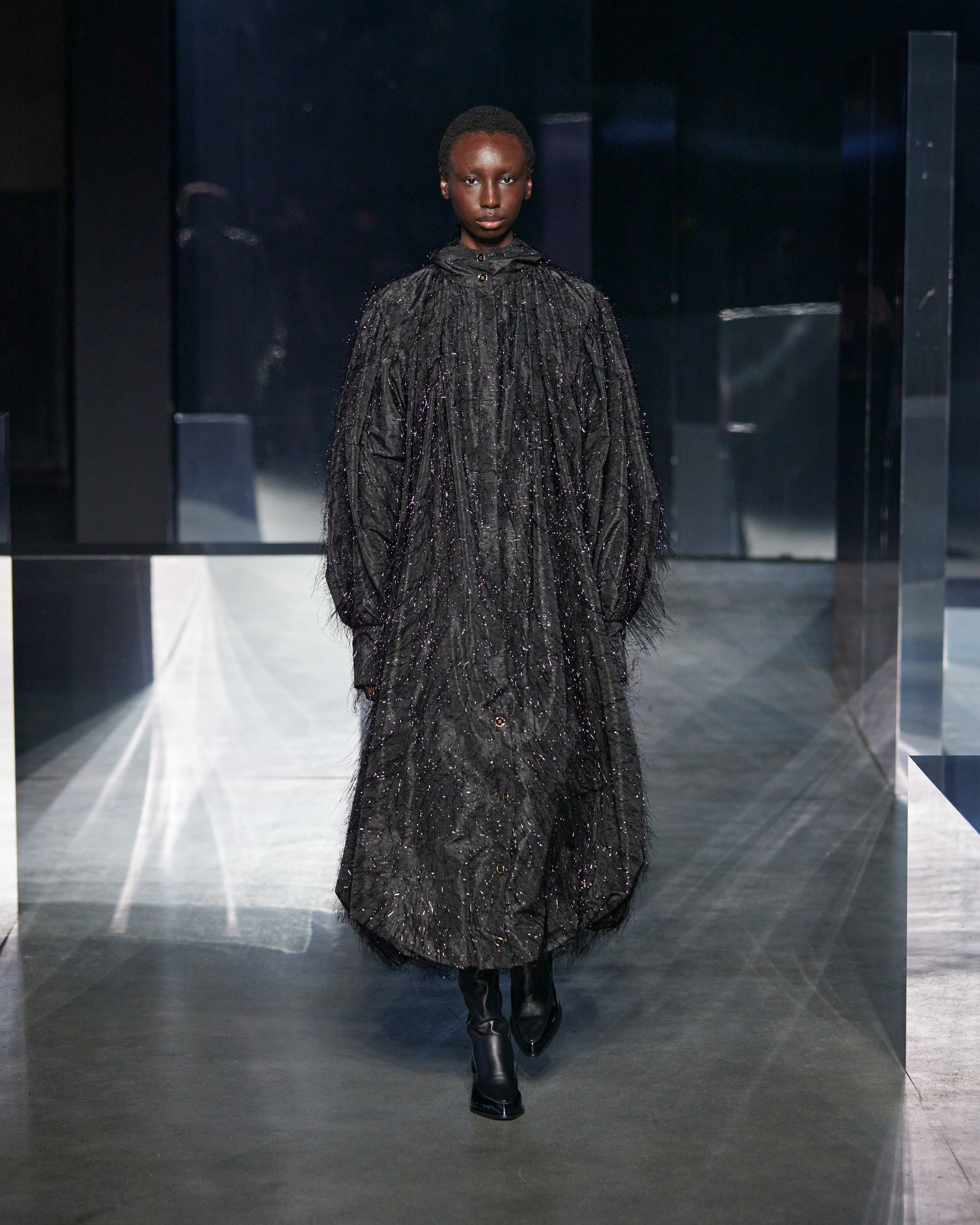 Examining the runway images attached, EENK’s AW24 collection materializes as a bold statement of avant-garde fashion. The tufted and clumped textures of the overcoats create a striking presence, enveloping the models in silhouettes that defy convention. The gauzy composition of the coats and the interplay of light and shadow on the organza roses exemplify the brand’s philosophical reflection on zero as a state of ‘everything-ness’.