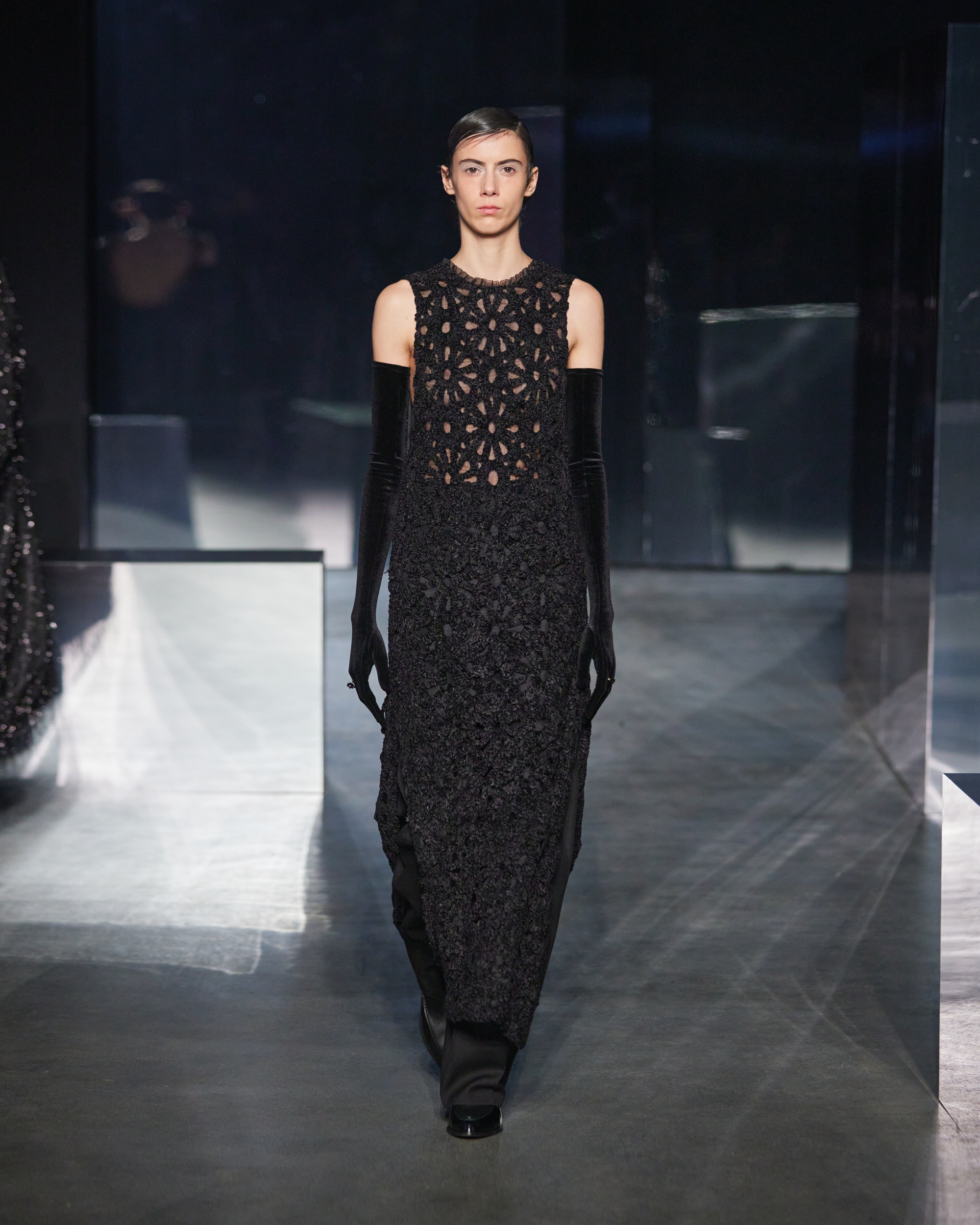 A notable cocoon coat, with its ethereal weave, and a skirt adorned with three-dimensional organza roses, showcased EENK’s craftsmanship. With metallic fibres adding a subtle sheen to a brushed coat, and crystalline speckles on sleek silhouettes, the garments echoed the celestial grandeur of a starry night, conjuring the boundlessness of the cosmos.