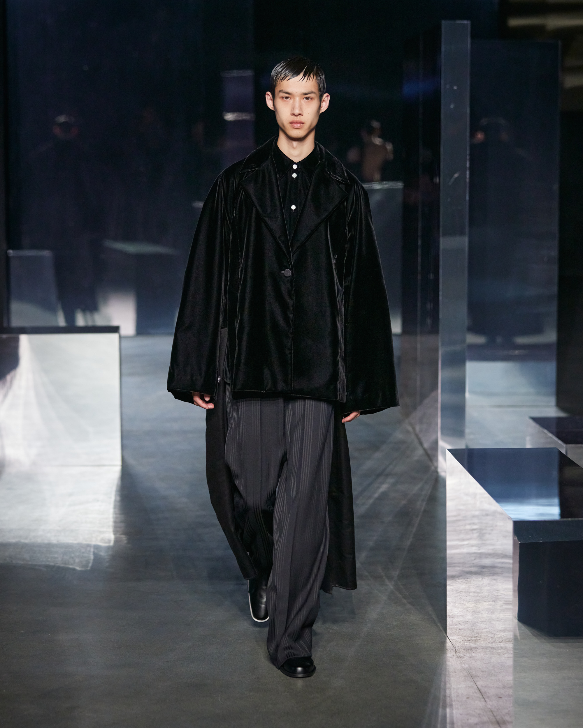 The collection played with voluminous shapes, where garments such as bishop-sleeved coats and satin skirts took on a ‘0’ shape, embracing the full circle narrative of the ‘Letter Project’. This exploration of form mirrors the conceptual dialogue between ‘zero’ and ‘one’, manifesting in pieces that resonate with EENK’s design philosophy.