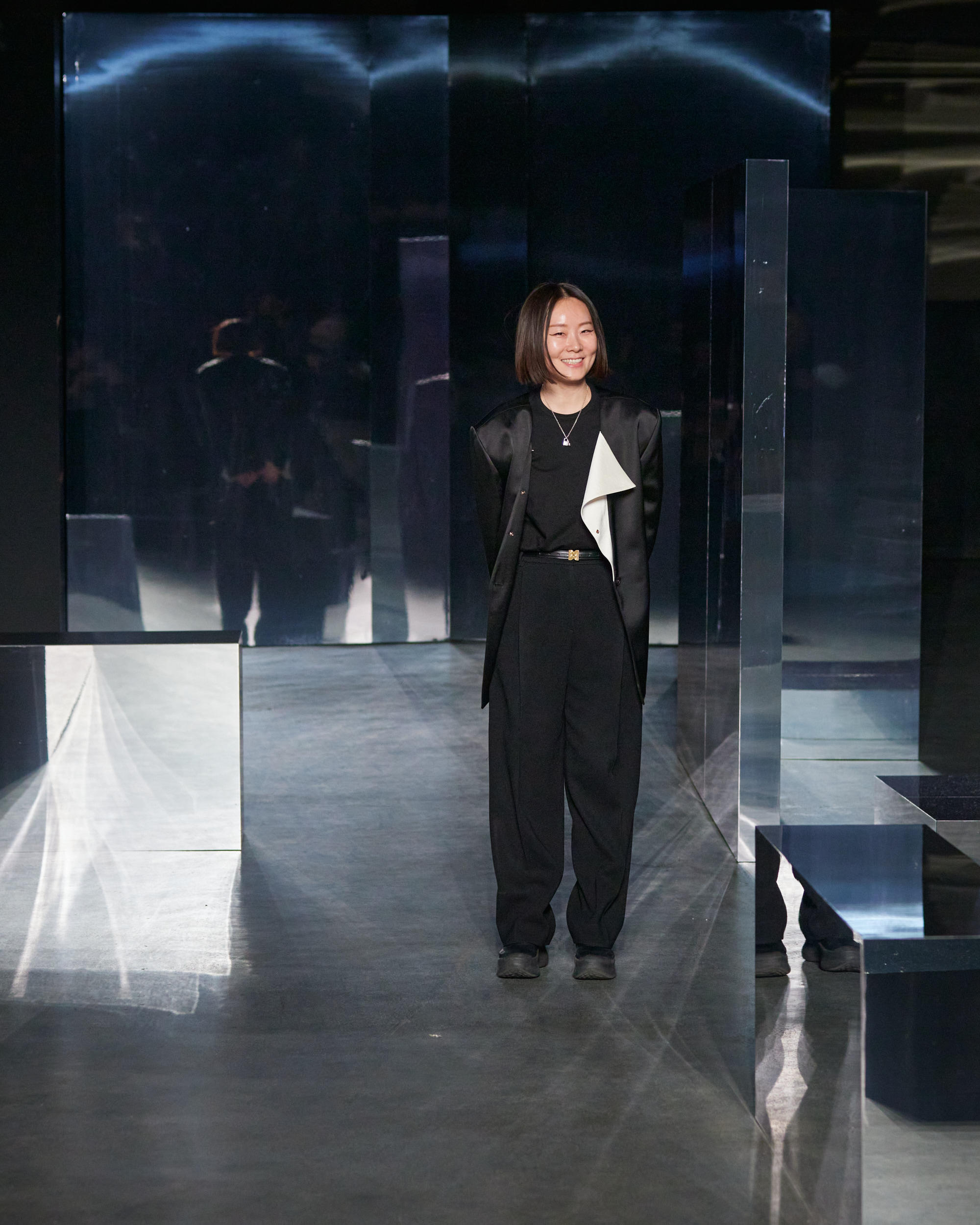 Hyemee Lee, the creative force of EENK, graces the runway, showcasing the minimalist elegance of her AW24 collection.