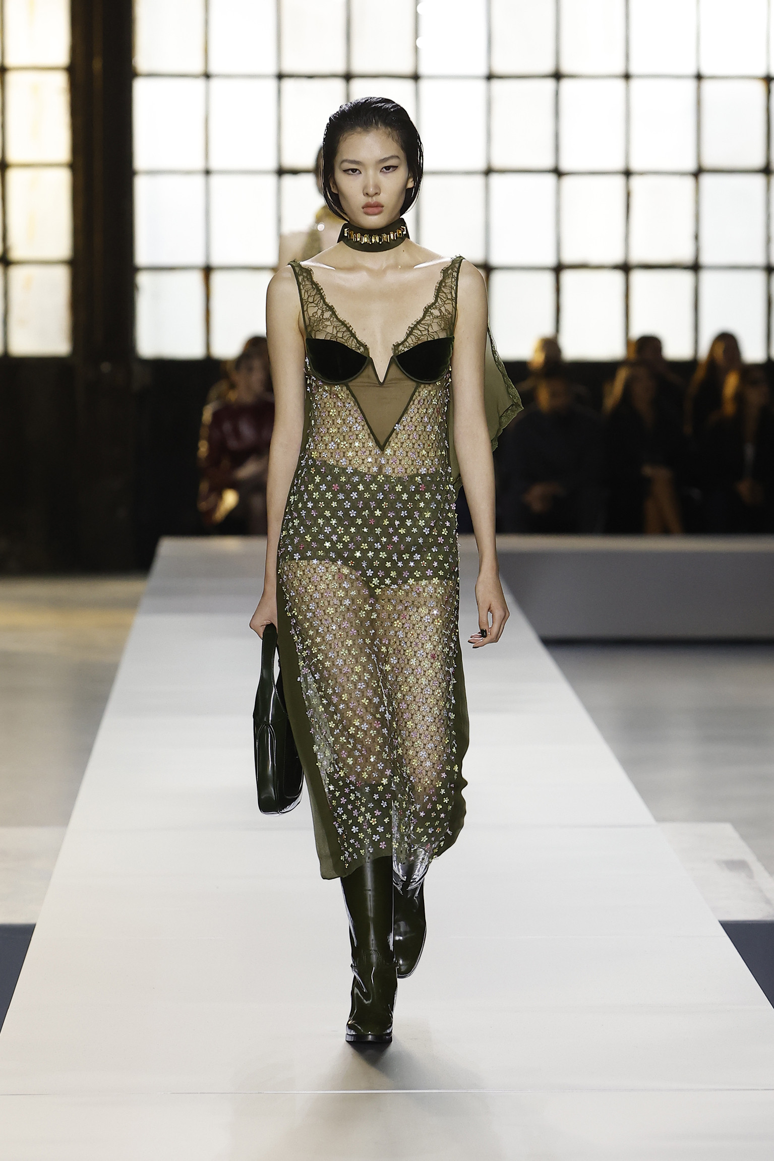 Sequins meticulously scattered across olive-toned fabric capture and reflect every ray of light, illuminating miniaturized florals paired with a glamorous choker—a testament to De Sarno’s vision of coherence in contrast, where luxury meets the cutting edge.
