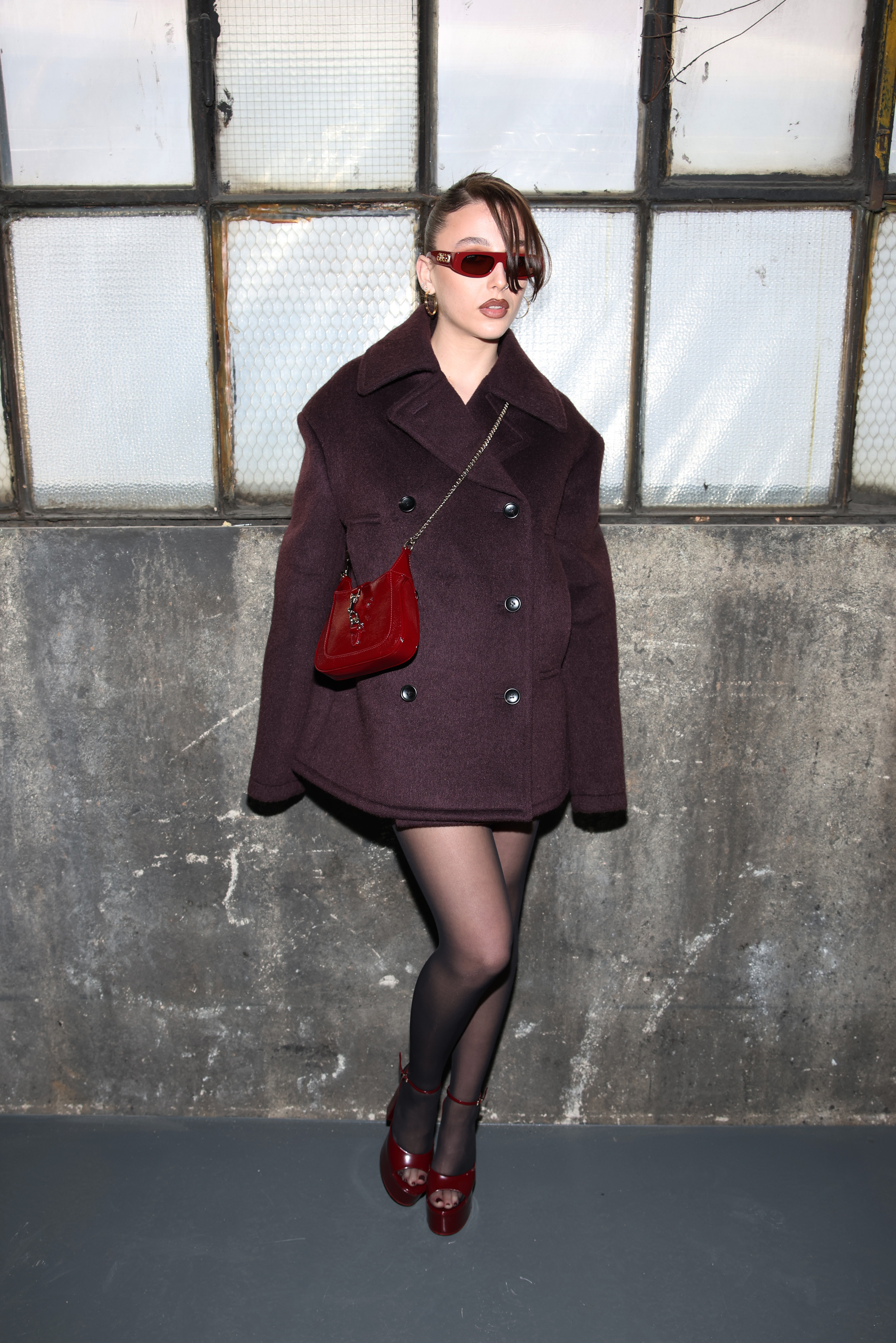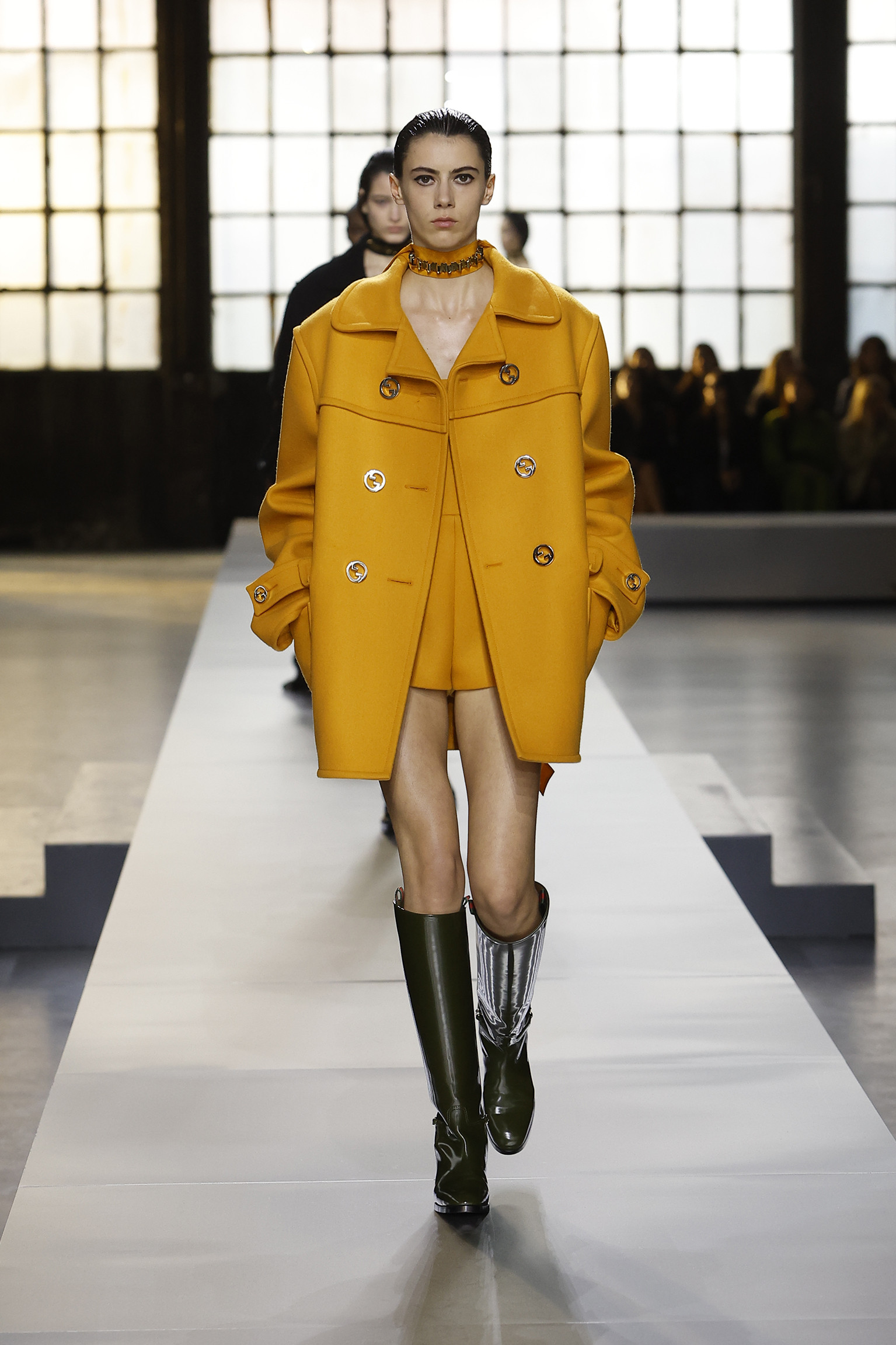 The vibrant green overcoat, with its oversized yet structured design, subverted the norms of classic tailoring. The pronounced buttons and double-breasted front paid homage to Gucci’s rich equestrian history, while the polished boots hinted at a sleek, forward-looking vision.