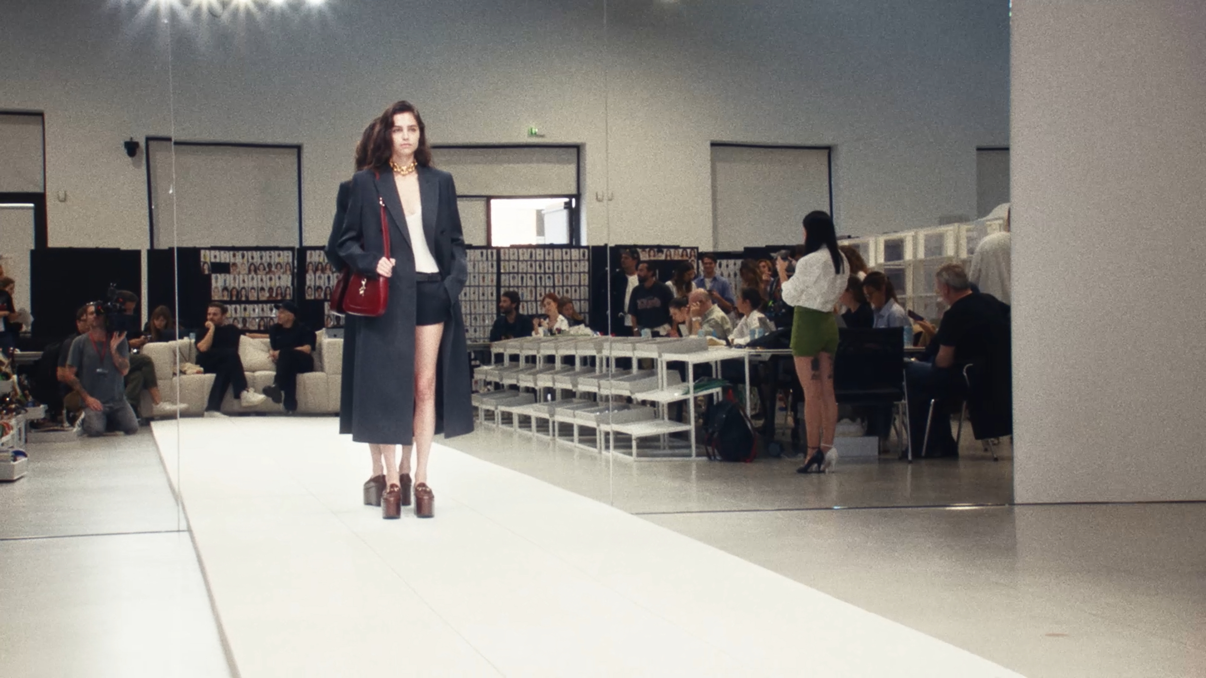 Film Still: A model strides down the runway in a pre rehearsal, her poised elegance embodies Gucci’s timeless allure.