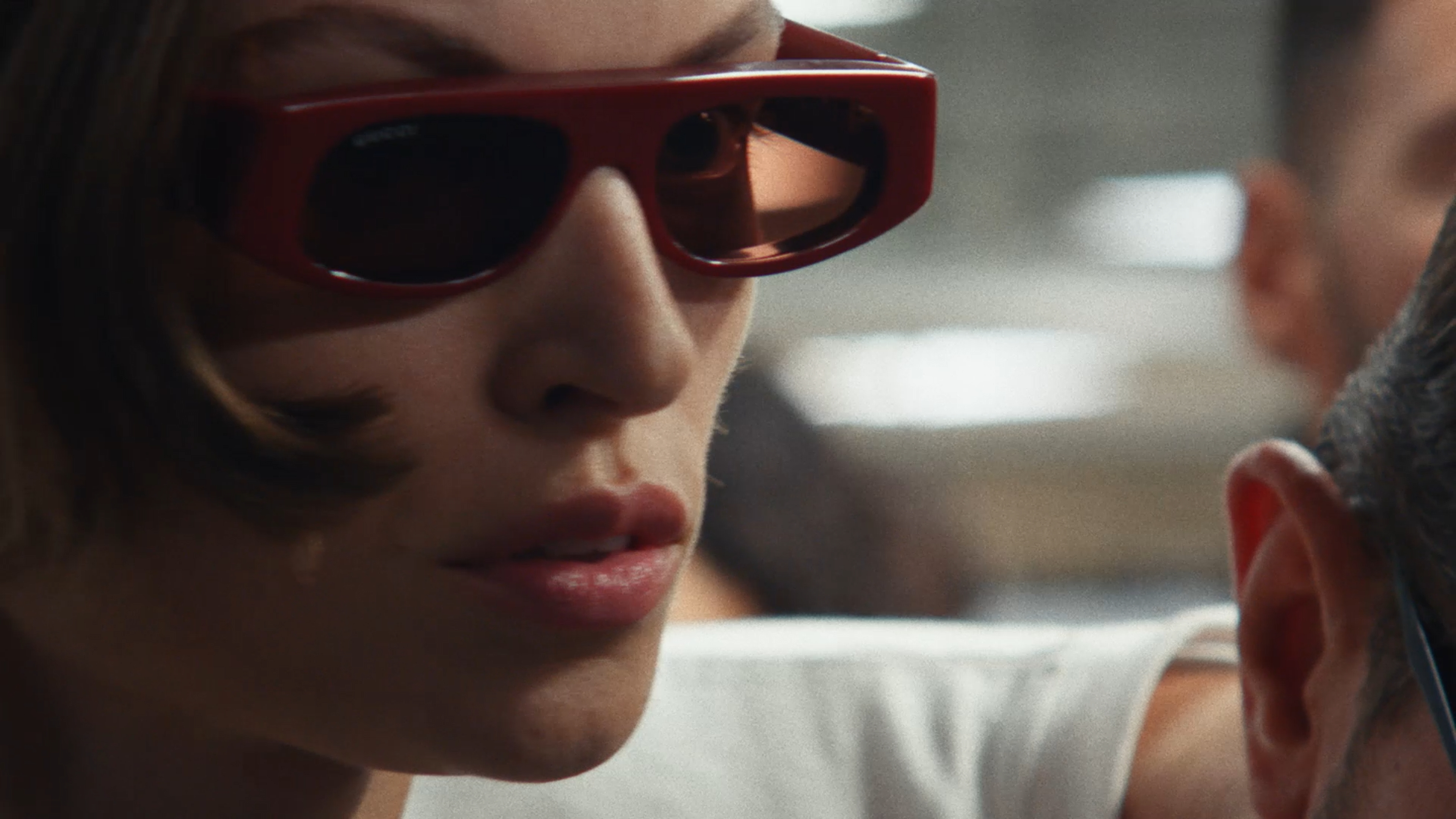 Film Still: A model’s reflection in crimson Gucci shades, her gaze capturing the essence of Gucci’s bold reinvention.