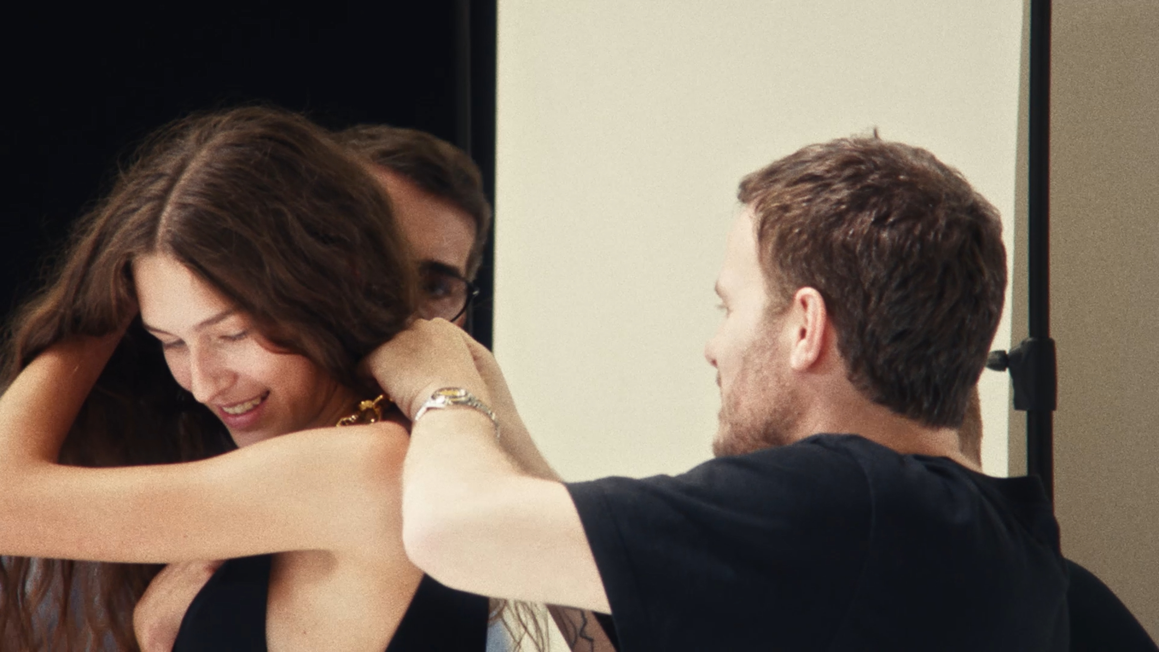 Film Still: In the Atelier’s Embrace: De Sarno adjust the lines of a timeless garment, as the model mirrors the serene confidence behind Gucci’s new chapter, a visual whisper of the fusion between creator and muse.