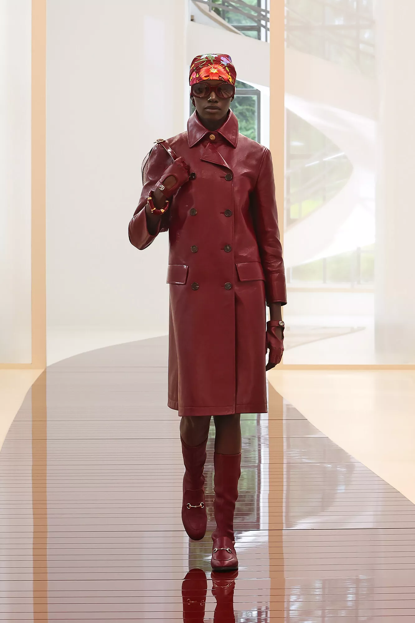 The collection pays homage to the swinging '60s, reimagined through a contemporary lens. De Sarno's fascination with the era is evident in every detail, from structured jackets and A-line skirts to wrap-around sunglasses with gradient lenses. The color palette, a sophisticated blend of greys, whites, and greens, is punctuated by the newly introducedGucci Rosso Ancora– a hue destined for iconic status.