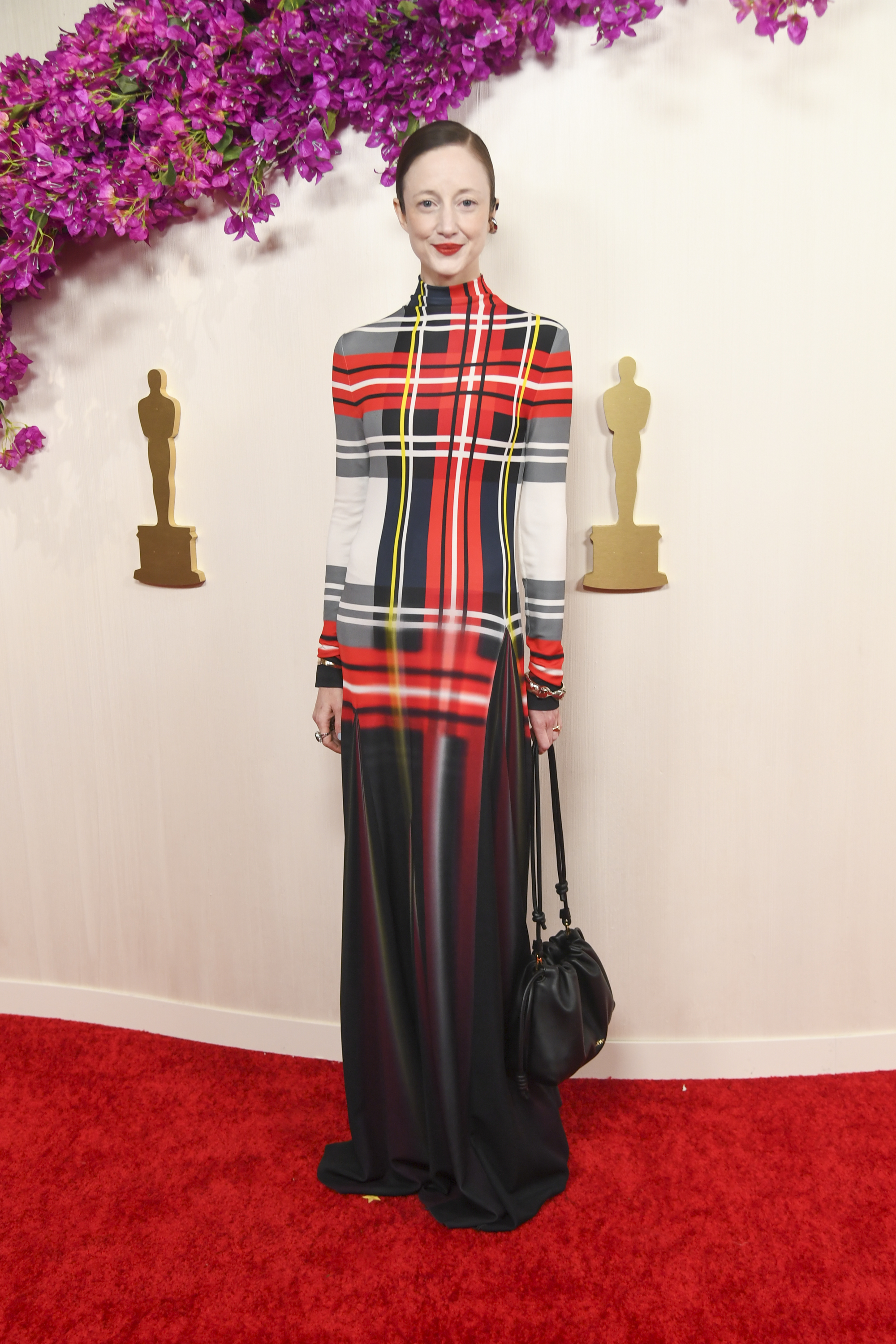 Andrea Riseborough, recognized for her leading role, showcased LOEWE’s visionary take on classic design. Her dress, accessorized with the Flamenco purse, was a dialogue between the past and the present, much like her on-screen portrayals that often blend historical context with contemporary relevance.