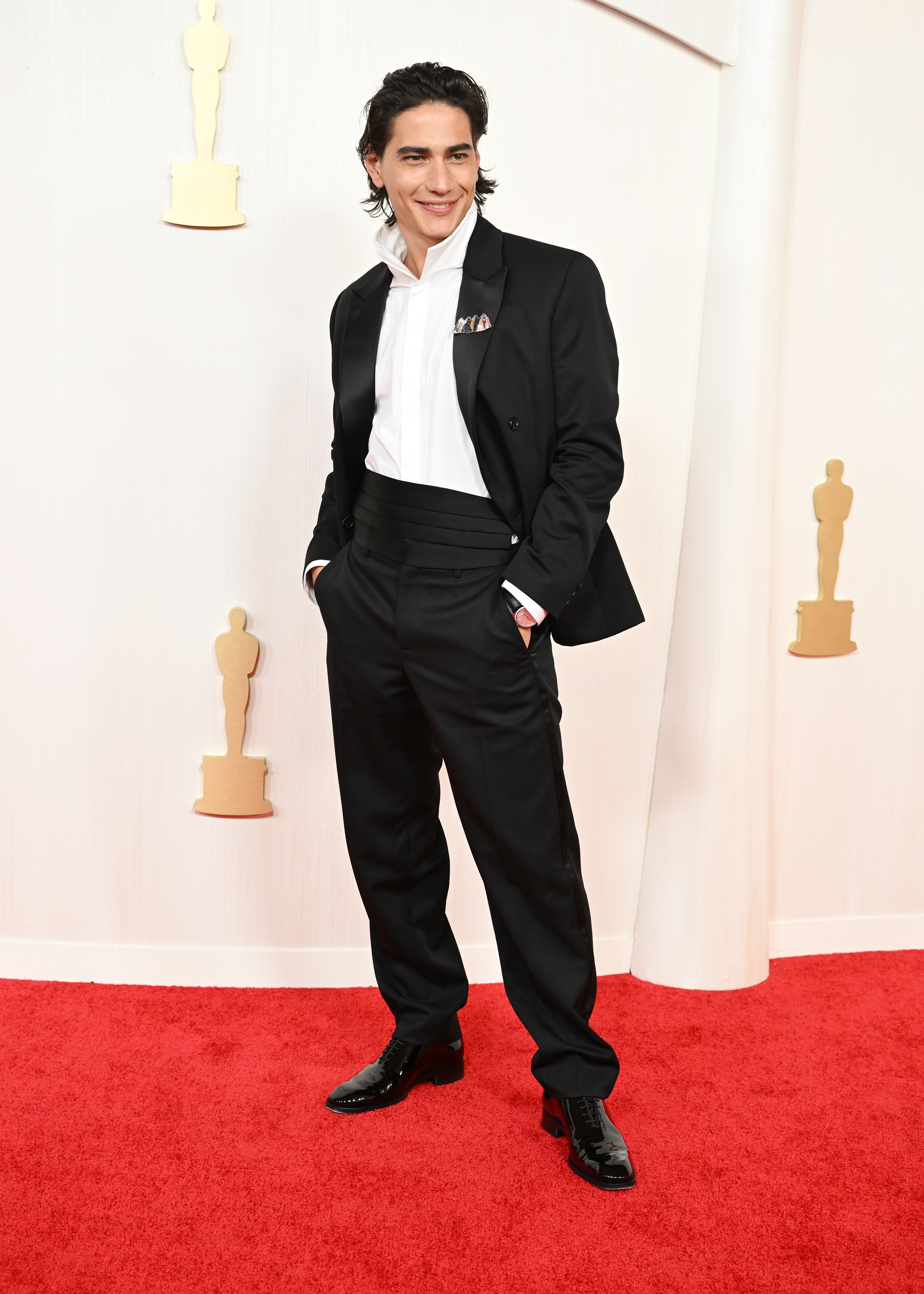 Debut nominee Enzo Vogrincic took to the Oscars stage in a custom LOEWE double-breasted tuxedo, a tribute to his heritage with a crystal brooch reflecting the Andean range. His outfit mirrored the narrative depth and cultural richness evident in his breakthrough performance.