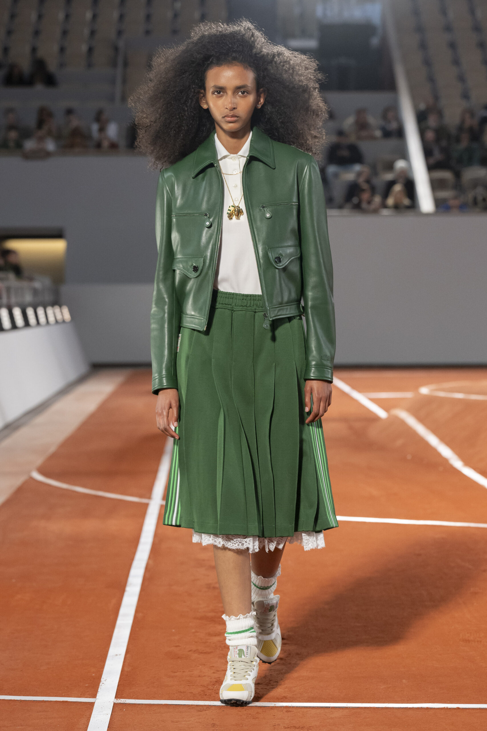 Delving into Lacoste’s archives, Kolotouros shines a contemporary spotlight on elements like the original tennis polo and pleats. The lineup includes references to René Lacoste’s American adventures, with Pop Art-style jacquards and pleated skirts nodding to tennis champion Suzanne Lenglen’s iconic style. Sport tops, parkas, and puffers designed for fashion and performance further elevate the offering. New-gen cable knits and hand-embroidered coats update the traditional country club aesthetic, while croc-effect bucket bags and photographic prints pay tribute to Lacoste’s storied past.