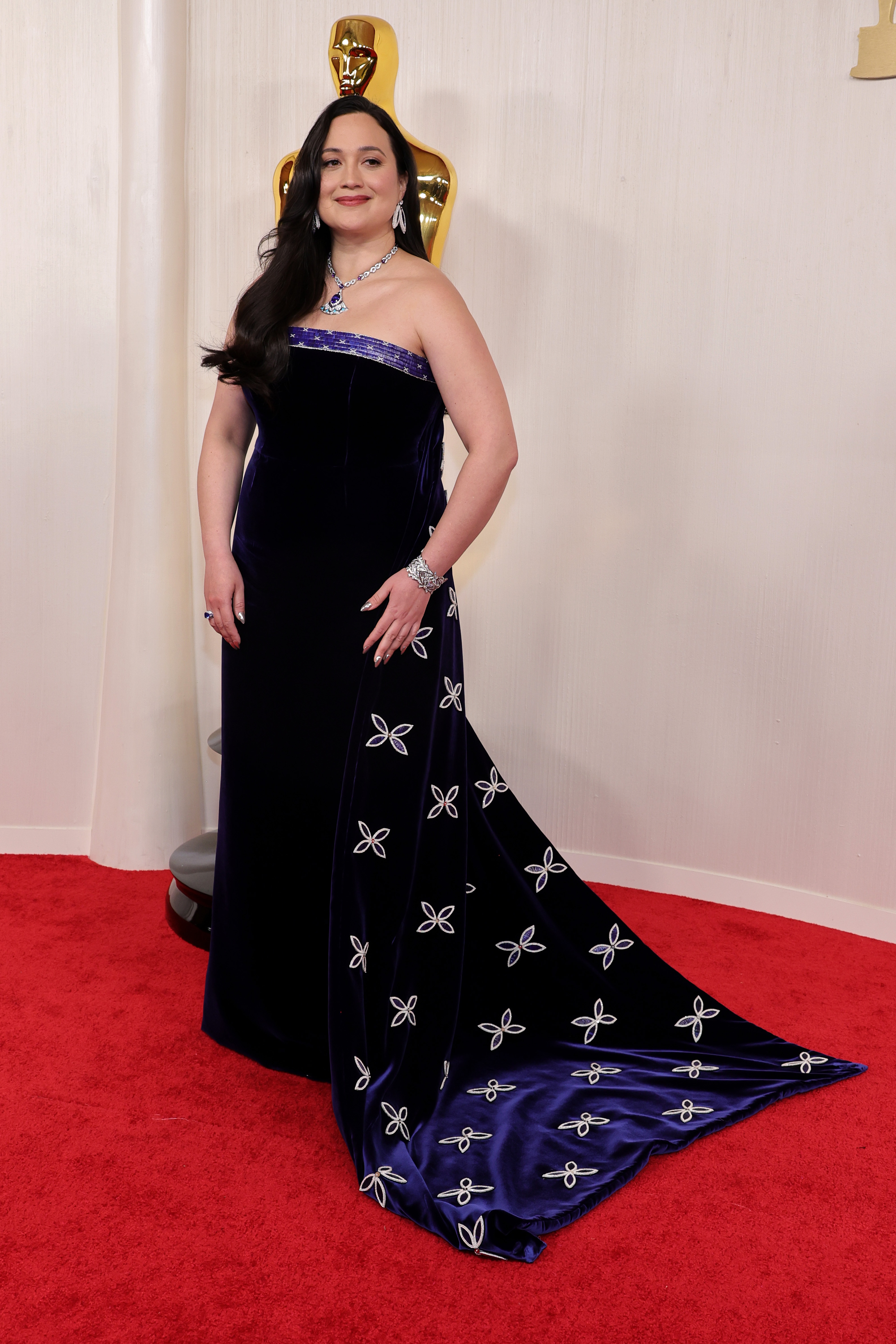 Lily Gladstone, nominated for Best Actress in a Leading Role for Killers of the Flower Moon, stepped onto the red carpet, her Gucci gown a luxurious canvas showcasing Joe Big Mountain’s quillwork — an artful nod to her Siksikaitsitapi and NiMíiPuu heritage. The gown’s intricate detailing and midnight blue hue were a fashion statement and also a celebration of Indigenous art, beautifully merging ancestral craftsmanship with Gucci’s contemporary elegance.
