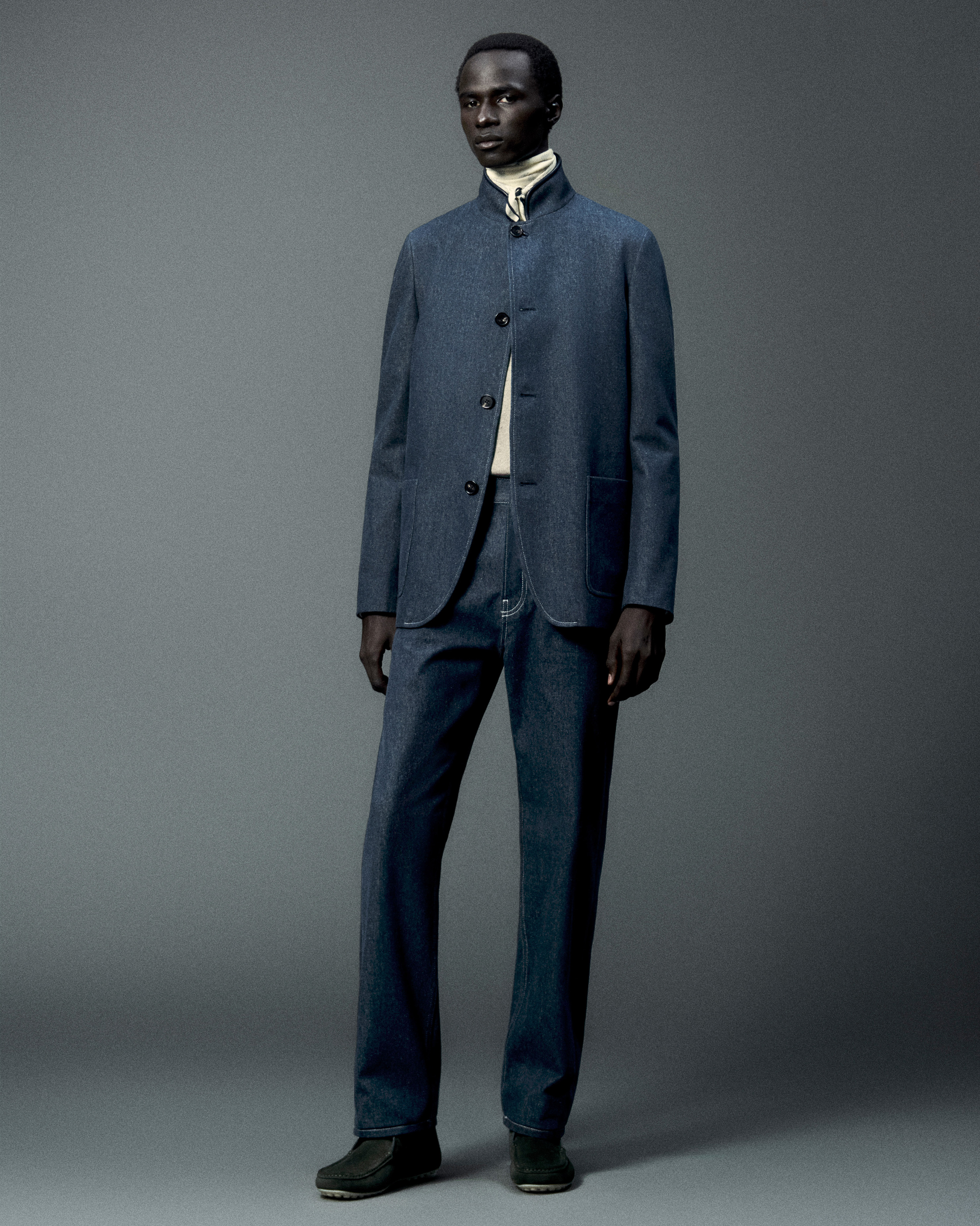 This collection masterfully blends textures and colors, capturing the quintessential Loro Piana aesthetic. It spans Cashmeres, Baby Cashmeres, Cash Tweeds, CashDenim®, and wools in a palette of classic and contemporary tones, from venus rice and steel brown to the neutral tundra, accented by shades of dark Vicuña, shadow blue, and milk sand, transitioning seamlessly into the elegance of nighttime black.