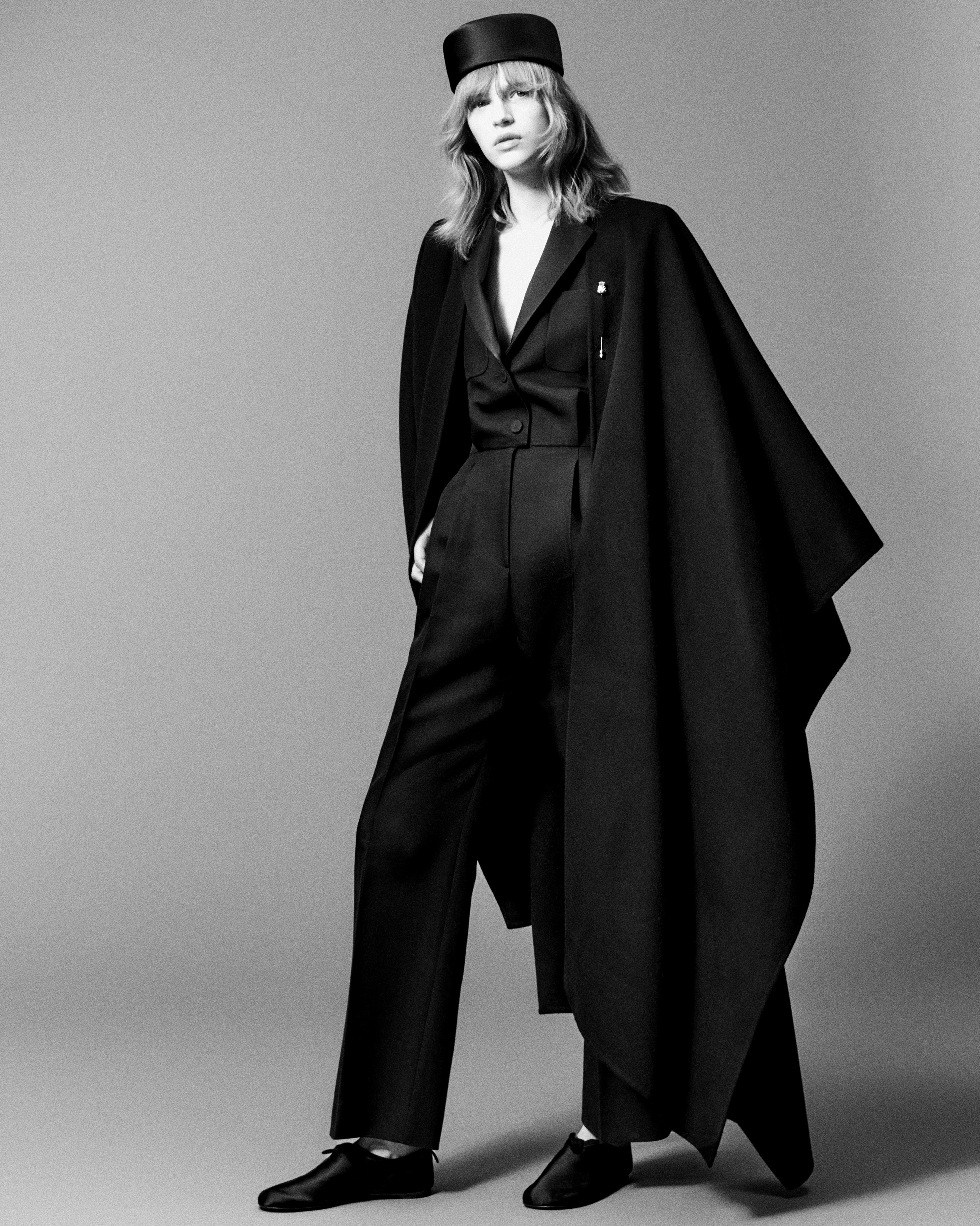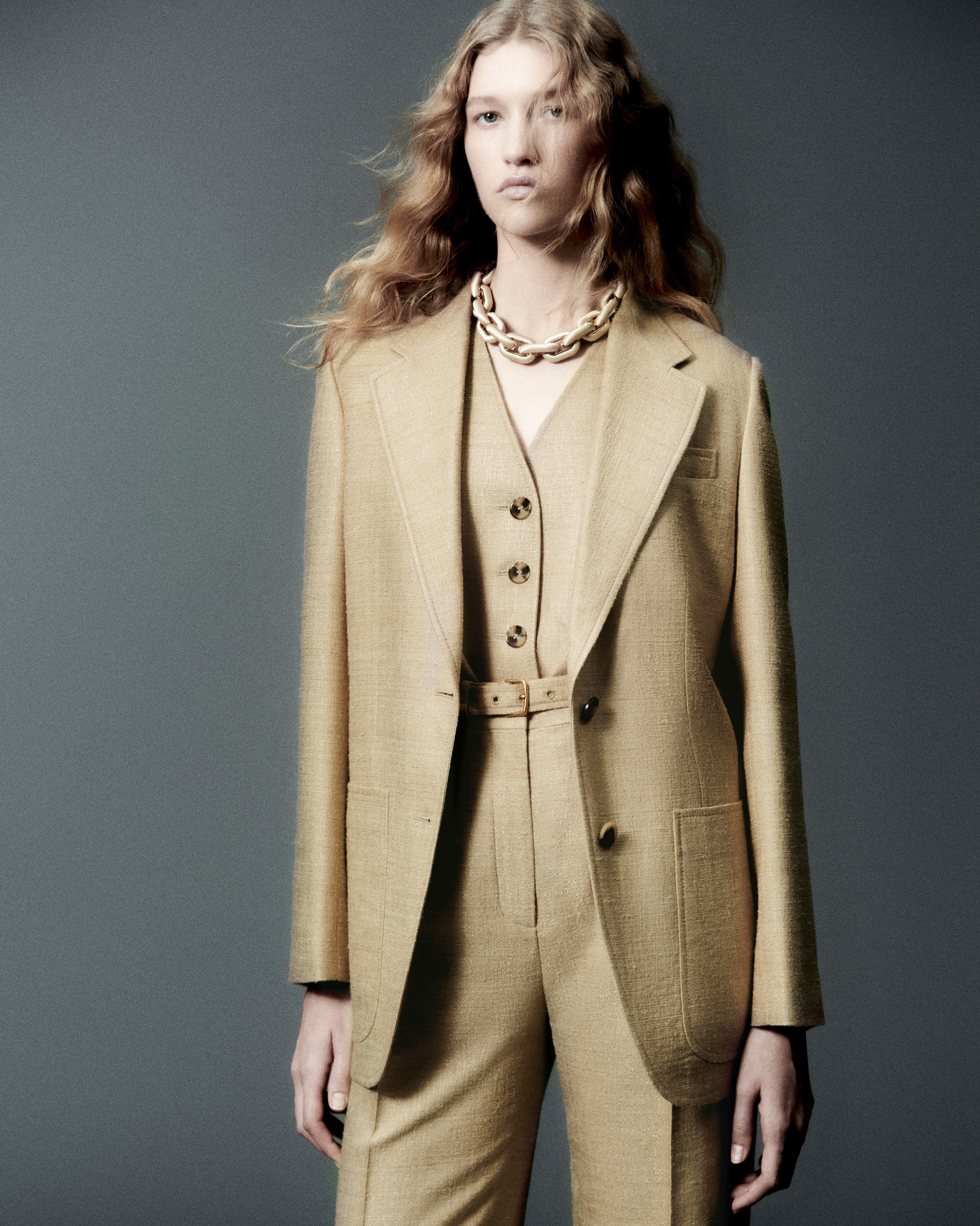 The Fall/Winter 2024-2025 Collection blends strength and elegance, with the robust spirit of Pecora Nera® outerwear elegantly intertwining with the renewed embrace of femininity, manifesting in the fluid silhouettes of silk coats and lustrous satin skirts. This duality is a Loro Piana signature, blending strength with softness, tradition with innovation. The collection introduces a fresh take on ladylike aesthetics with petite jackets adorned with the delicate cardo flower, alongside the flowing elegance of pleated skirts and knit dresses.
