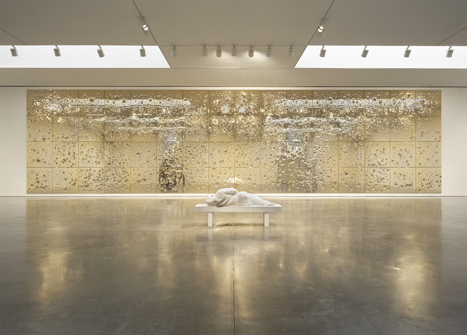 Titled "Sunday," the monumental installation features panels of stainless steel plated in 24-karat gold, riddled with bullet holes. The unsettling transformation of the once-smooth surfaces evokes a history of guns in art, from Edouard Manet's "The Execution of Emperor Maximilian" (1868–69) to Chris Burden's "Shoot" (1971) and William Burroughs's shotgun paintings. Cattelan's bold move challenges the boundaries of art and society, forcing visitors to confront the disturbing reality of gun violence in America.