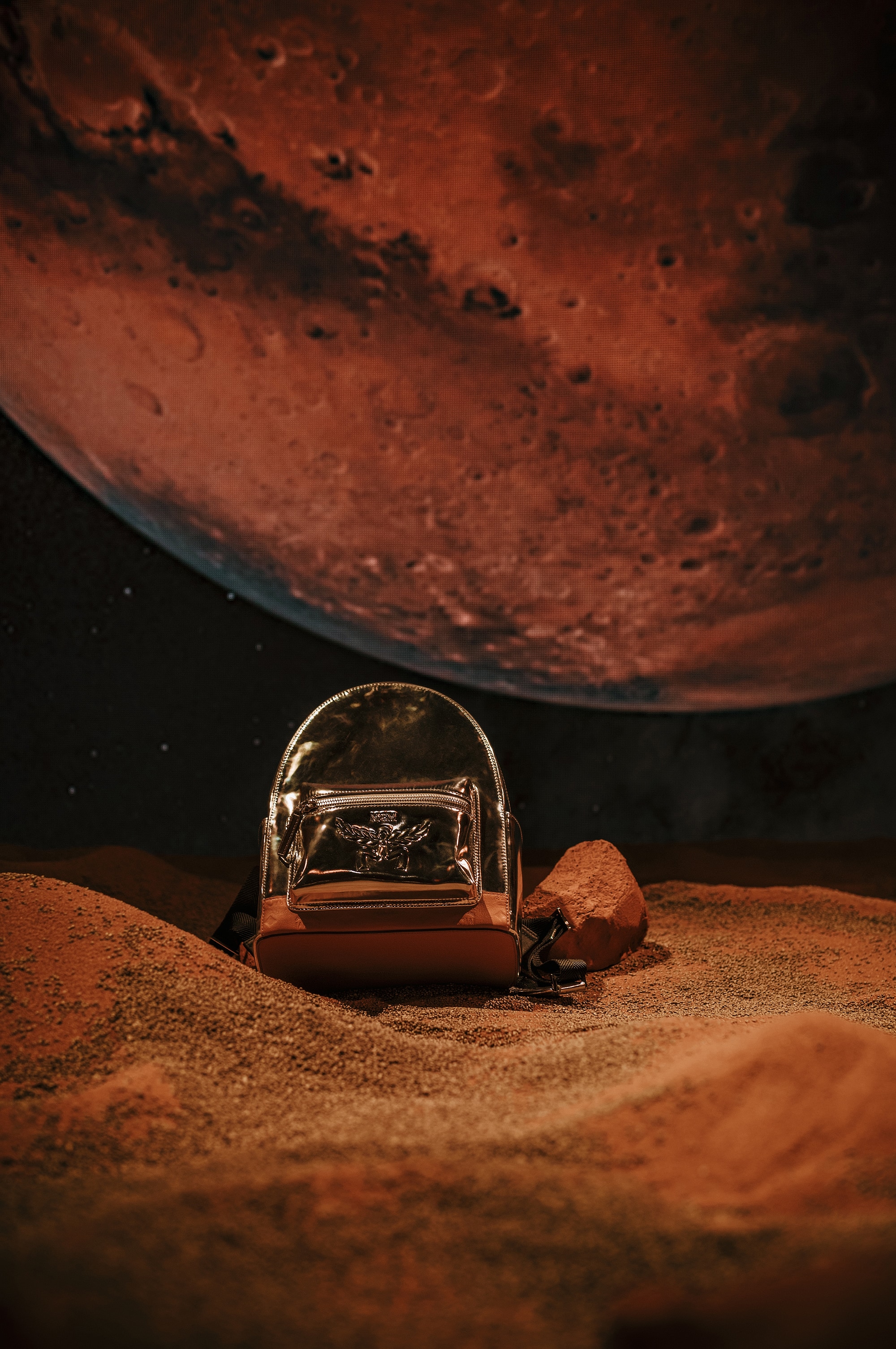 A Celestial Vision: The novel MCM bag shines against a Martian backdrop, symbolizing a bold leap into the future of fashion.