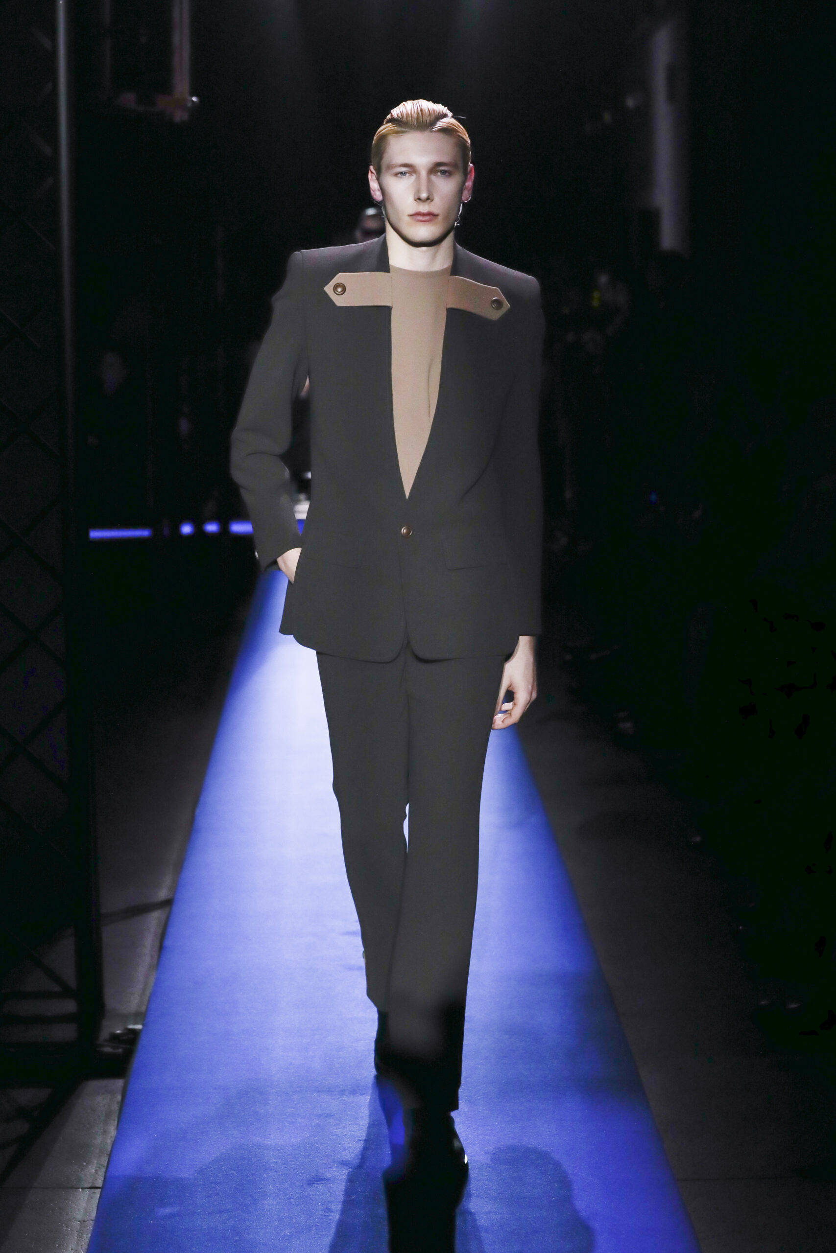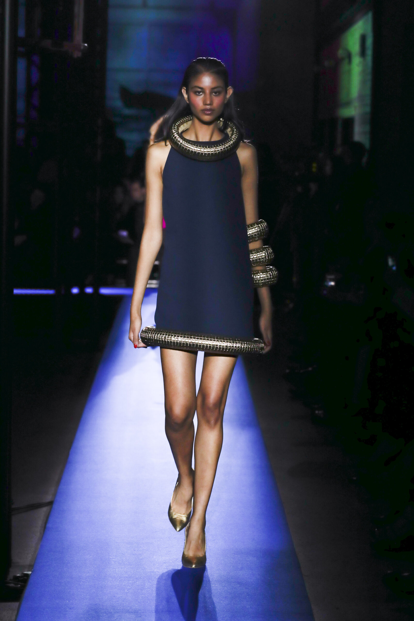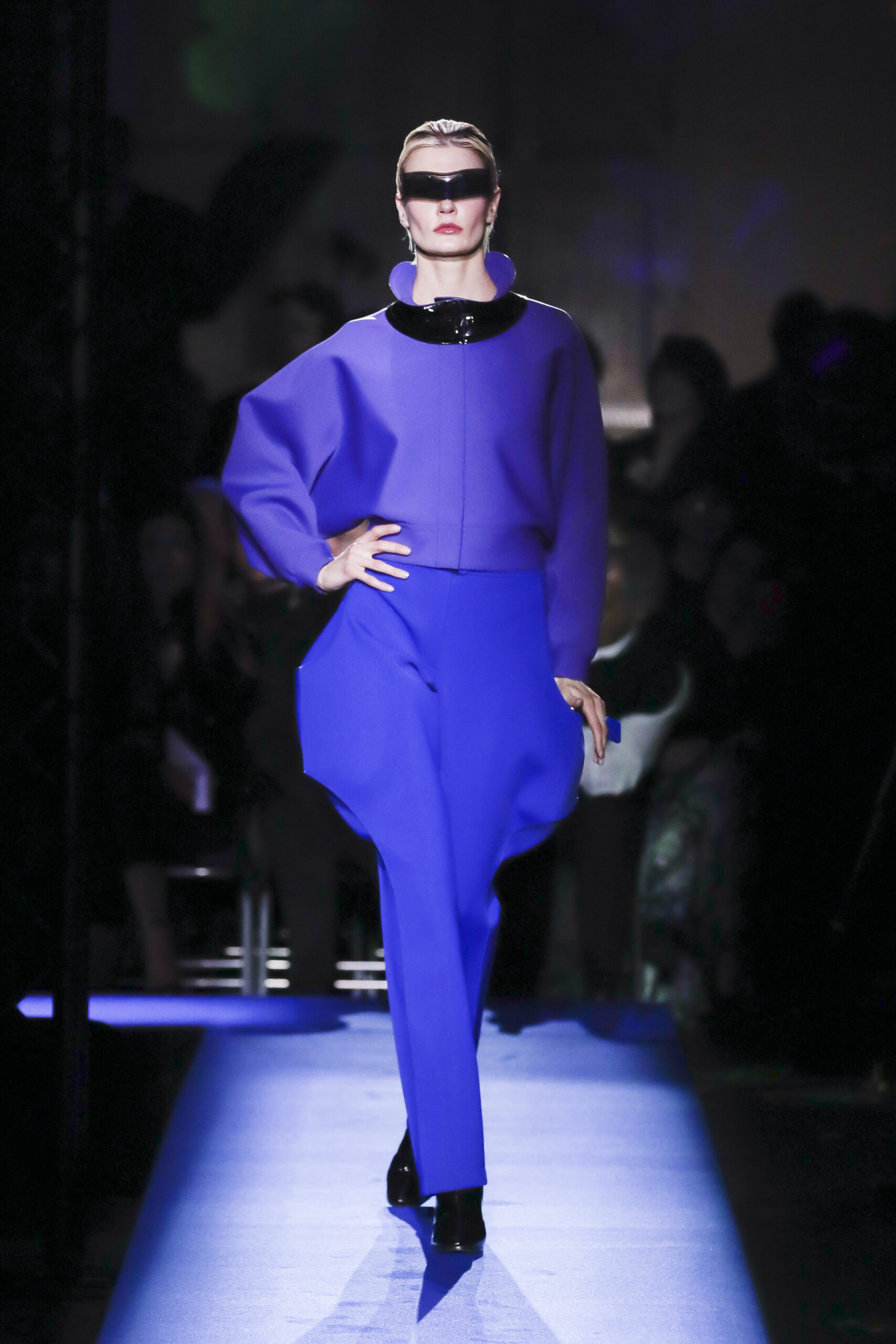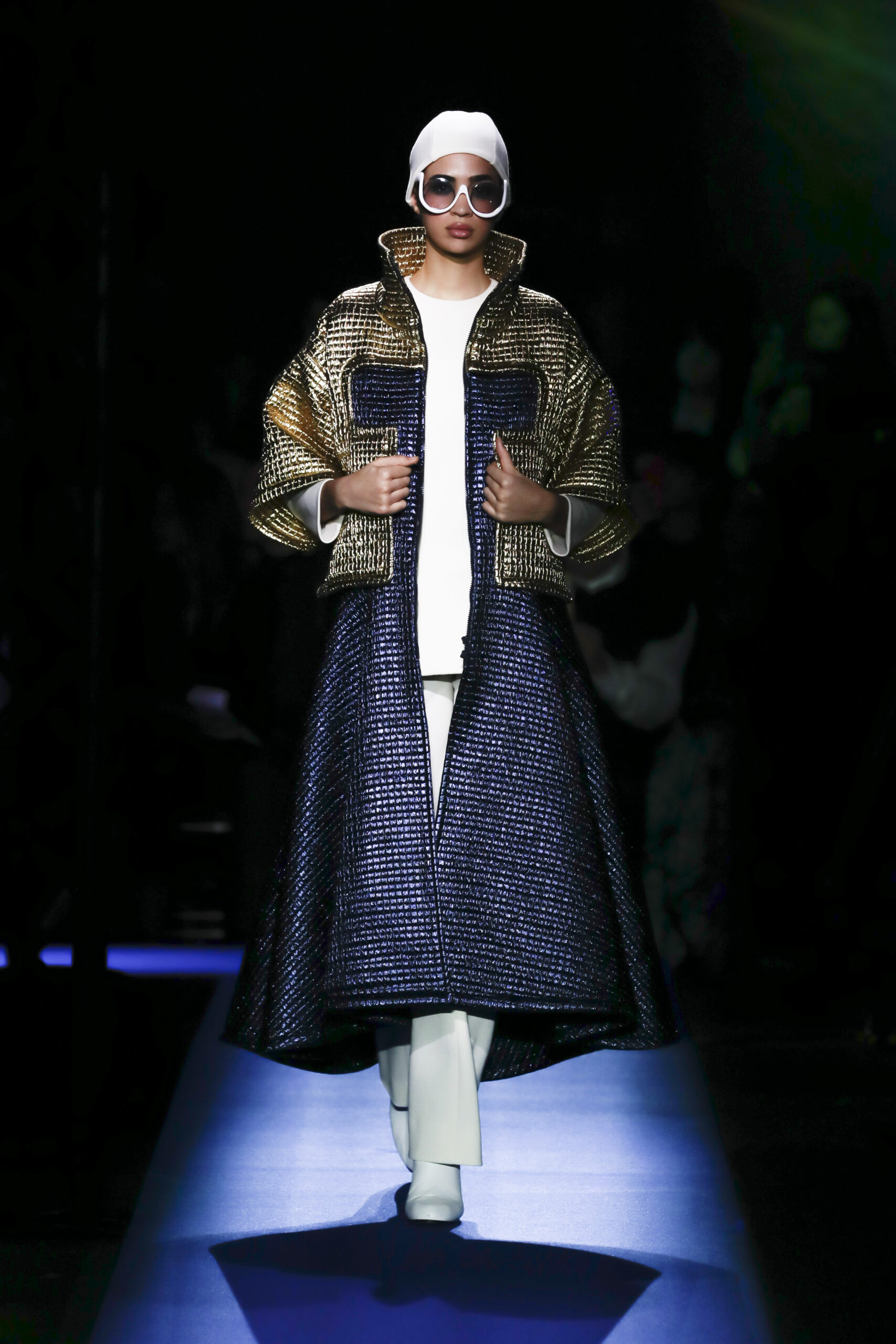 Then the first model appeared, dressed in a retro-futurist style that, due to the regal blue and gold color scheme and boxy silhouette, unmistakably recalled the tomb of Tutankhamun. Aesthetically, the proudly independent Cardin house rarely chooses to engage with the current flashpoint – instead referencing the frontiers of human experience in creating a fantastical world season after season. This year was no different; while the ocean was the central theme, Cardin created a modular Atlantis-style universe that transcended time to bring us into both the ancient world and the space age.