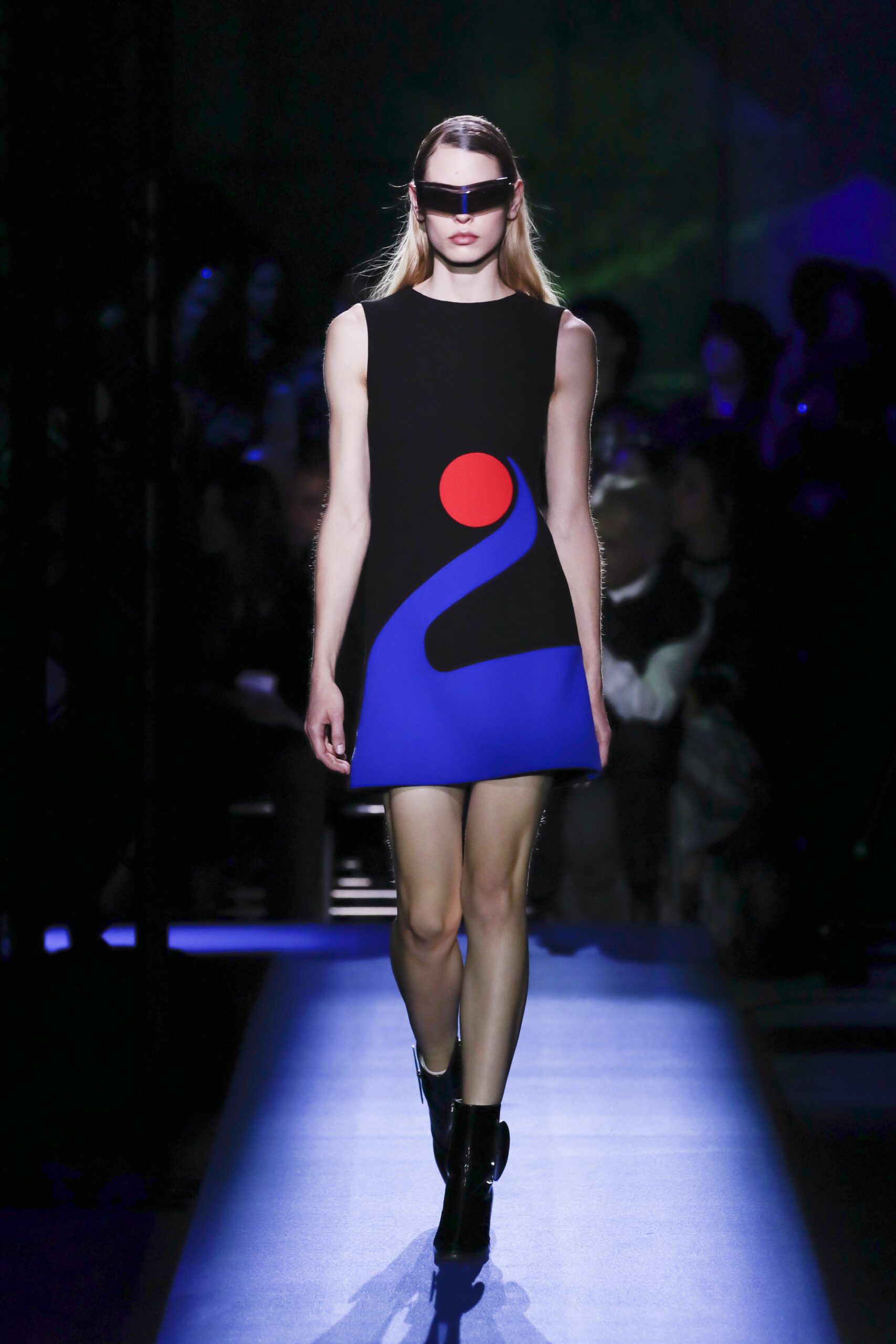 Piet Mondrian’s bright “_De Stijl” _neo-plasticism (which found geometric and chromatic harmony by reducing art to essential shapes and the three primary colors) was evoked by several dresses. Sonia Delaunay, a French abstract artist who favored vibrant colors and circular forms, was also evoked; a number of looks were adorned with clean circular patterns, cut-outs or jeweled accoutrements. Perry Ellis specifically quoted Delaunay as the inspiration for one of his most memorable collections, a 1984 offering centered on knitwear. Whether intentionally or unintentionally, this season saw Cardin bring Delaunay into the contemporary sartorial conversation; her aesthetic translates just as effectively to synthetic neoprene and space age silhouettes as it did to Ellis’s classic and casual knits.