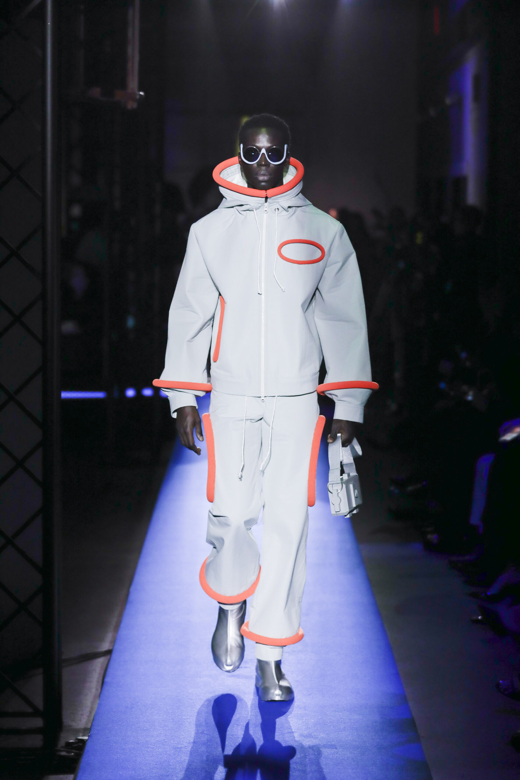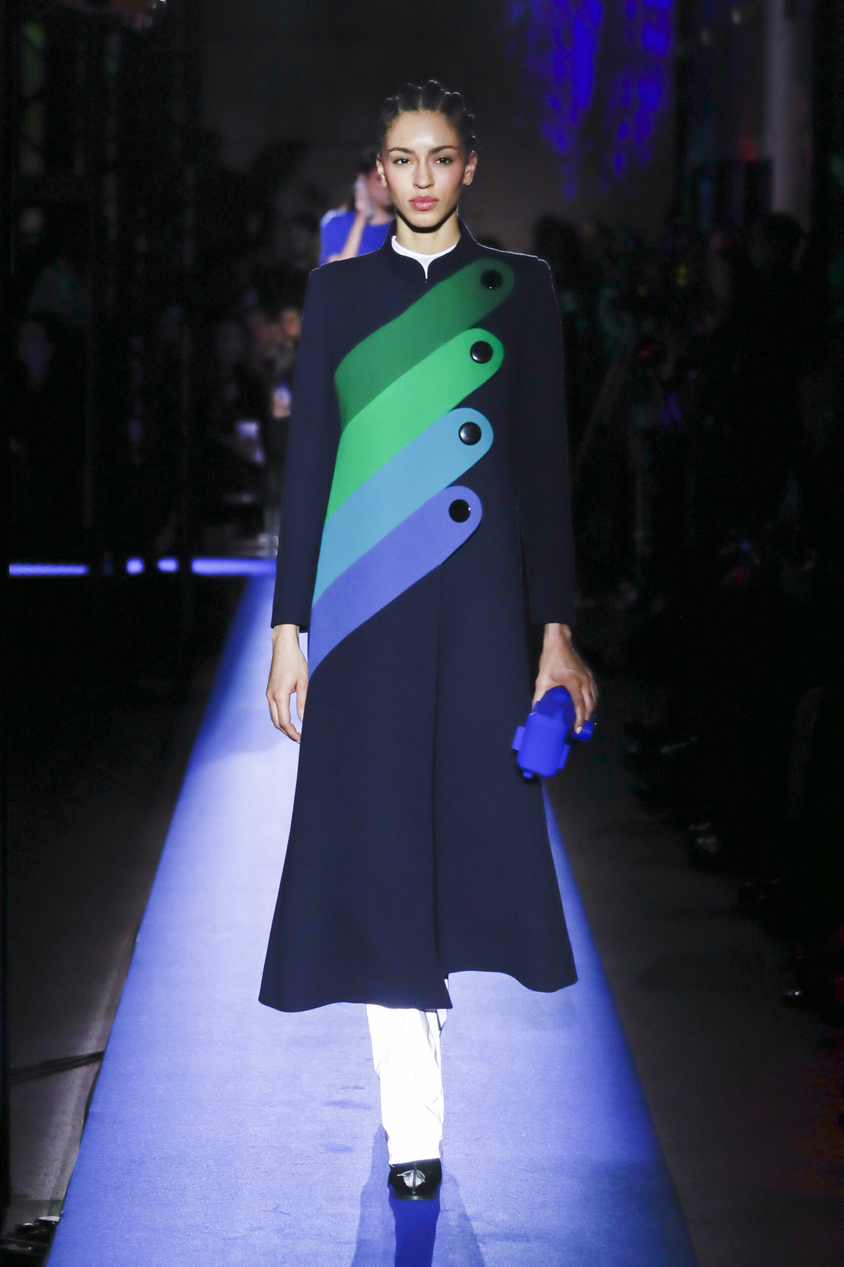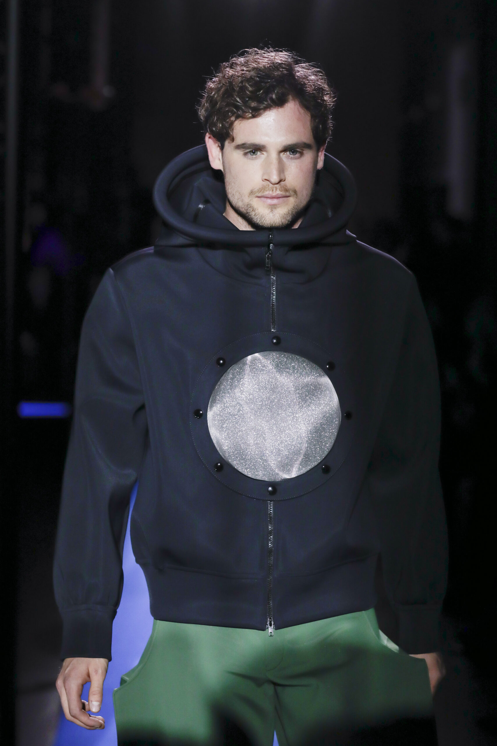 Cardin’s attention to detail was the most impressive thing about this collection. Each accoutrement of the modular looks, including the limited-run Evolution “Wave” sunglasses (produced using an eco-responsible “Made in Italy” model) was carefully considered. The synchronized production was almost as memorable as the clothes, as each look was mirrored by individually paired clips of ocean imagery that played on the Atelier’s massive screens as the model moved down the runway.