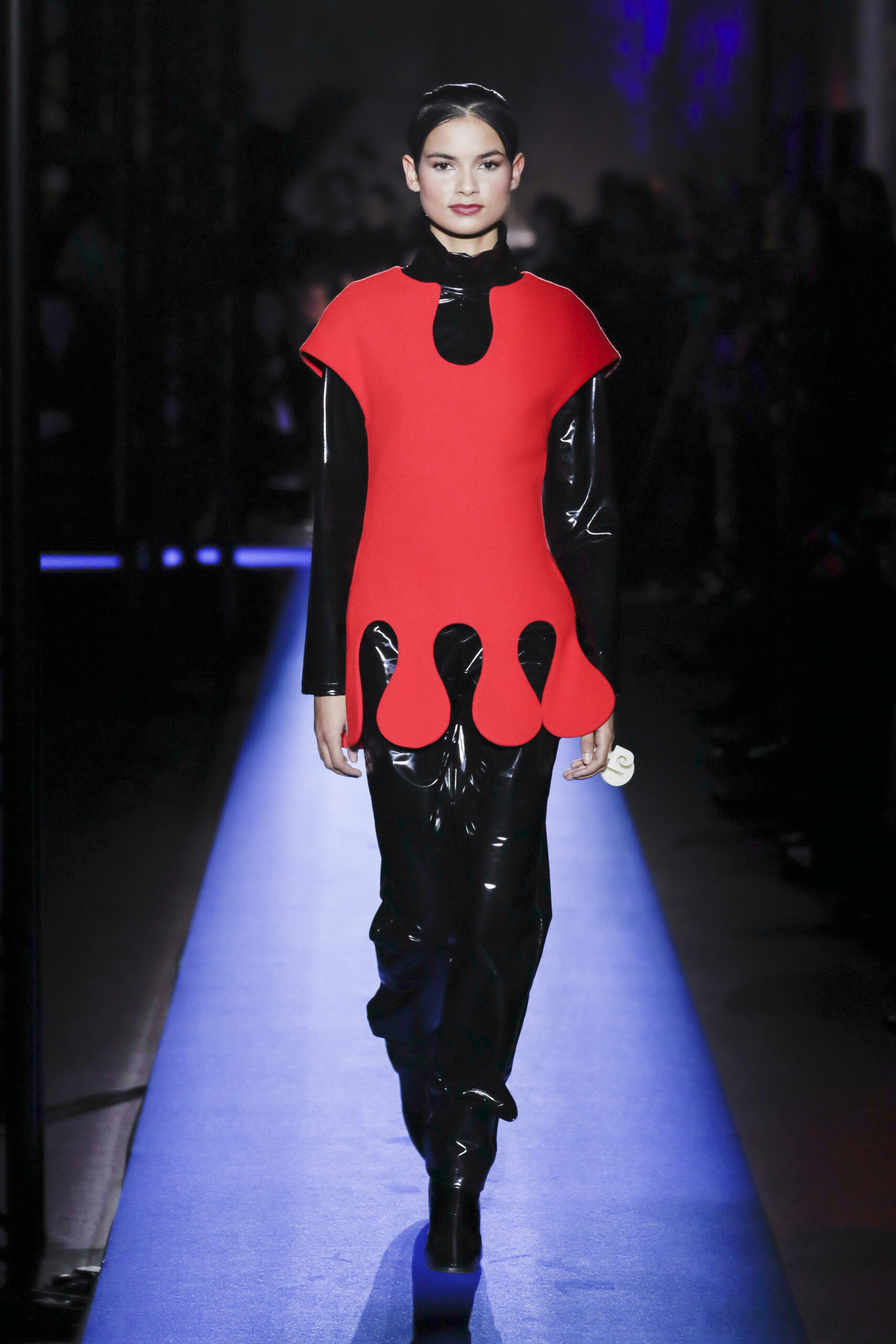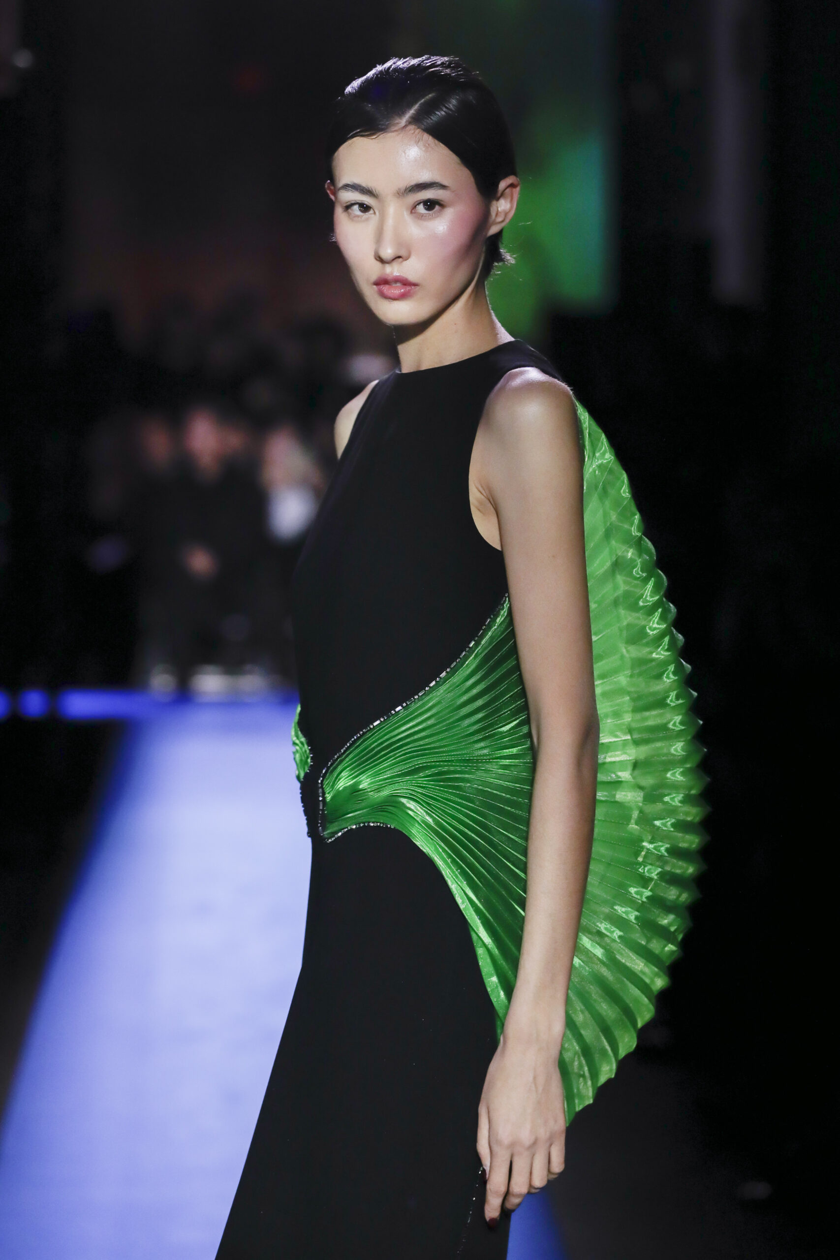 An ocean-themed collection was the perfect opportunity to focus on sustainability and progressing fashion into a better future. Global warming and over-pollution have increasingly wreaked havoc on ocean ecosystems in recent years, compromising the existence of the beautiful organisms and habitats that dazzled guests in the video prelude to the show. Cardin addressed this by presenting one of the most sustainable collections to grace the runways this season; from up-cycled neoprene to pleated organza, the collection was designed entirely from either recycled fabrics or the house’s dormant stocks.