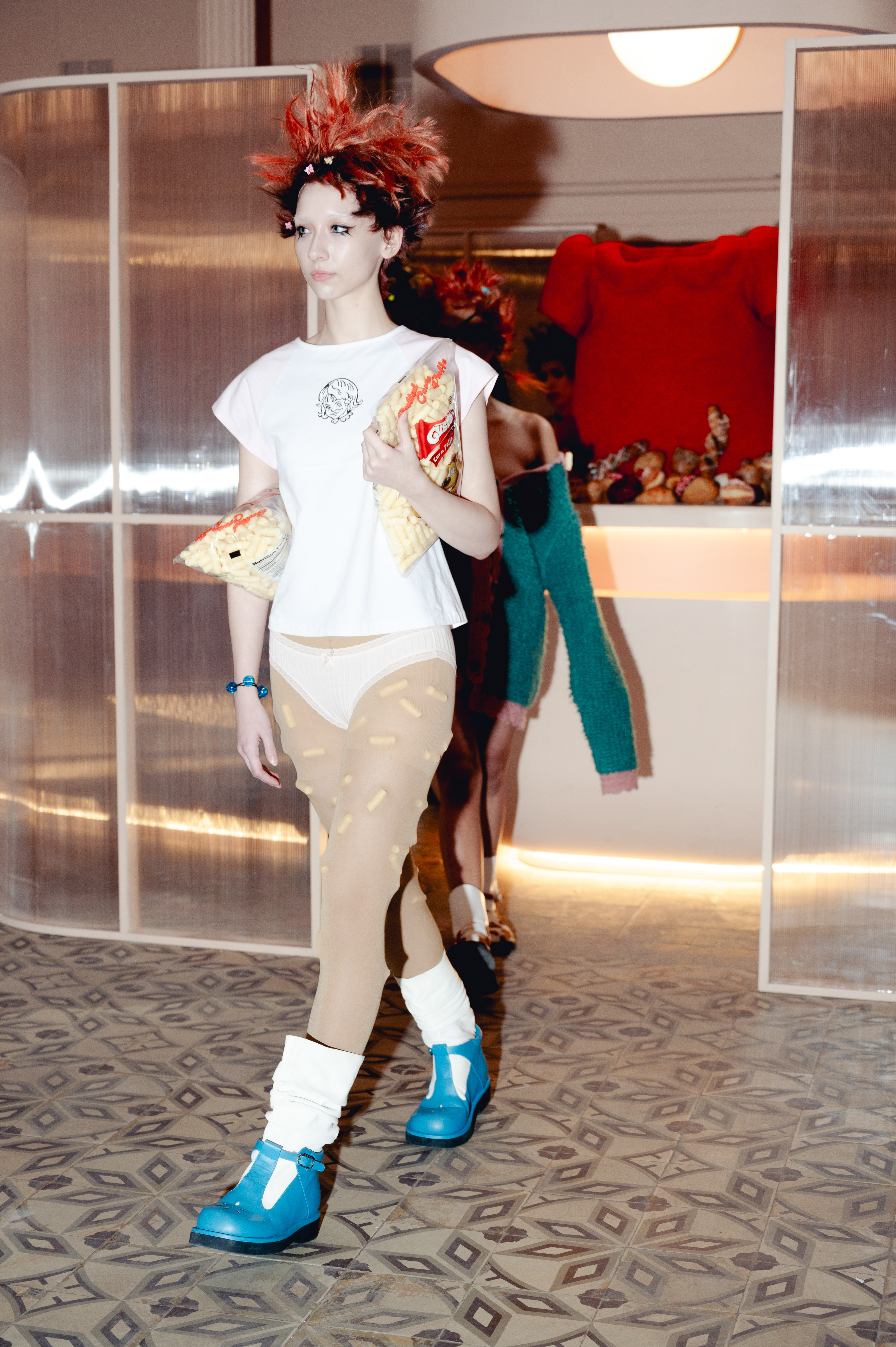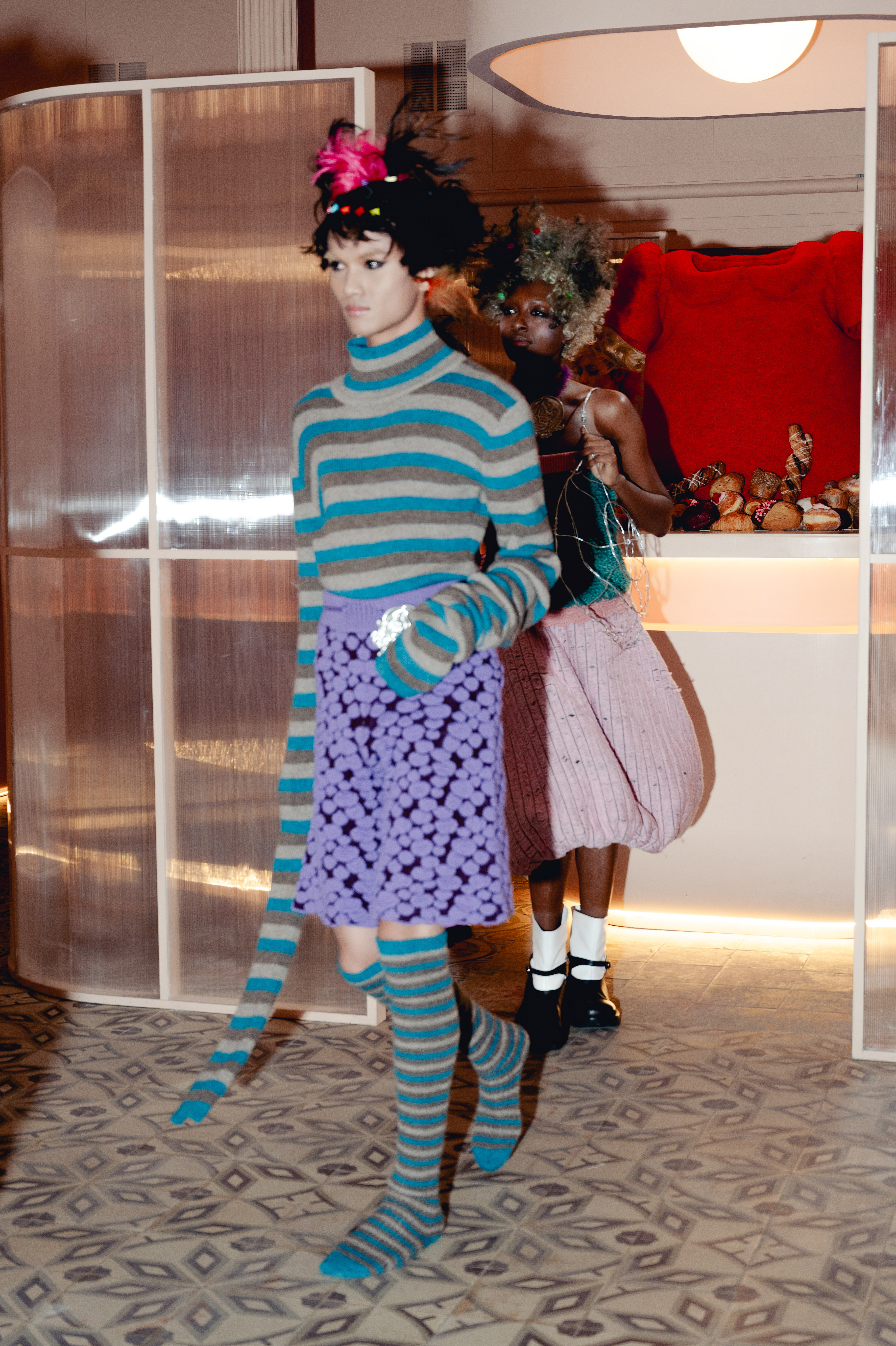 After the show, Lorena Pipenco described the collection, saying, “The pieces are very inspired by chaotic kids. I was quite a goody two shoes but my brothers were very cheeky, and my sister is quite gothic, so we had different kinds of kids coming in with different personalities. The looks are just reflecting that emotion.”
