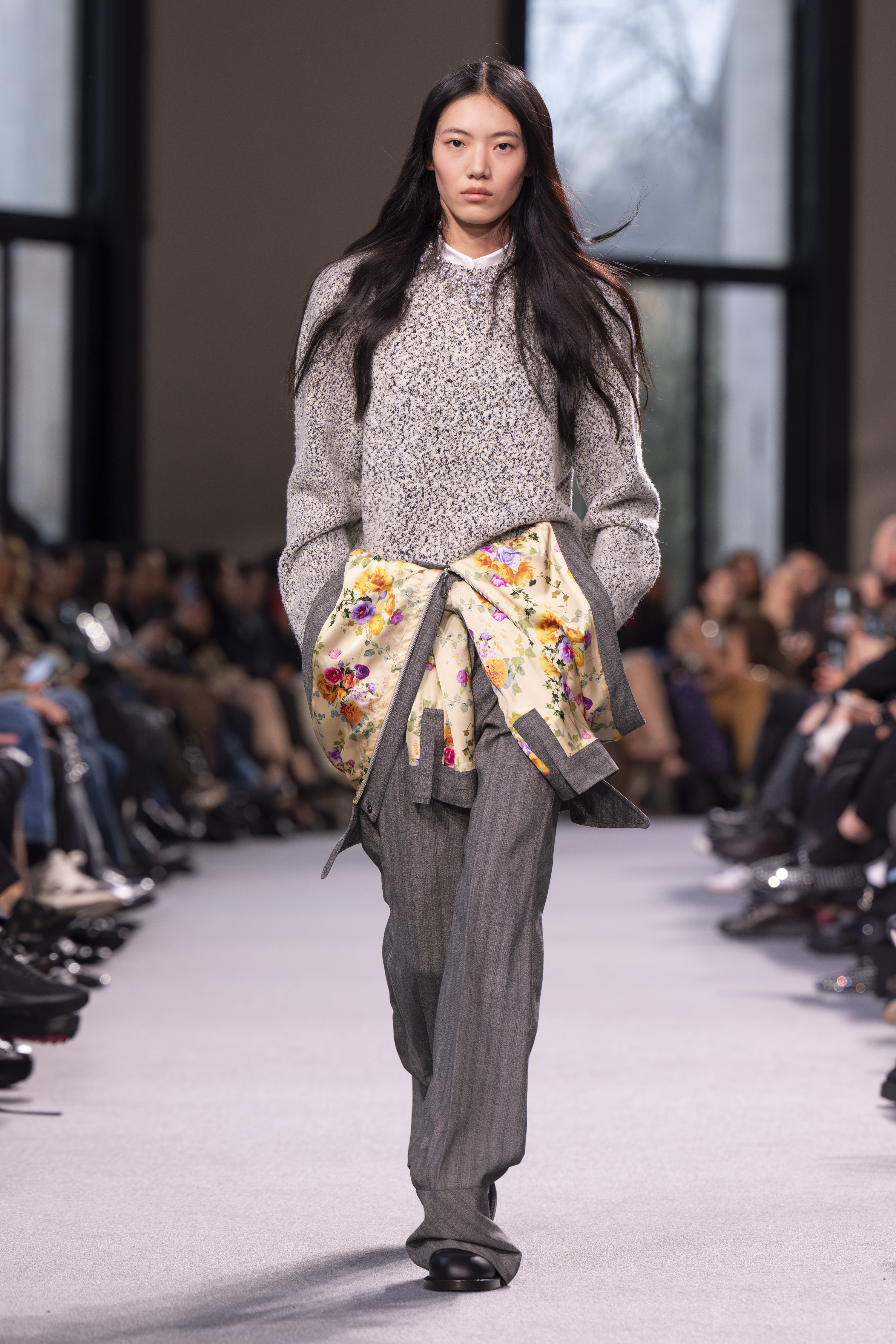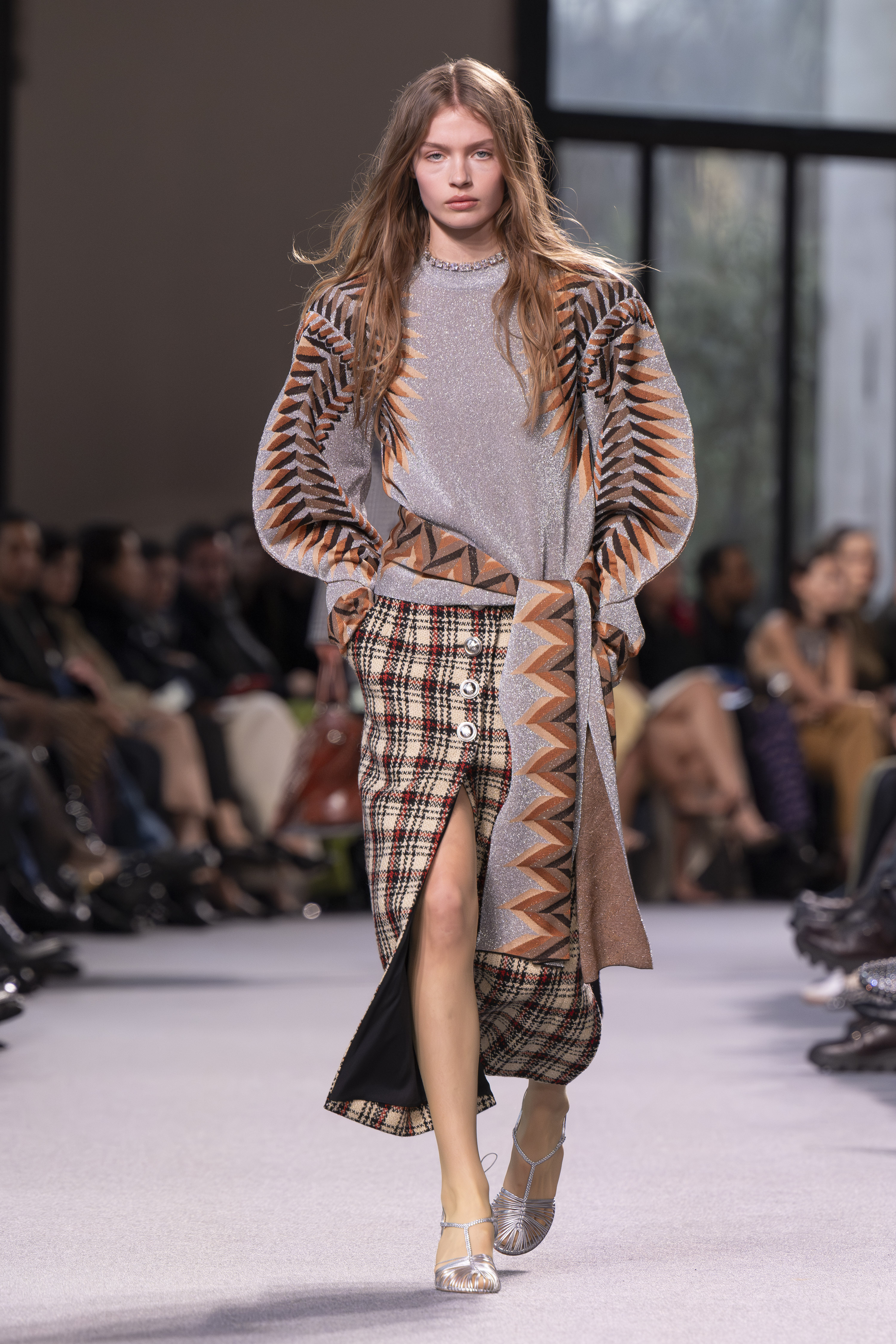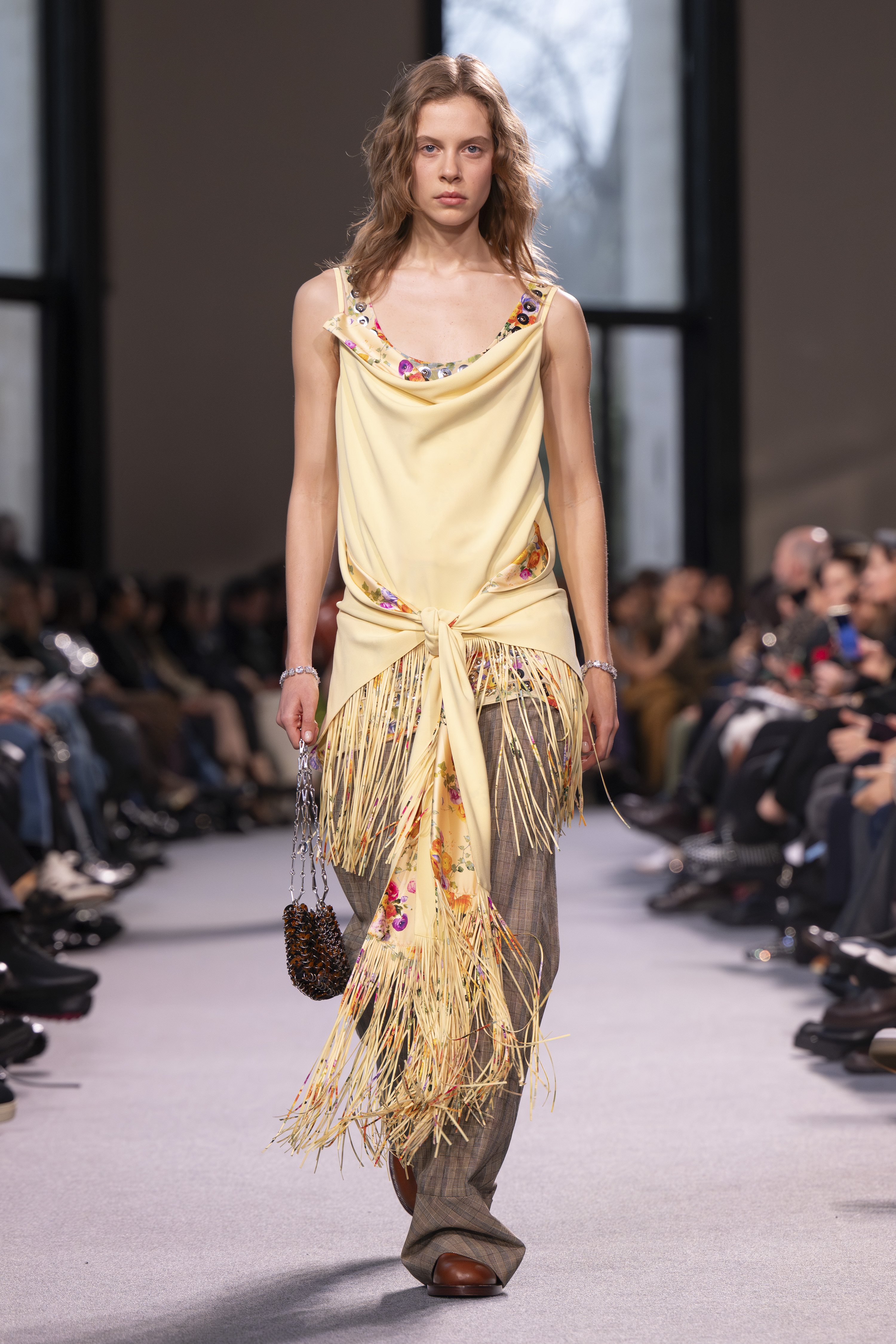 Dossena’s masterful vision for Rabanne’s “Patterns of Attraction” FW24 collection orchestrates a ballet of contrasts that play across bias plaids, fuzzy checks, and flocked micro motifs. A symphony of colors, from classic black and white to powdery yellow and vivid azure, creates a textural rhythm that defines the collection.
