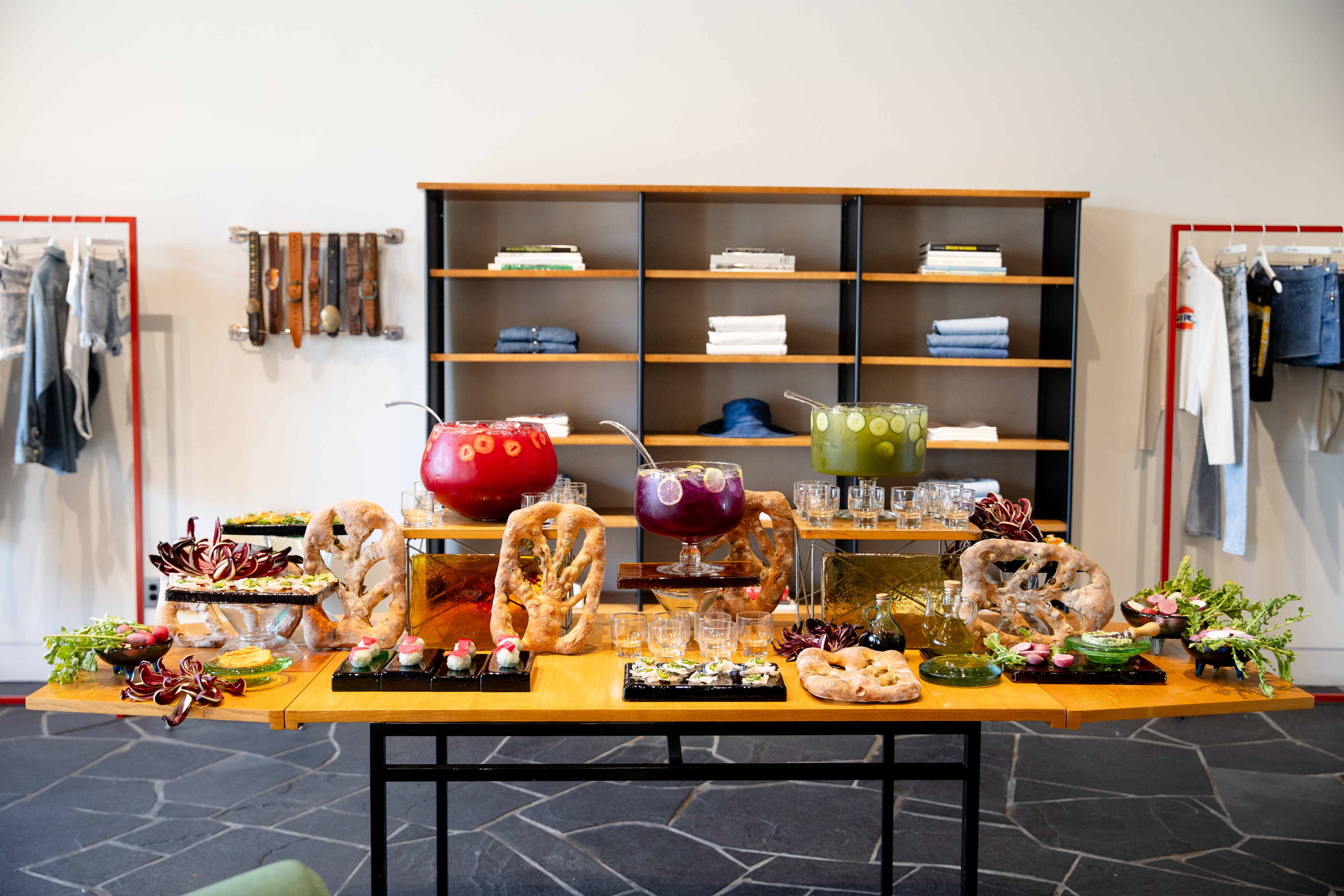 A stylish spread of appetizers and artisanal drinks, curated by Sophie Dalah, graces the launch event of RE/DONE x Pam at their Melrose Avenue location, reflecting the collection’s ethos of reinvigorating classics with a fresh, sustainable spirit. (Photo Credit: BFA)