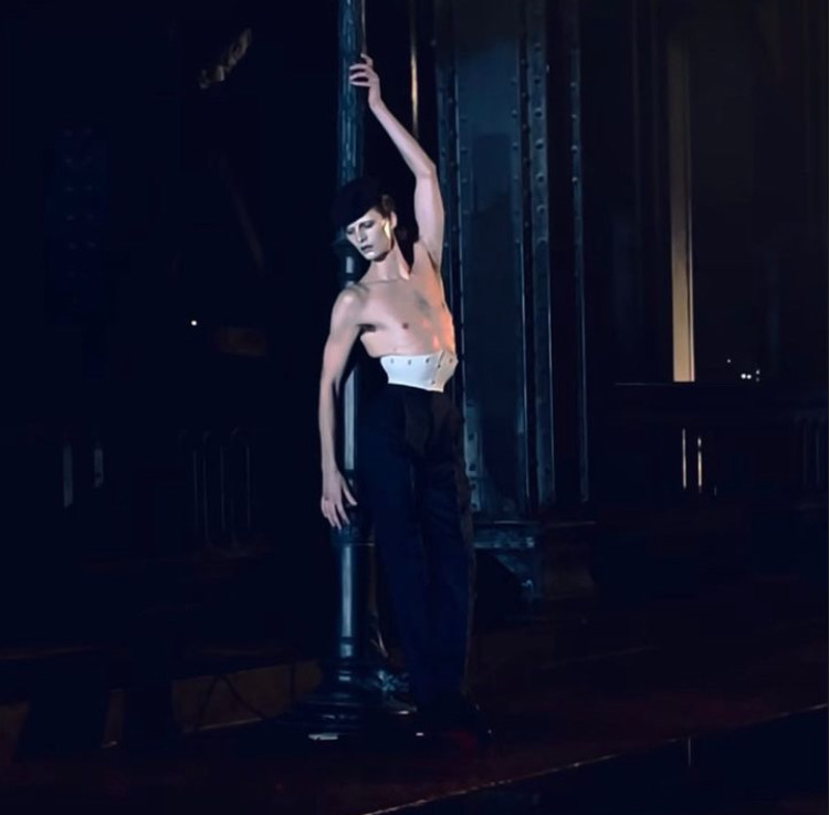 The spectacle, which took us to the realm of Galliano’s imagination, started with a presentation of Freddie Mercury’s doppelgänger, French musician Lucky Love, and a gospel chorus, followed by a Brett Lloyd film noir that transitioned to the main show. As Leon Dame dramatically walked through a covered warehouse under the Pont Alexandre III in a black beret, tuxedo pants, and an ultra-tight white corset with Adele’s “Hometown Glory” in the background, other figures joined the magnetic performance. Inspired by the underworld of Parisian nightclubs and streets of the 1920s and ’30s, Galliano explores the ritual of dressing, using the models’ bodies as his canvas.