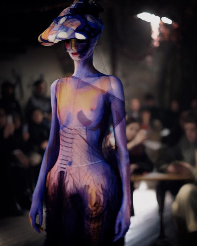 With plenty of room to innovate and impress, the label also collaborated with Christian Louboutin, reworking the signature Margiela tabis and creating slip-on pumps, some even with the iconic red Louboutin sole. In this sense, the past, present, and future came together in an intimate yet explicit journey that sometimes revealed too much. As eerie as it was revealing, models with bouffant hairstyles or hats hiding in the dark and transparent watercolor tulle illusion gowns – inspired by Dutch Fauvist painter Kees Van Dongen – revealing pubic hair created the perfect antithesis.