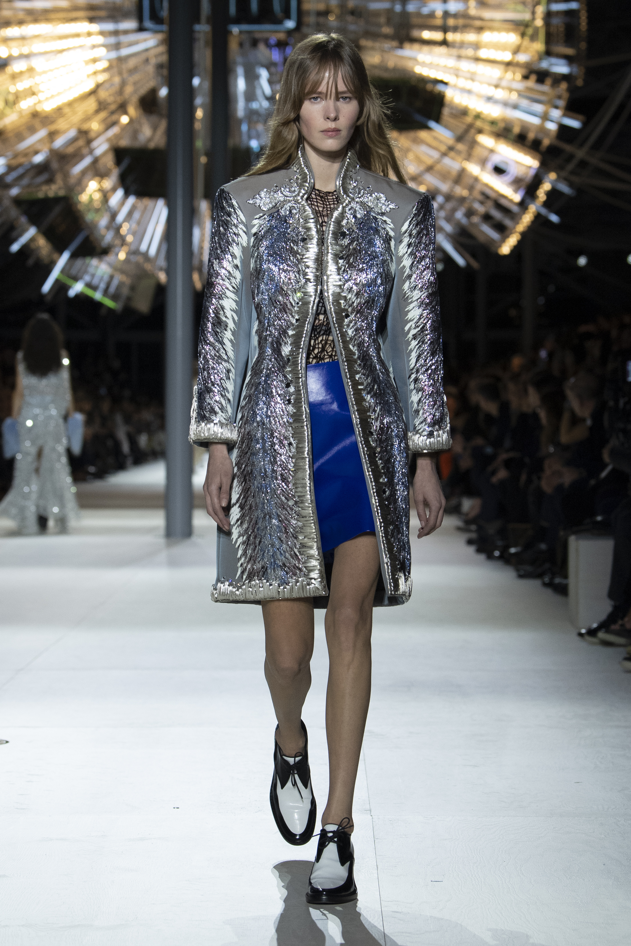 The collection was presented in the Cour Carée at the Louvre, the same location where Ghesquière made his dramatic debut for the brand ten years ago. The show took guests back to the future, as models sauntered down a grand runway in avant-garde silhouettes resplendent with regal rococo decorations.