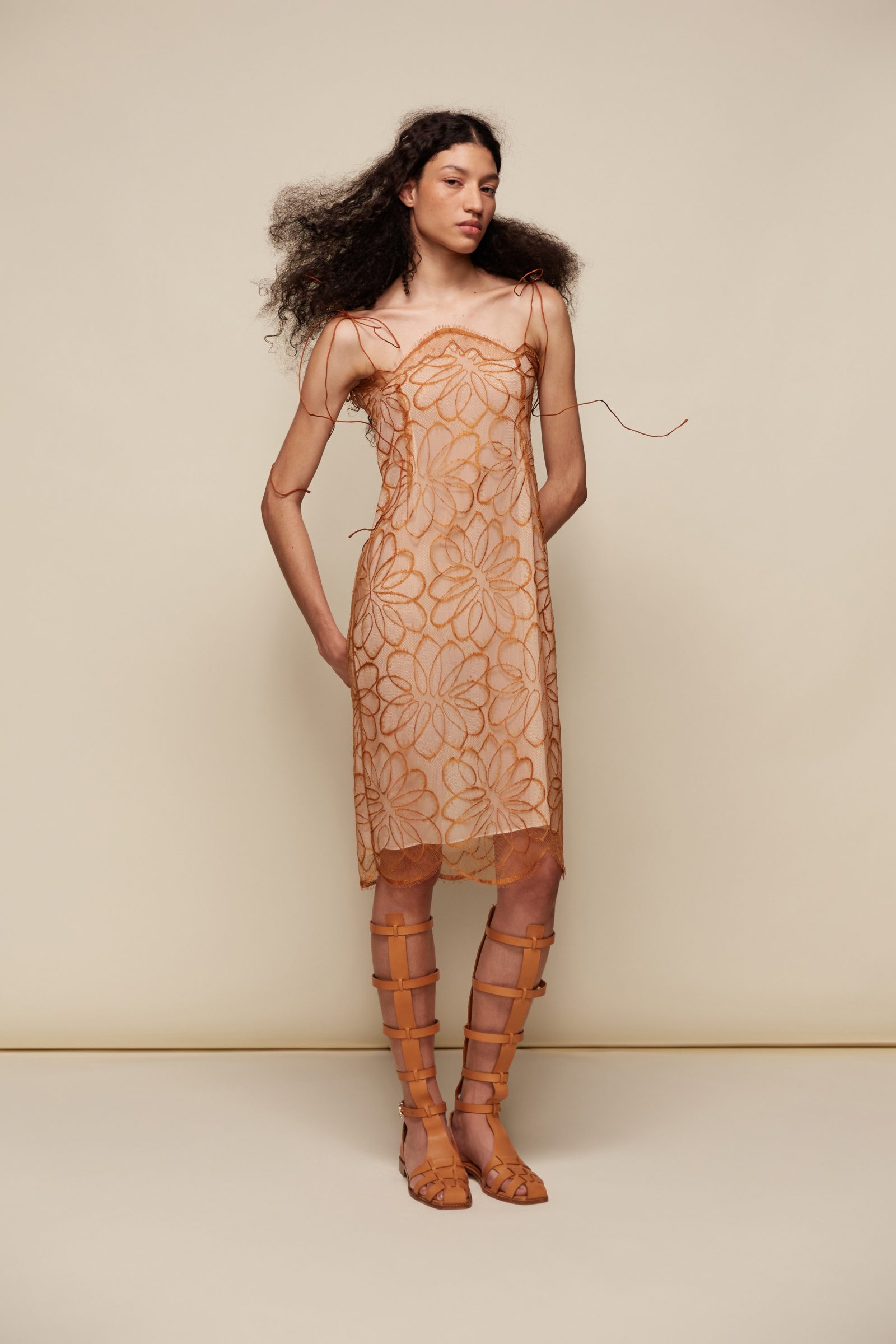 In homage to Marcel Rochas' innovative beach accessories of the 1940s, the collection featured unexpected textures and materials. A standout piece was a rust-colored dress with an intricate, almost organic texture reminiscent of sea-weathered surfaces. The dress's form seemed to undulate like waves, its rich hue contrasting beautifully with the model's blue heeled sandals.