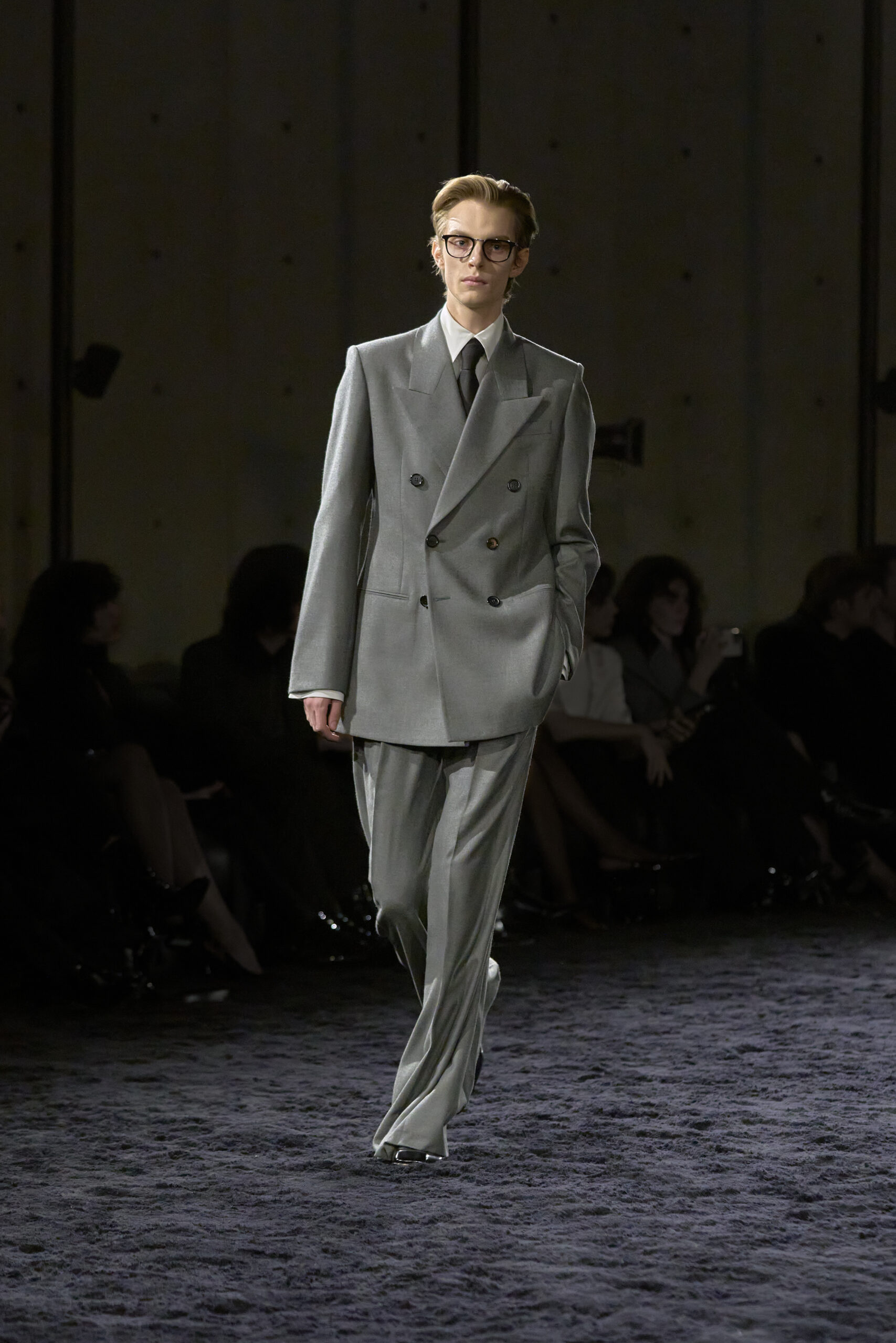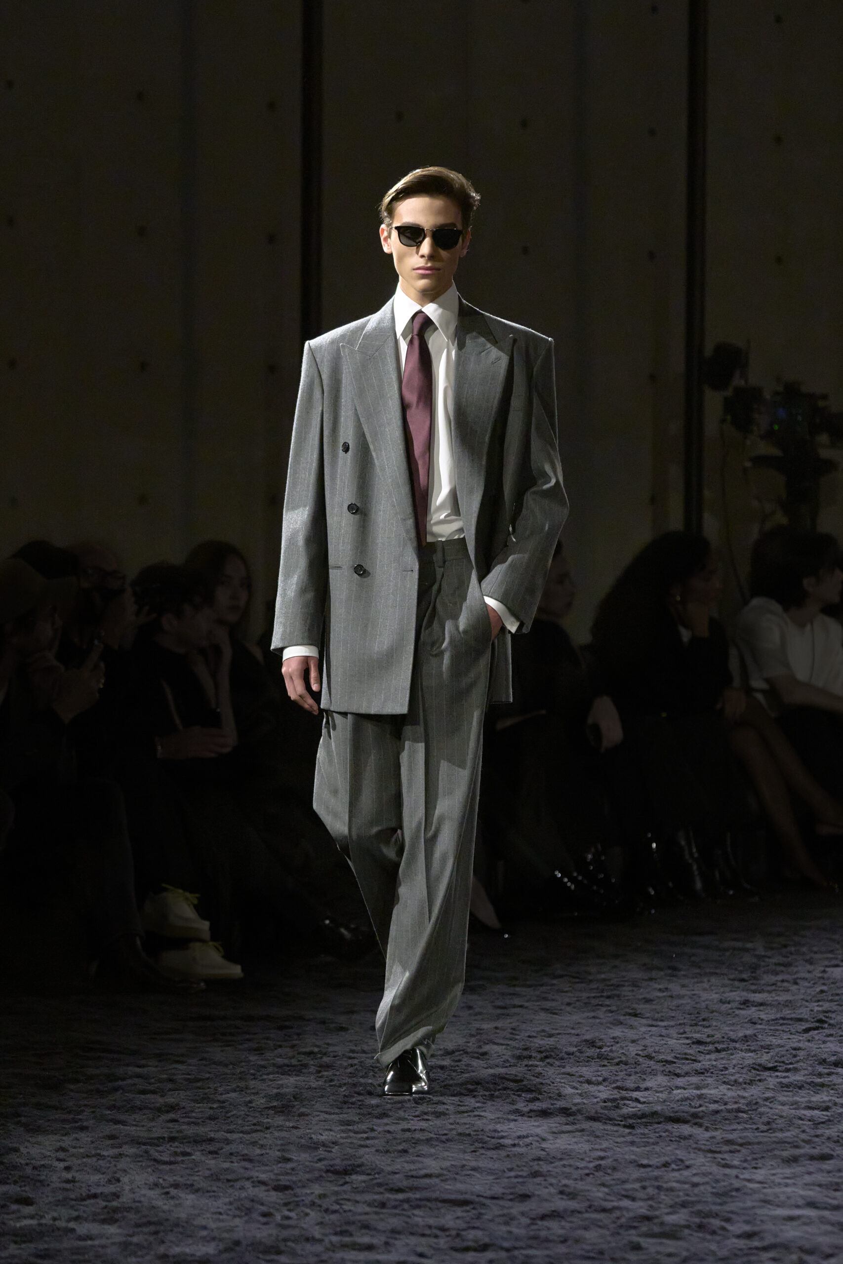 The show commenced with an unmistakable nod to the boxier silhouettes of the 1980s, echoing the era’s signature power dressing with double-breasted suits, resolute peak lapels, and assertive pinstripes. Yet, this was thankfully no pastiche; it was a reinvention. As the parade of models began, the rigid lines of formality unraveled, introducing a fluidity and ease. The suits, while loose-fitting, were far from lax; they whispered of elegance through their precision and fluid motion.