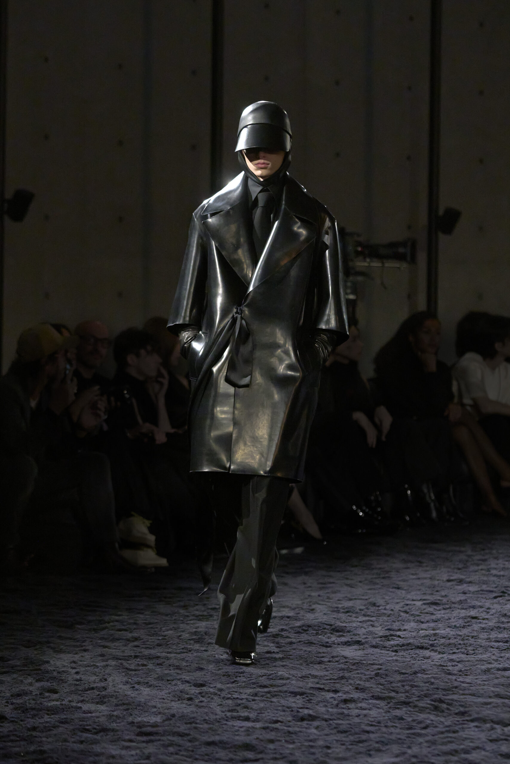 The collection revels in texture and structure, from the lustrous sheen of satin lapels to the intricate construction of wrap peacoats. Leather silhouettes—cut with precision—ushered in a bold yet streamlined profile, as exemplified by a standout piece: a rubber peacoat with a leather hat, a masterful reinterpretation of a 1960s archival gem.