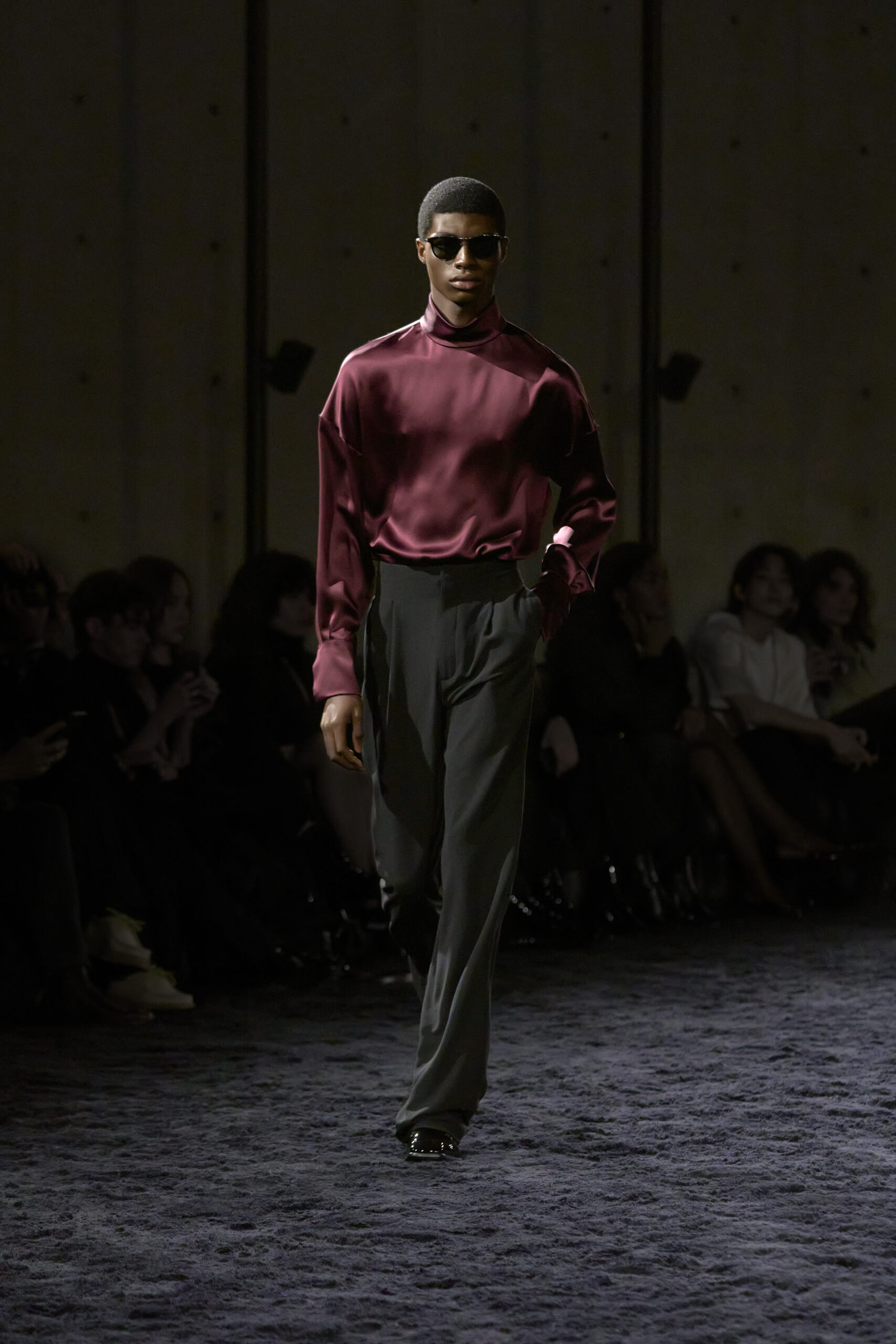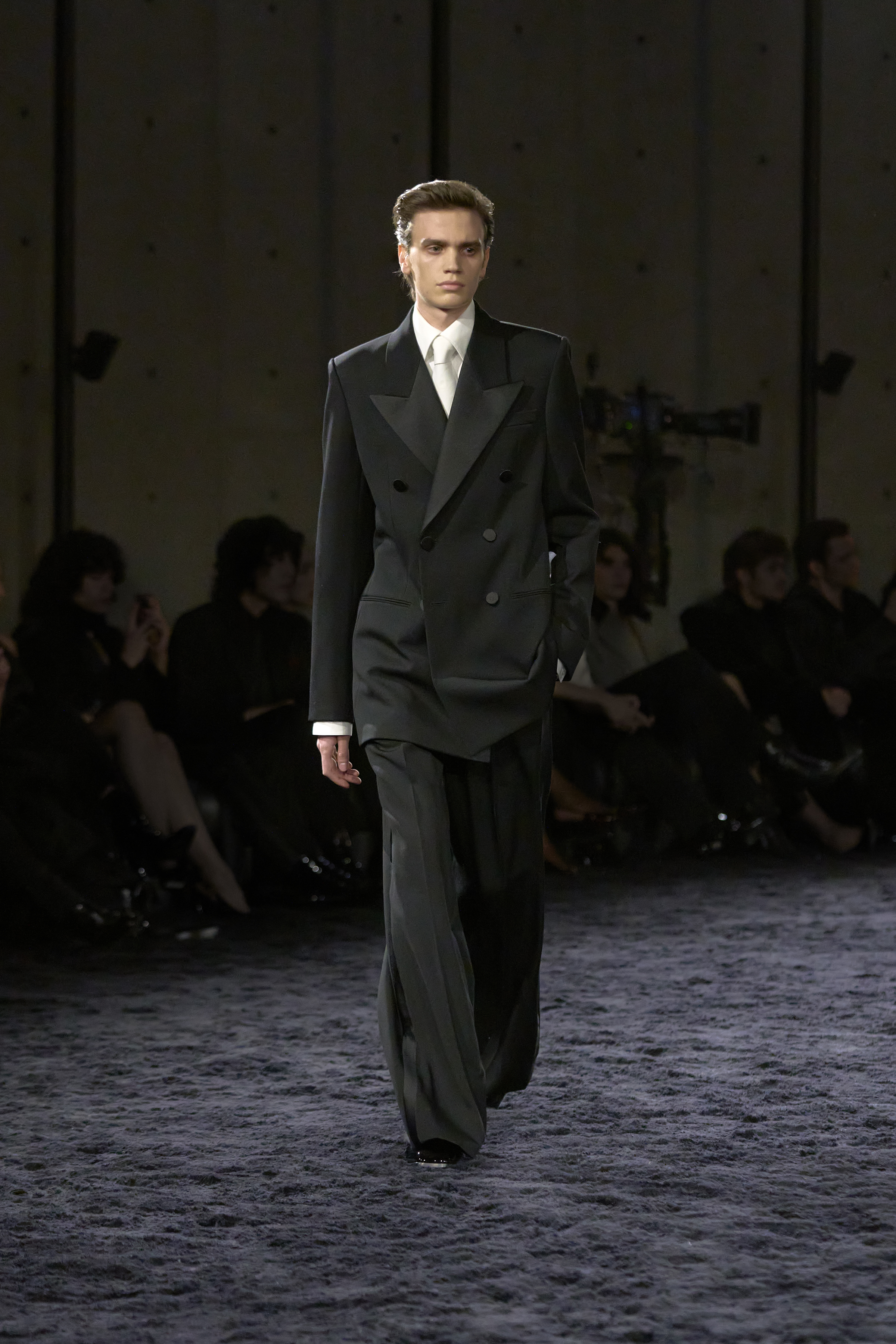 Elsewhere in the show, the liquid-like drape of crepe georgette jackets with their satin linings glistened beneath the runway lights, billowing as if the fabric itself was in mid-transformation, much like the recently unveiled women’s collection, blurring the lines between the tangible and the ephemeral.