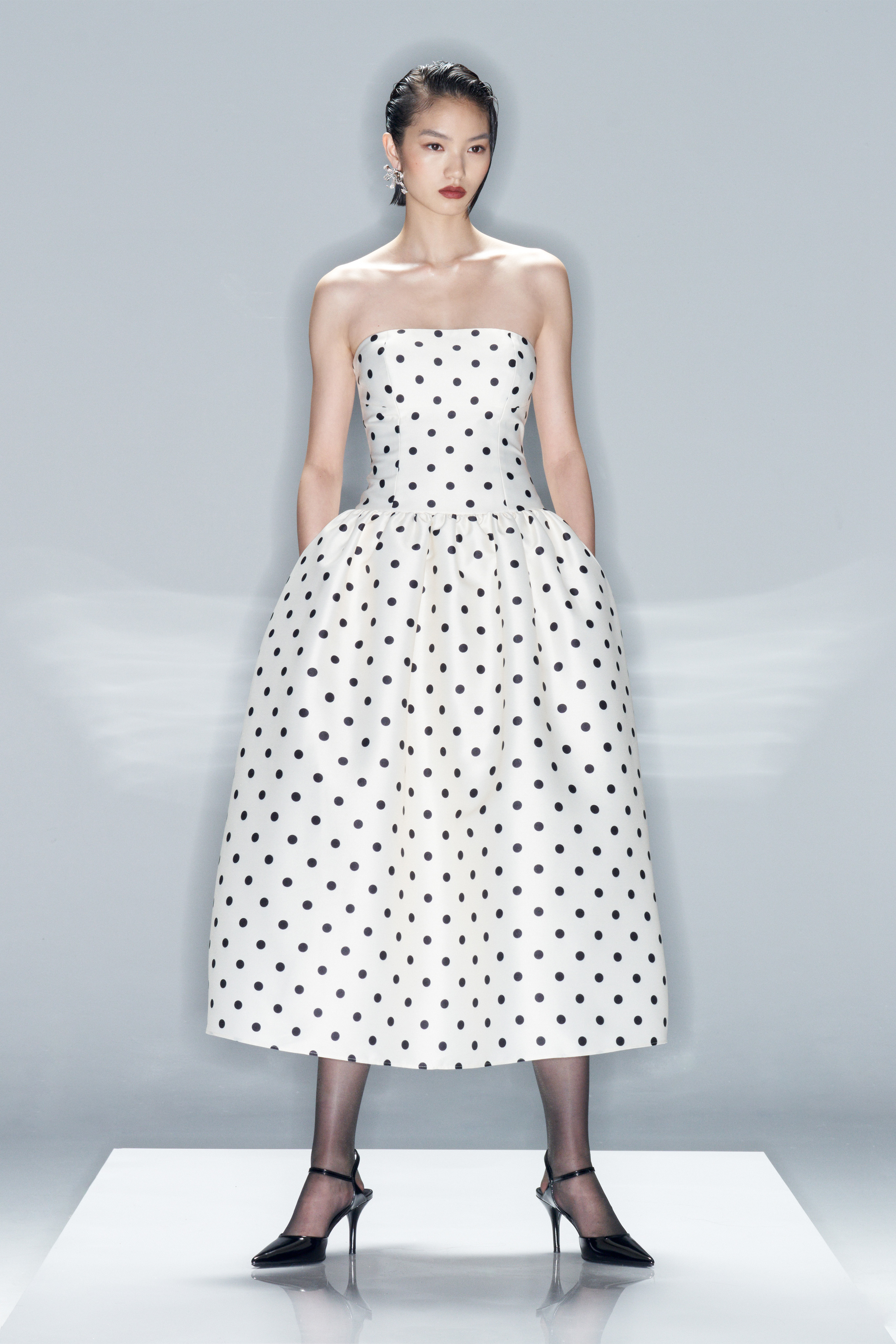 Signature lace styles are reenvisioned with floral motifs, contrasting bows, and ribbon details, alongside angular crystal buttons. The eveningwear segment stuns, featuring ethereal lightweight lace in tuxedo-inspired dresses, mesmerizing black velvet gowns with daring cut-out bodices, and glistening transparent sequined and taffeta dresses. Pastel mini dresses in satin boast embellished trims, while rhinestone-embellished gowns feature high necklines and flared sleeves, illustrating the collection’s flair for merging classic and contemporary styles.