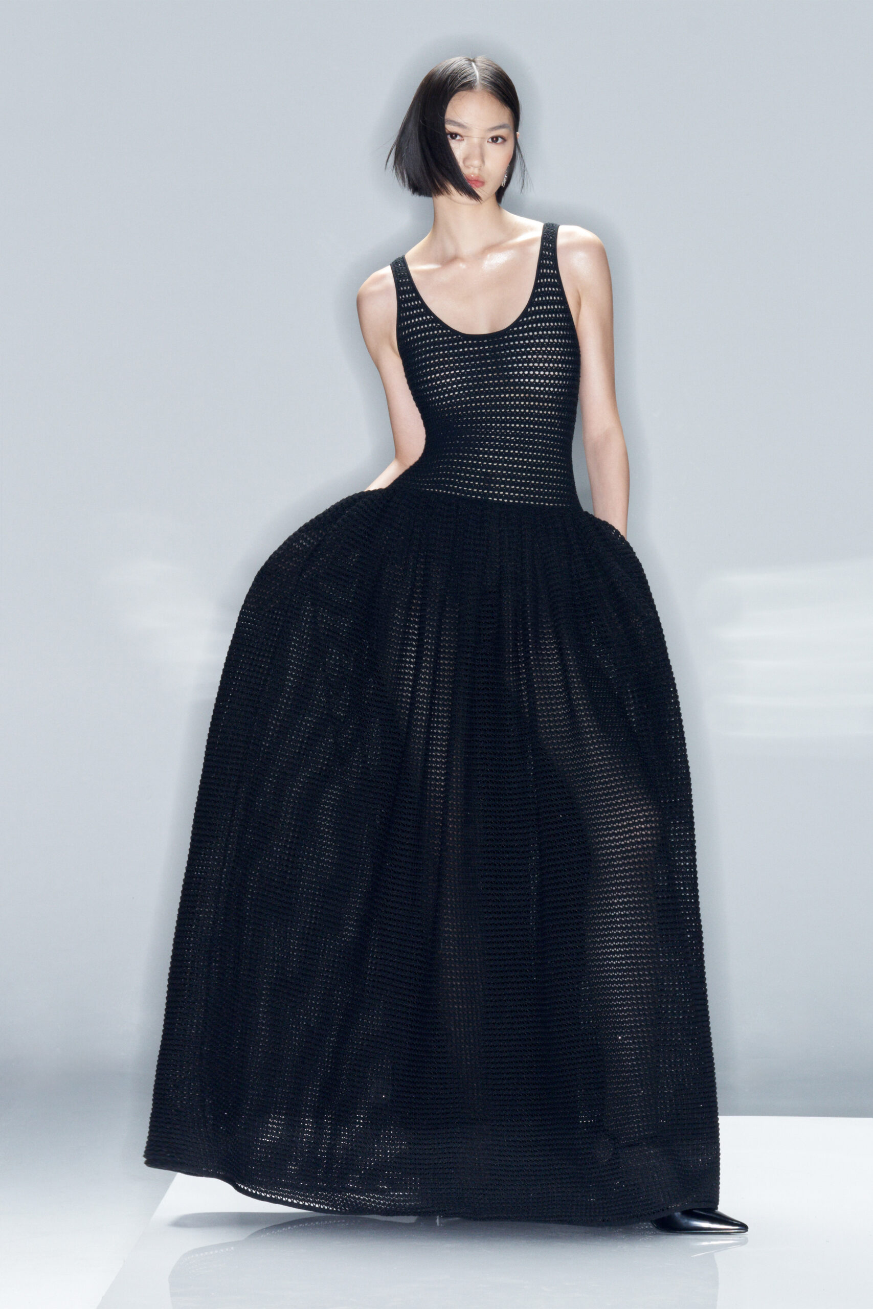 Knitwear reimagines uniform elegance with a unique twist, exalting cream knit styles adorned with peplums and crystal buttons, and striking monochrome sets framed by exaggerated sailor collars, each piece enhancing comfort and style. The introduction of a ribbed shirt dress and new fabric developments highlight the brand’s innovative approach to design, while denim sees new cuts and shapes.