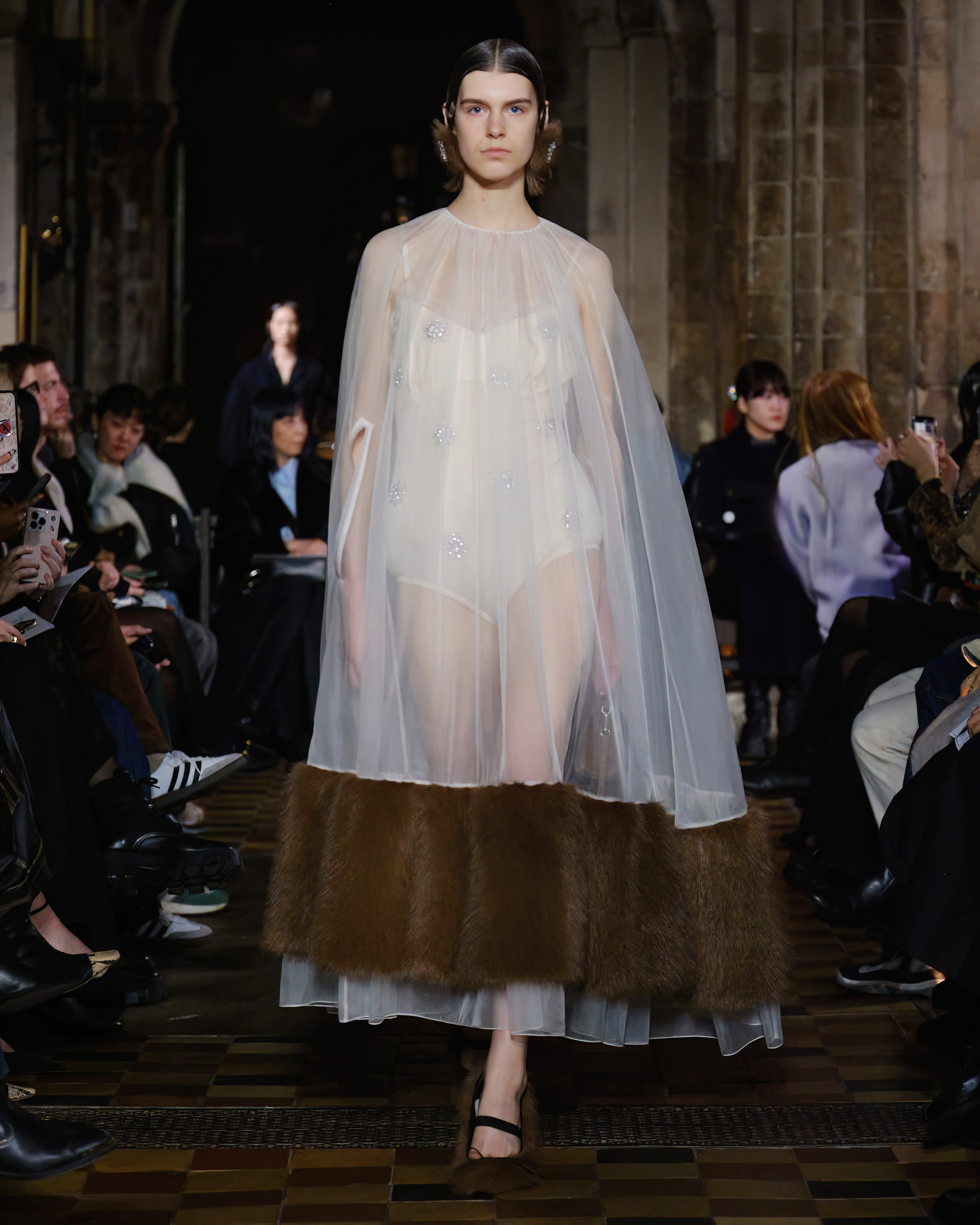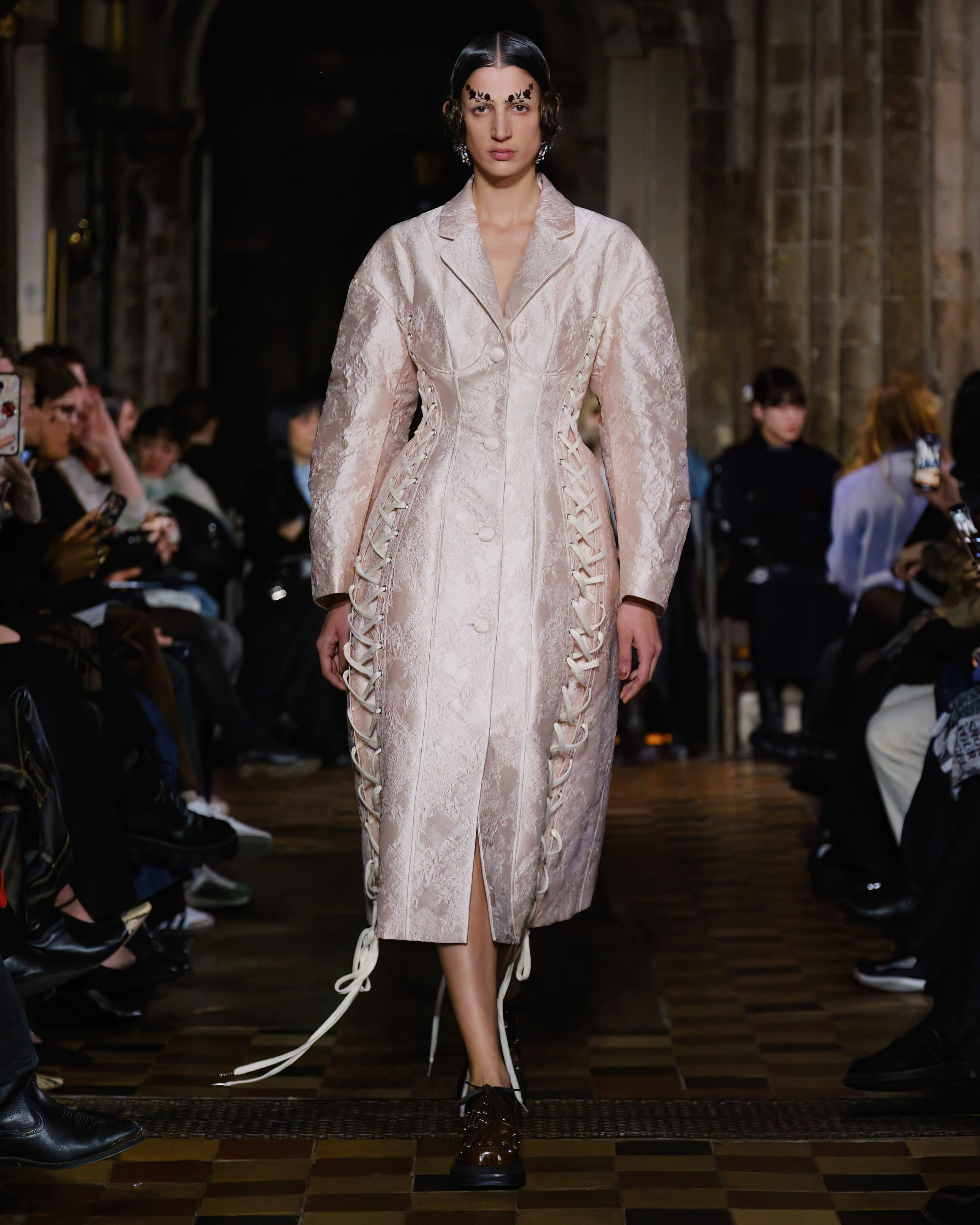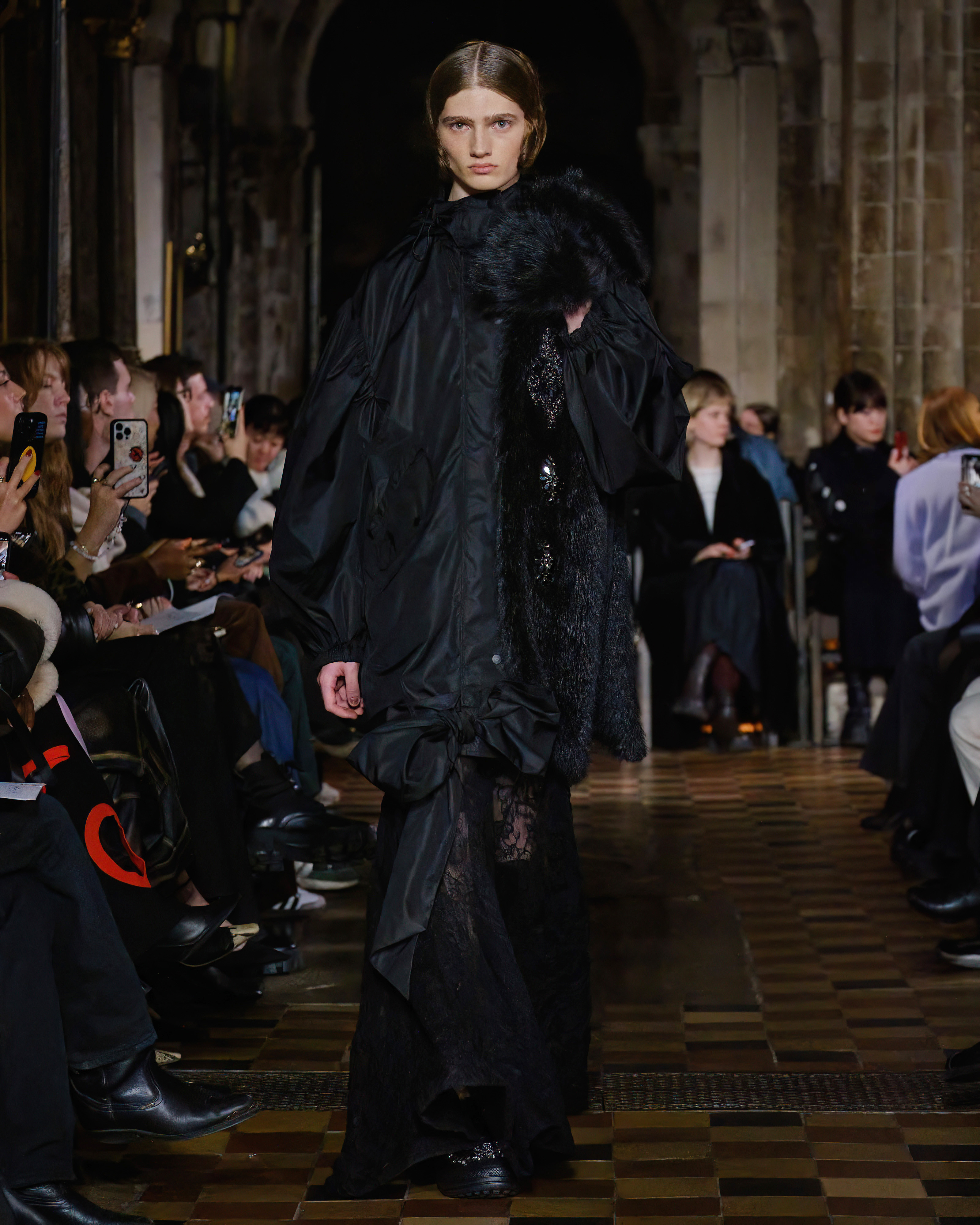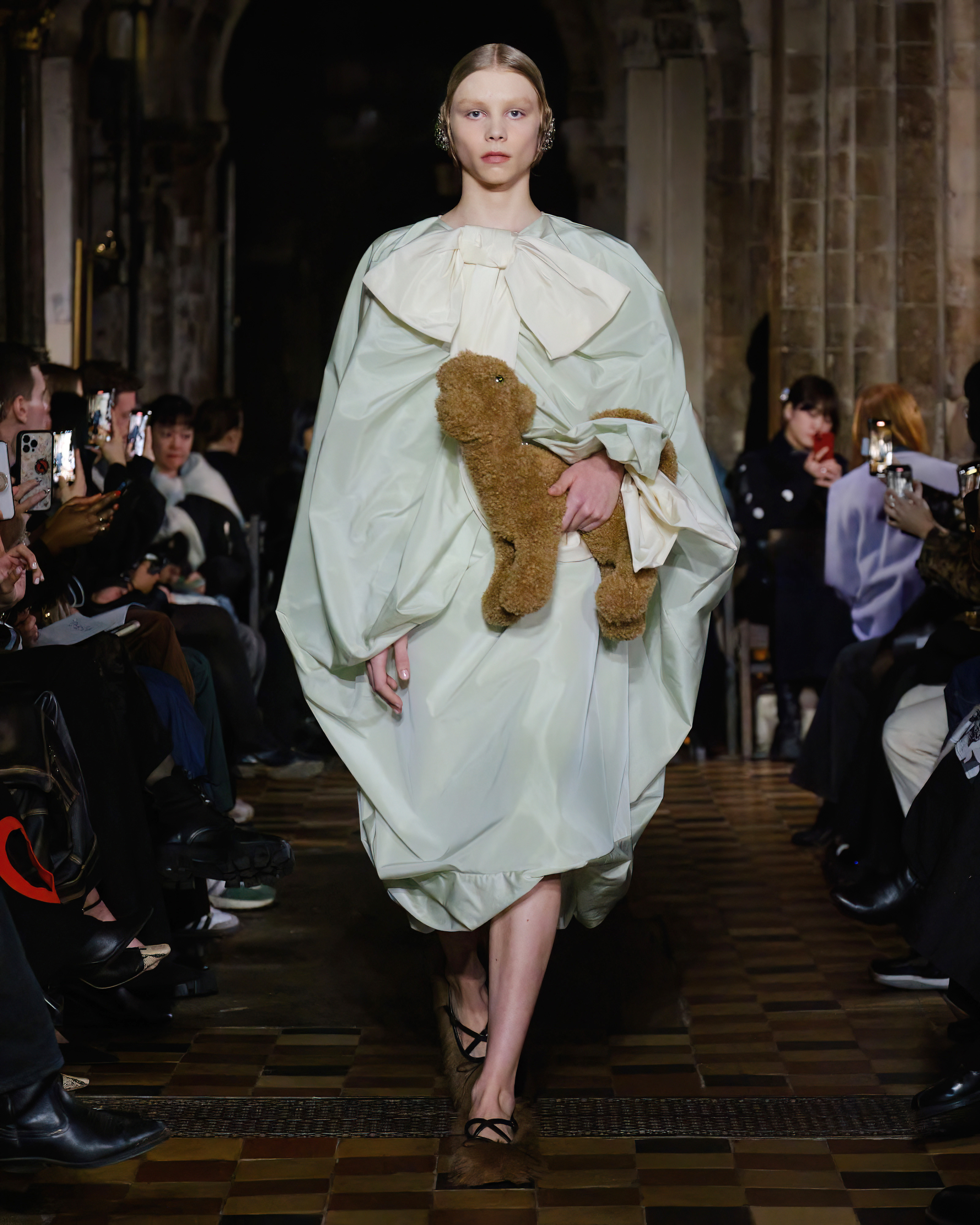 Shortly after hosting her couture show for Jean Paul Gaultier, Simone Rocha has returned to London to present her Autumn/Winter 2024 Collection. Locating the show in Bartholomew’s Church in London, Rocha is presenting an ode to her Catholic heritage that influences her work so greatly as the backdrop to the collection.