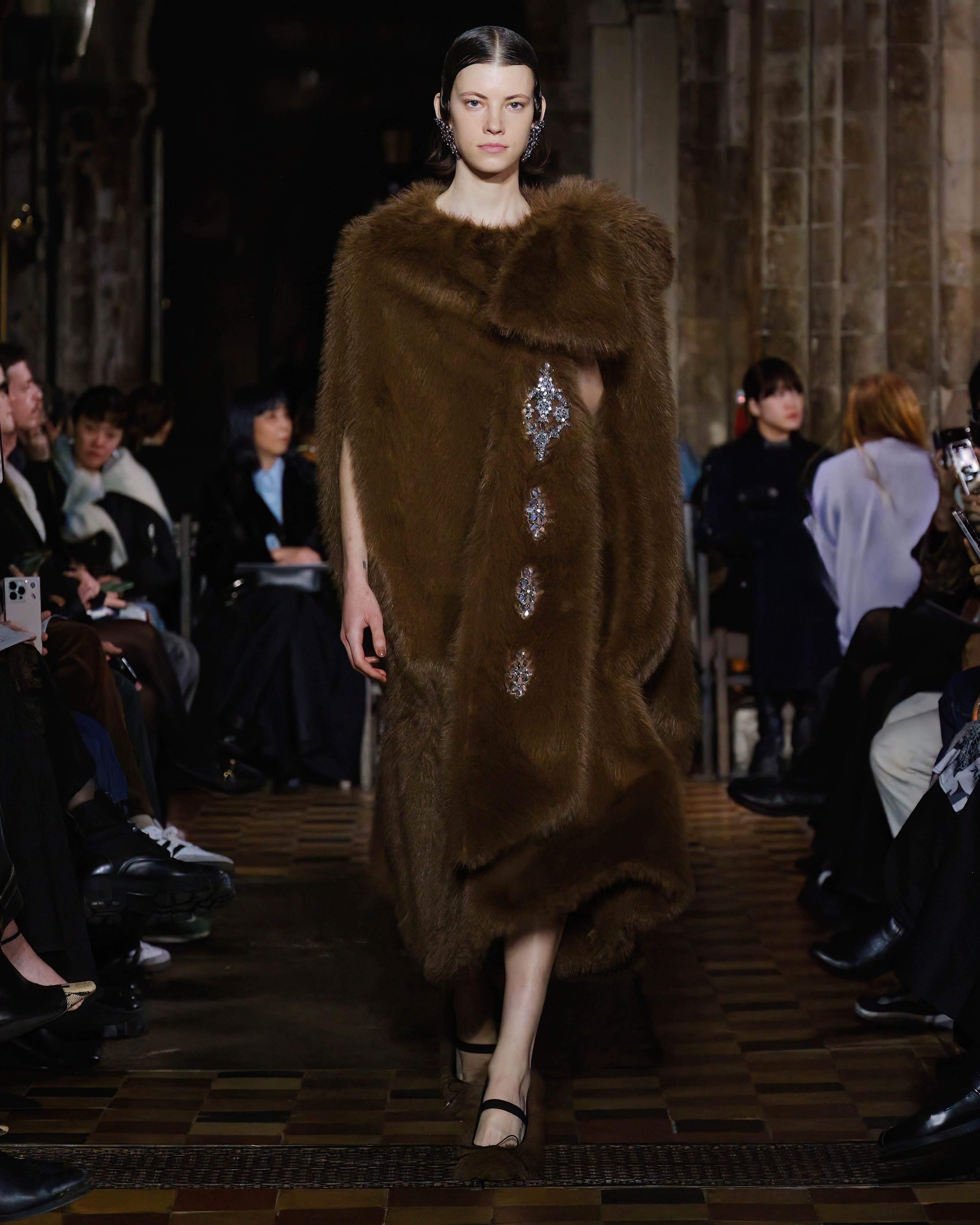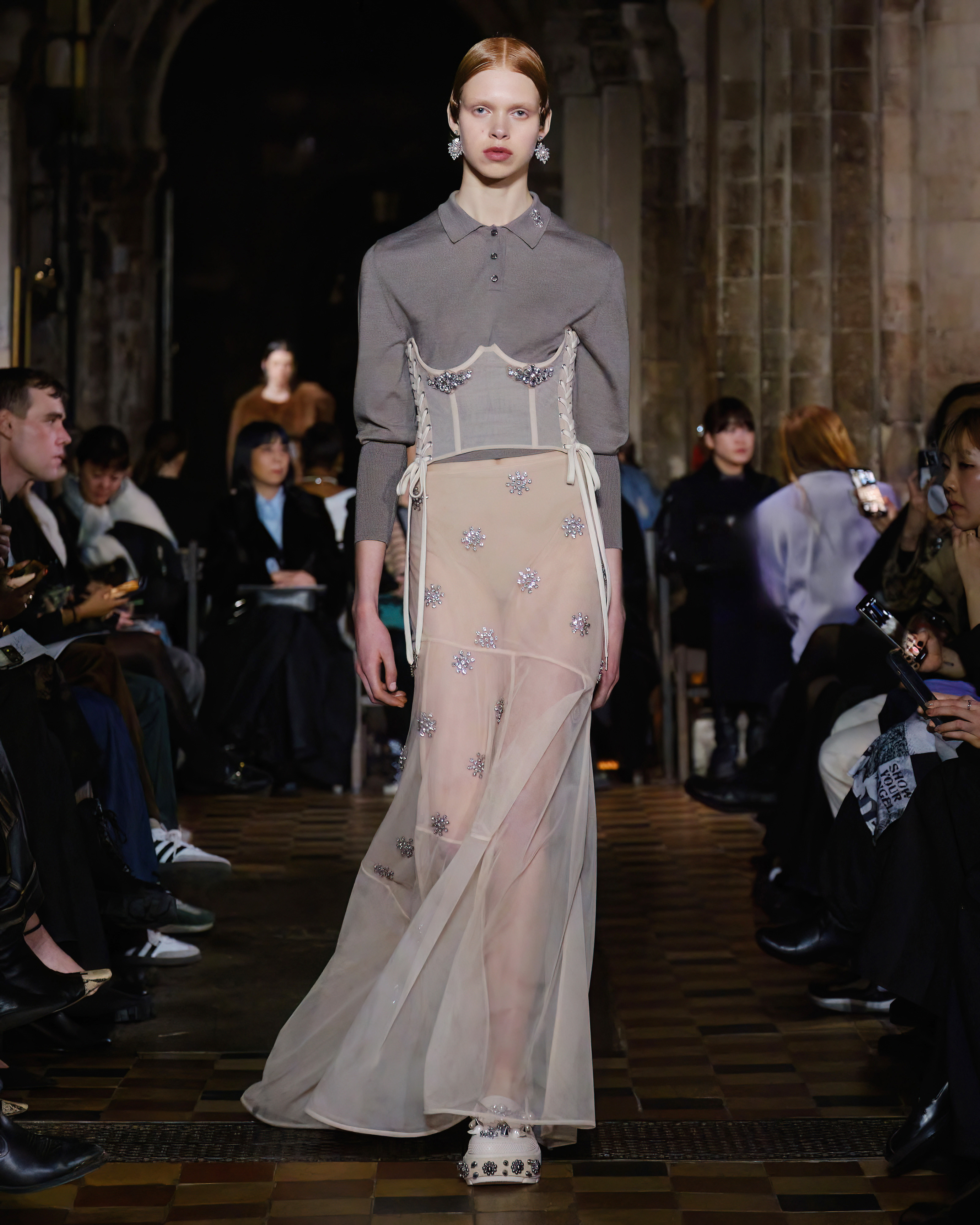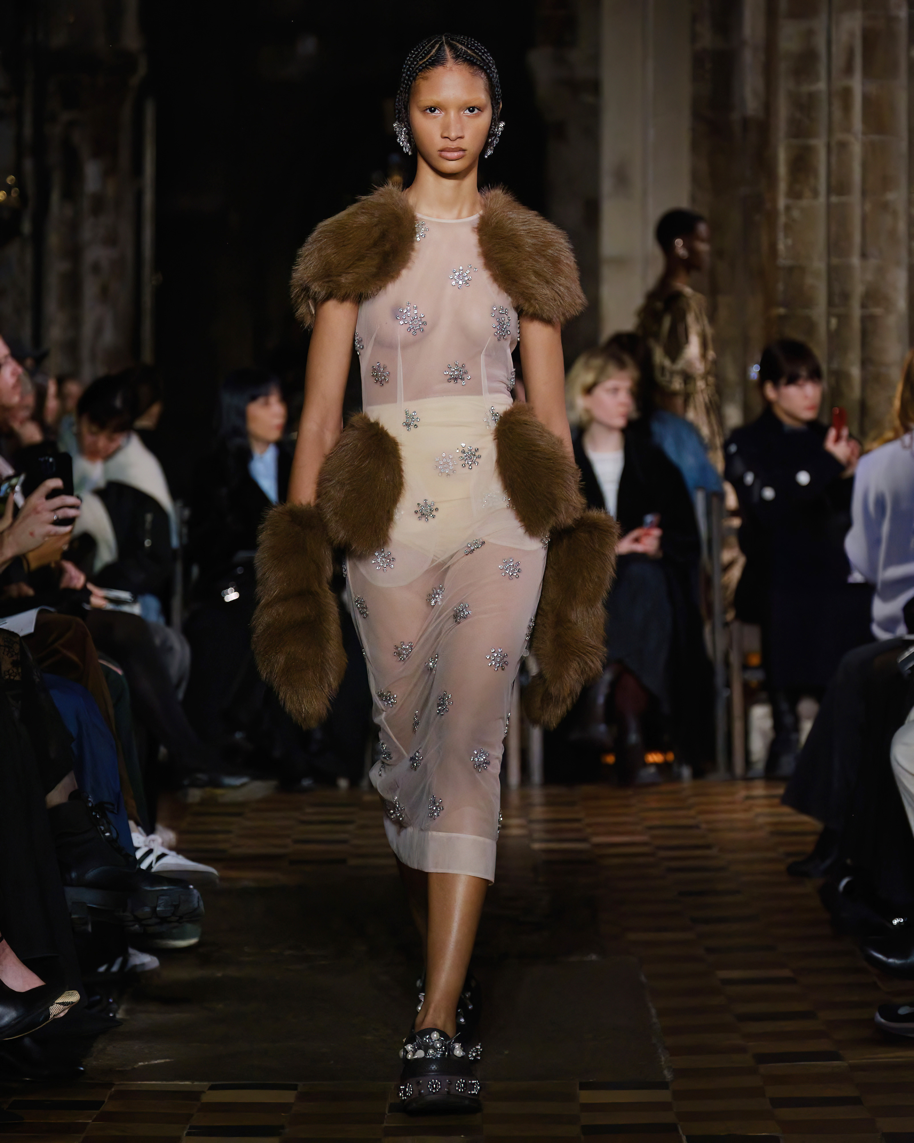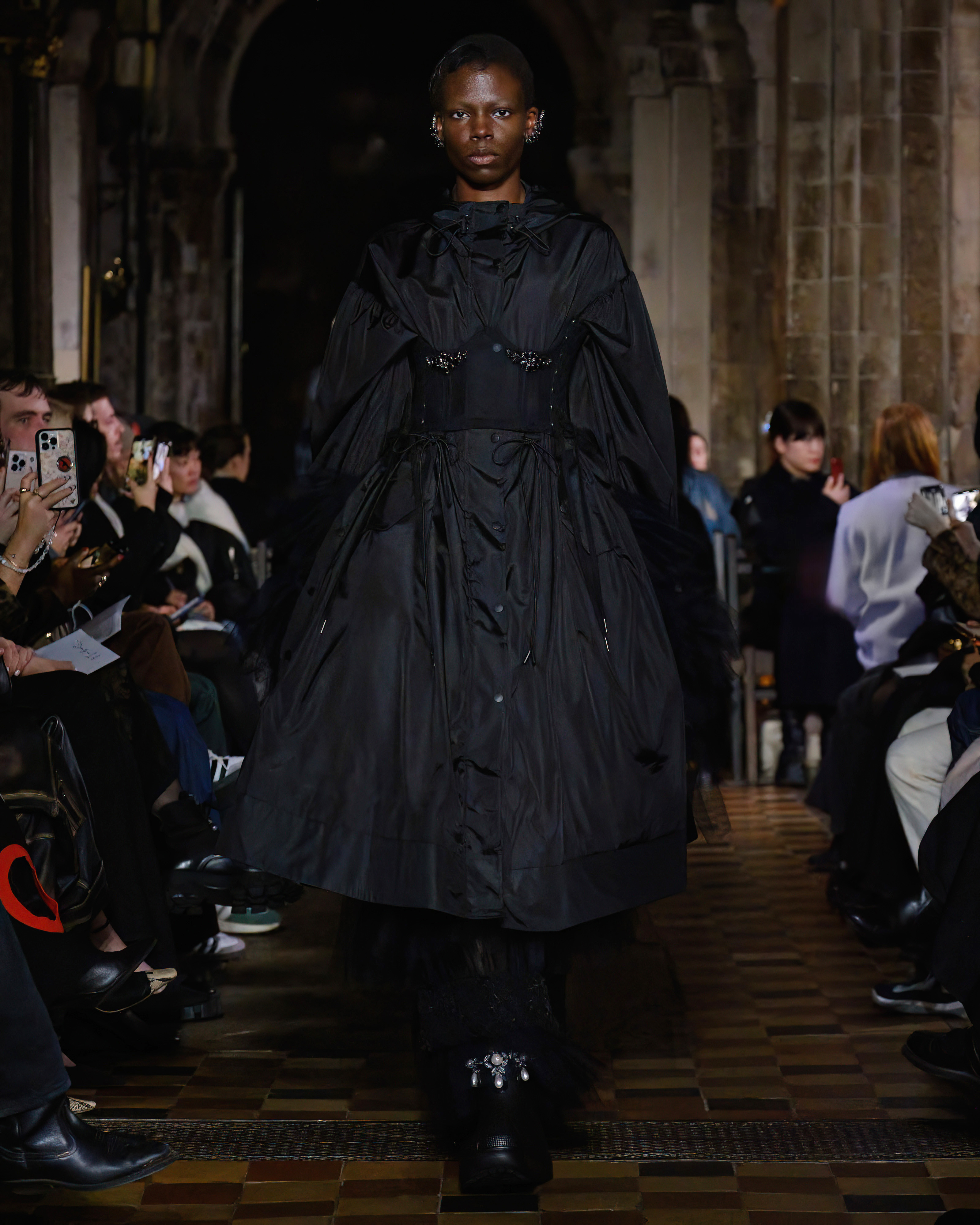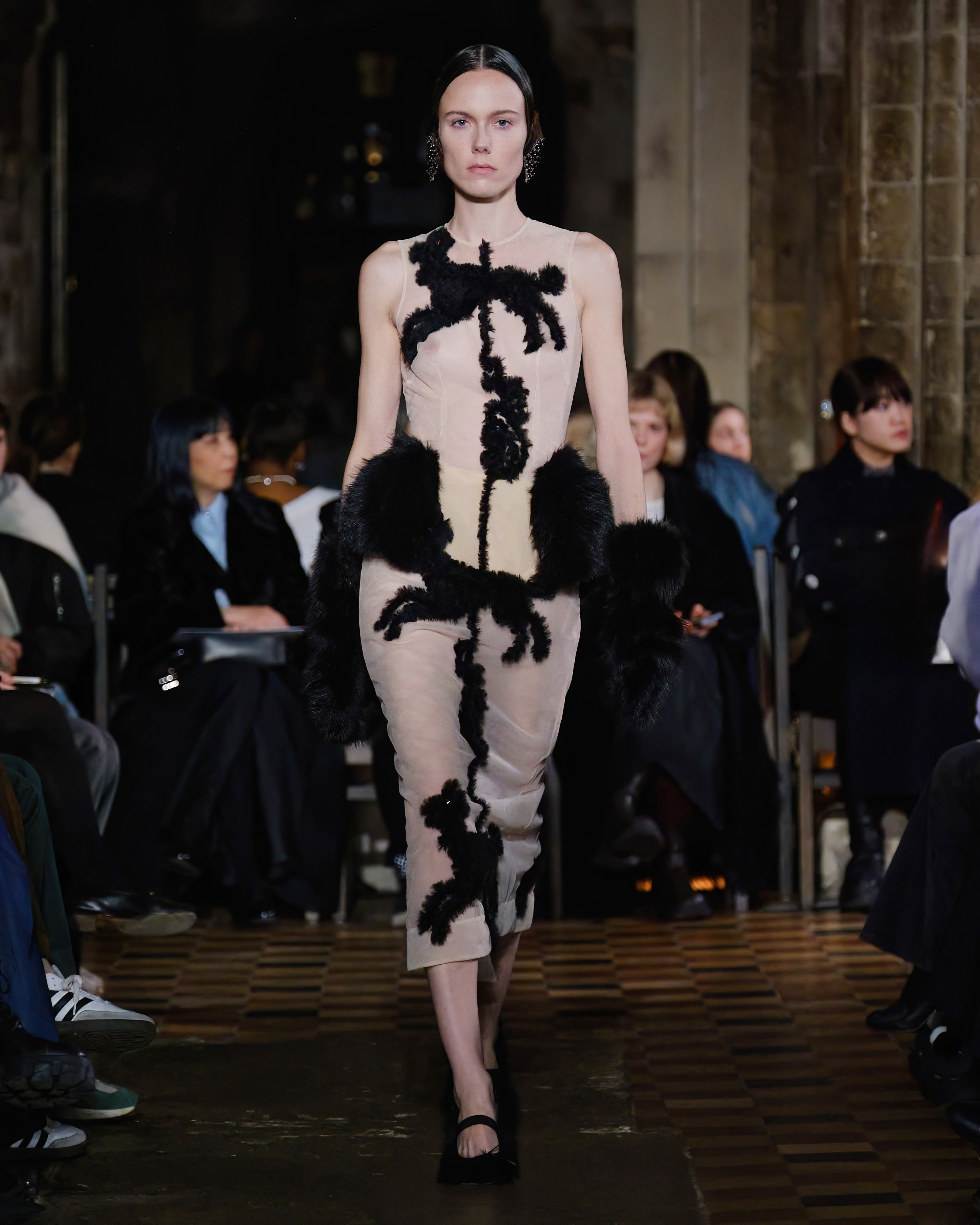 Shortly after hosting her couture show for Jean Paul Gaultier, Simone Rocha has returned to London to present her Autumn/Winter 2024 Collection. Locating the show in Bartholomew’s Church in London, Rocha is presenting an ode to her Catholic heritage that influences her work so greatly as the backdrop to the collection.