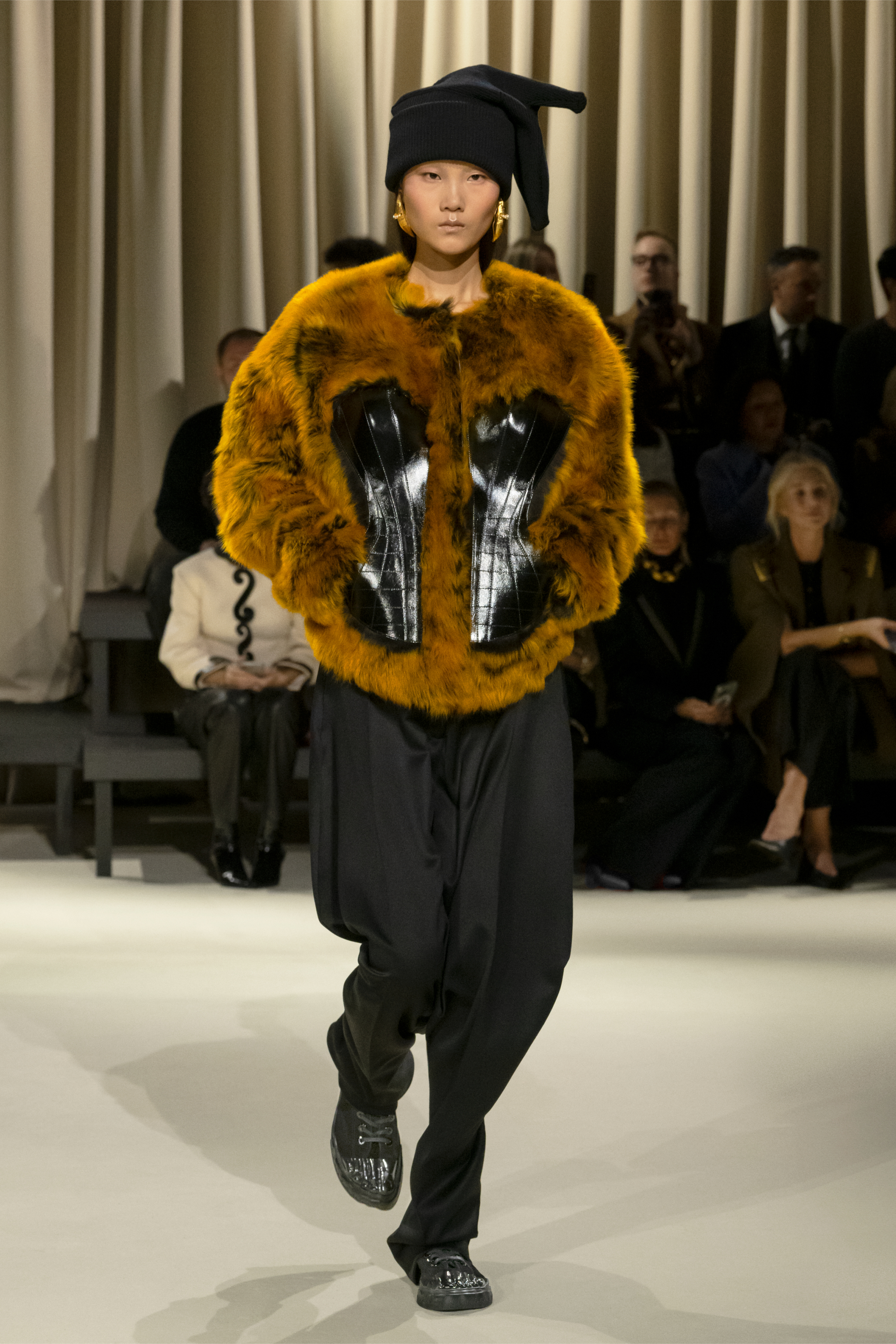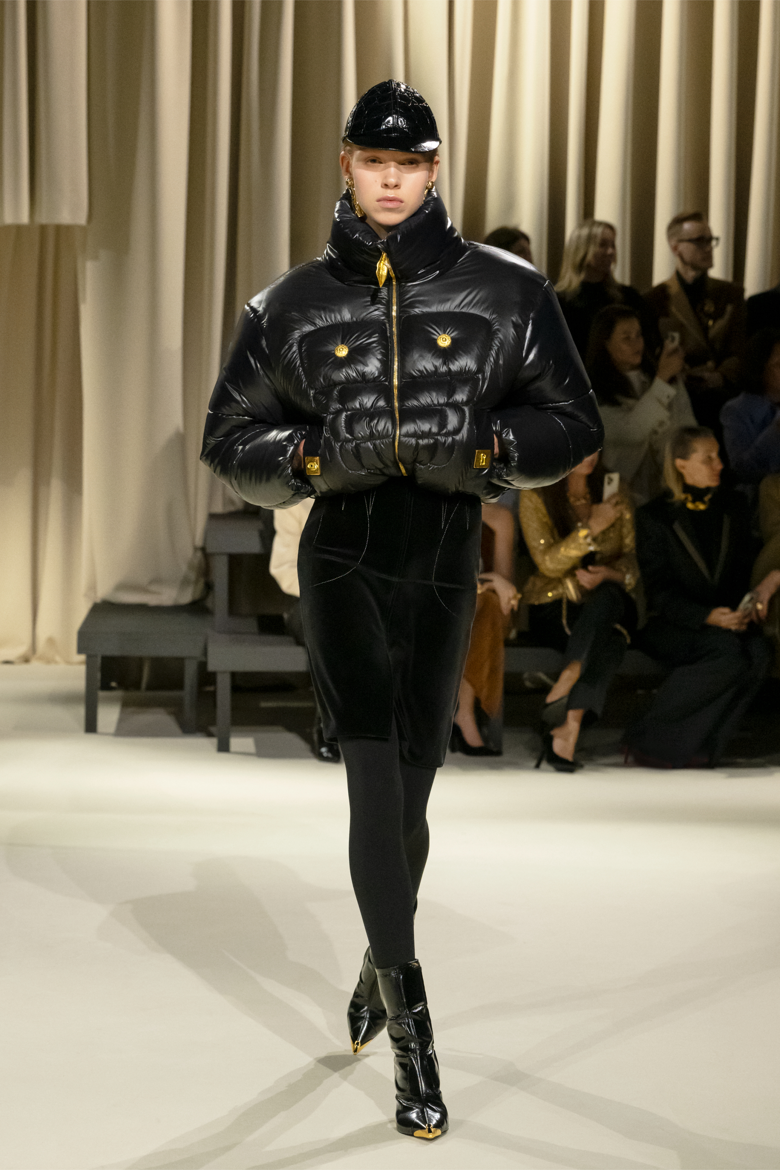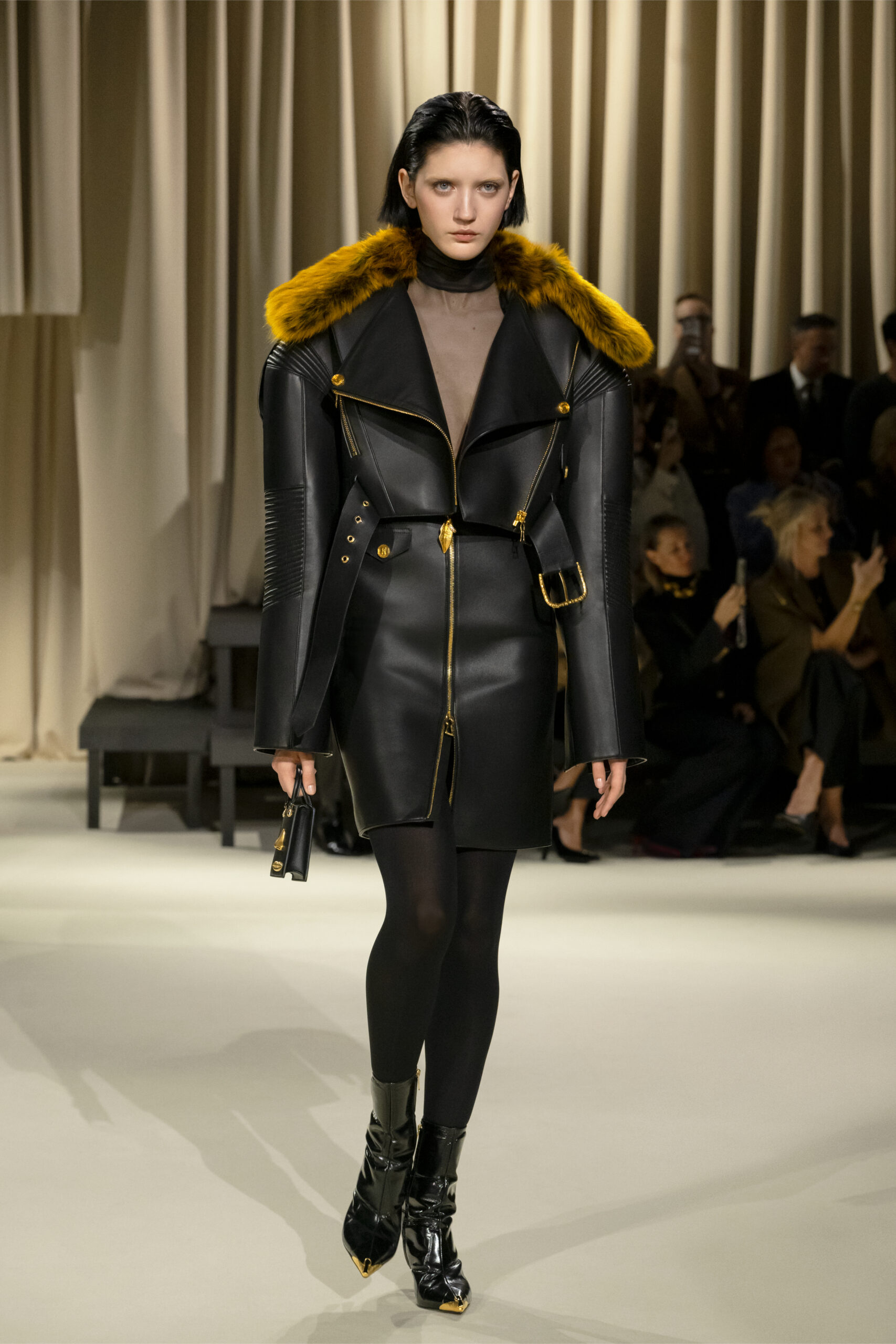 Meanwhile, Roseberry introduced a bold black puffer that was distinctly ‘of the moment,’ tastefully adorned with nipple buttons and a six-pack ab design. Roseberry demonstrated the versatility of faux fur by pairing it, in an elegant fox hue, with leather and denim alike. He also proposed masterful modern interpretations of the classic silhouette through a pair of timeless black and white evening dresses that marked an aesthetic departure from the rest of the collection but seemed to have leaped off the screen of an Audrey Hepburn film.