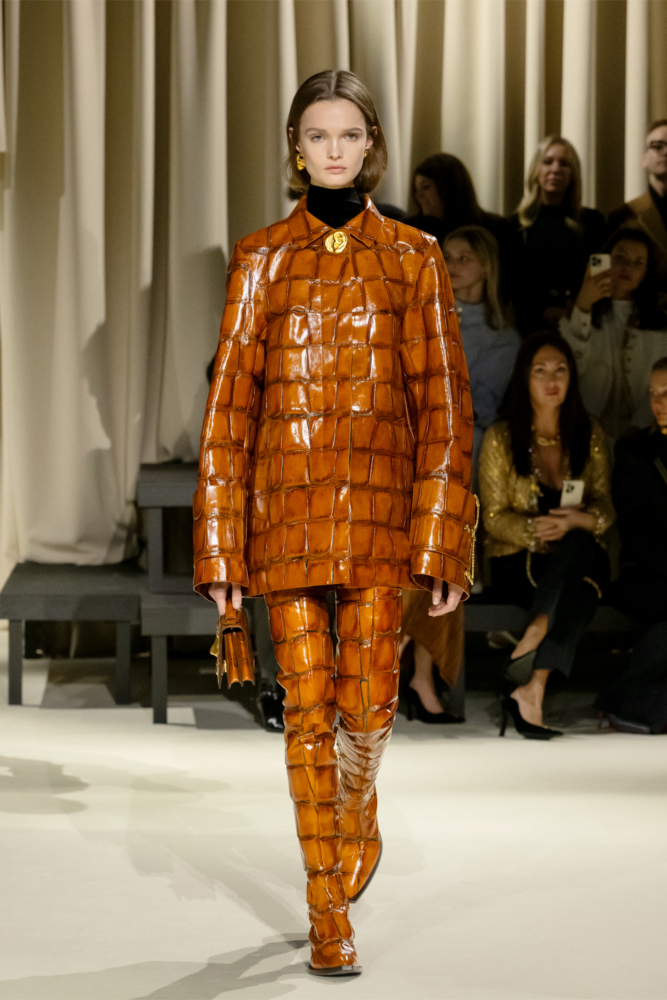 Schiaparelli’s Fall/Winter 2024/25 Ready-to-Wear show was defined by impeccable detail; Daniel Roseberry continued his streak of stellar collections by crafting a complete wardrobe that brought luxurious touches of haute couture to the ready-to-wear runway. Roseberry demonstrated that he is a master of all materials – from faux fur to crocodile to the denim that references his Texas roots and has dominated the catwalk in recent seasons. He wove a cohesive story that moves from sporty mornings to glamorous nights. Athletic-style loungewear, fierce leather jackets, and shimmering evening dresses were all presented with a certain je ne sais quoi that hewed closely to Schiaparelli’s DNA while maintaining a modern sensibility.
