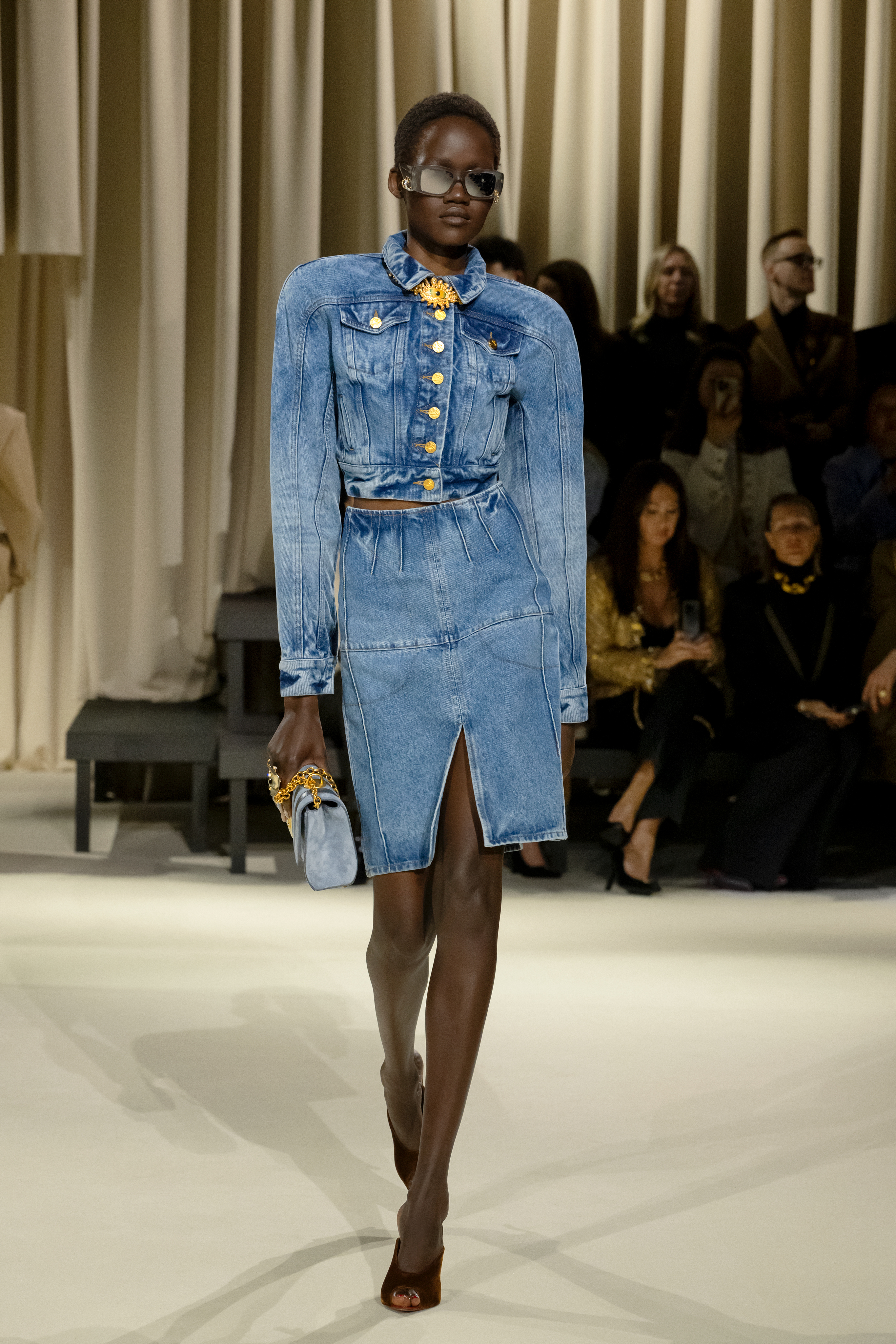 Roseberry evidently takes great delight in designing the details of each piece. Buttons were protagonists of the collection, spelling “Schiap” on a double-breasted navy peacoat, and bringing the signature Schiaparelli key and ear leitmotifs to a variety of garments. Schiaparelli has been intimately connected to surrealism since its founder collaborated with Salvador Dali, a theme that Roseberry has enthusiastically embraced. This season, gilded lips adorned a belt buckle, a jeweled face smirked from the cuff of a leather jacket, and trompe de l’oeil toes encased a pair of simple black boots. Circular gold medallions on leather jackets recalled ancient coins (and the glory of ancient empires); the embroidery on a casual sweater was reminiscent of rococo and Louis XIV.