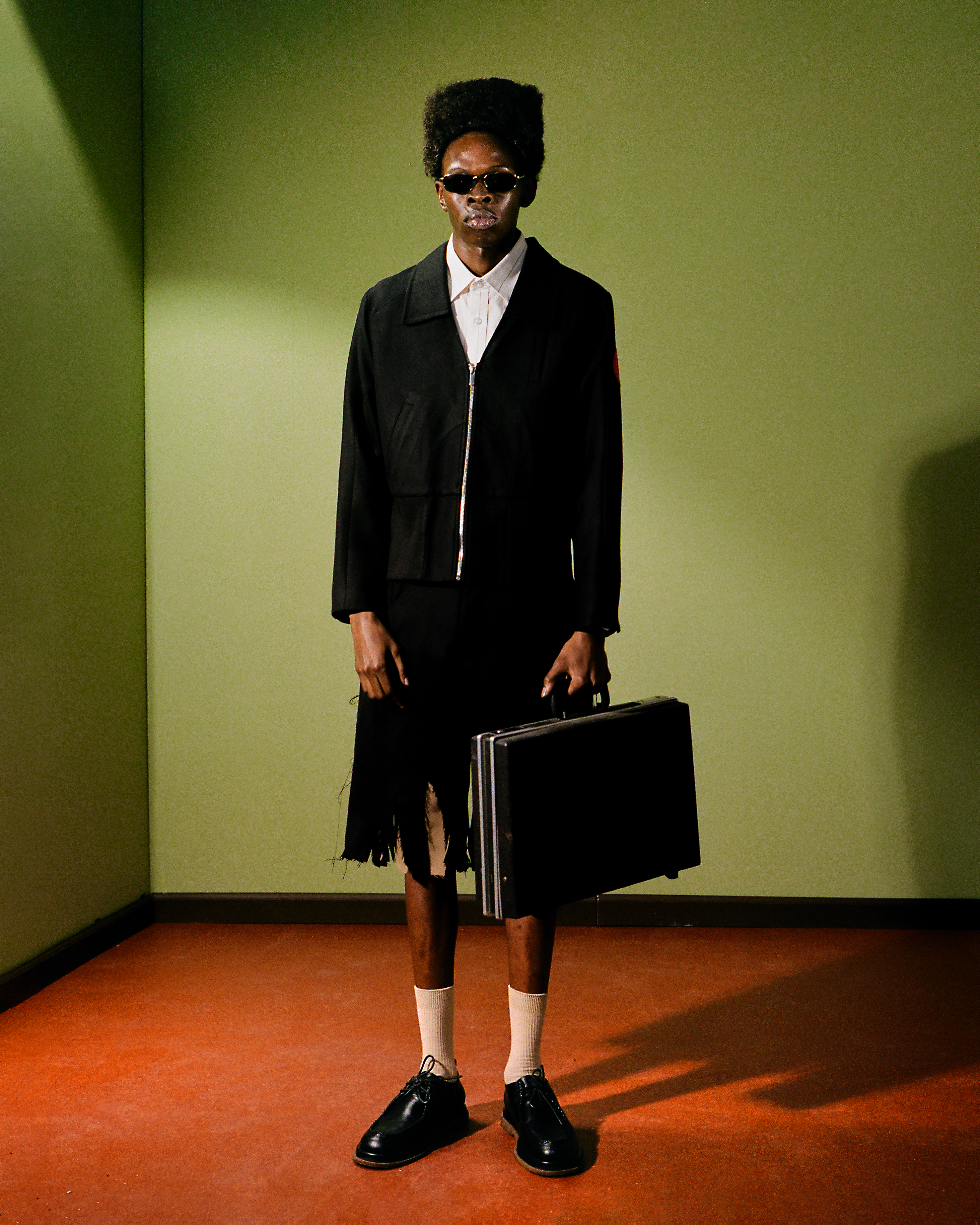 Instead of attempting to pigeonhole the collection within a temporal framework, the viewer is forced to confront a singular narrative that intertwines politics and fashion. They aren’t clothes, they are a study of “the aesthetics of oppression and their psychological implications.” The garments themselves aren’t crazy, but they have a sense of intrigue. The ensembles invoke feelings of uncertainty and mystery. It feels like the oversized trenches harbor a clandestine secret, while the briefcases conceal layers upon layers of inscrutable truths waiting to be deciphered.